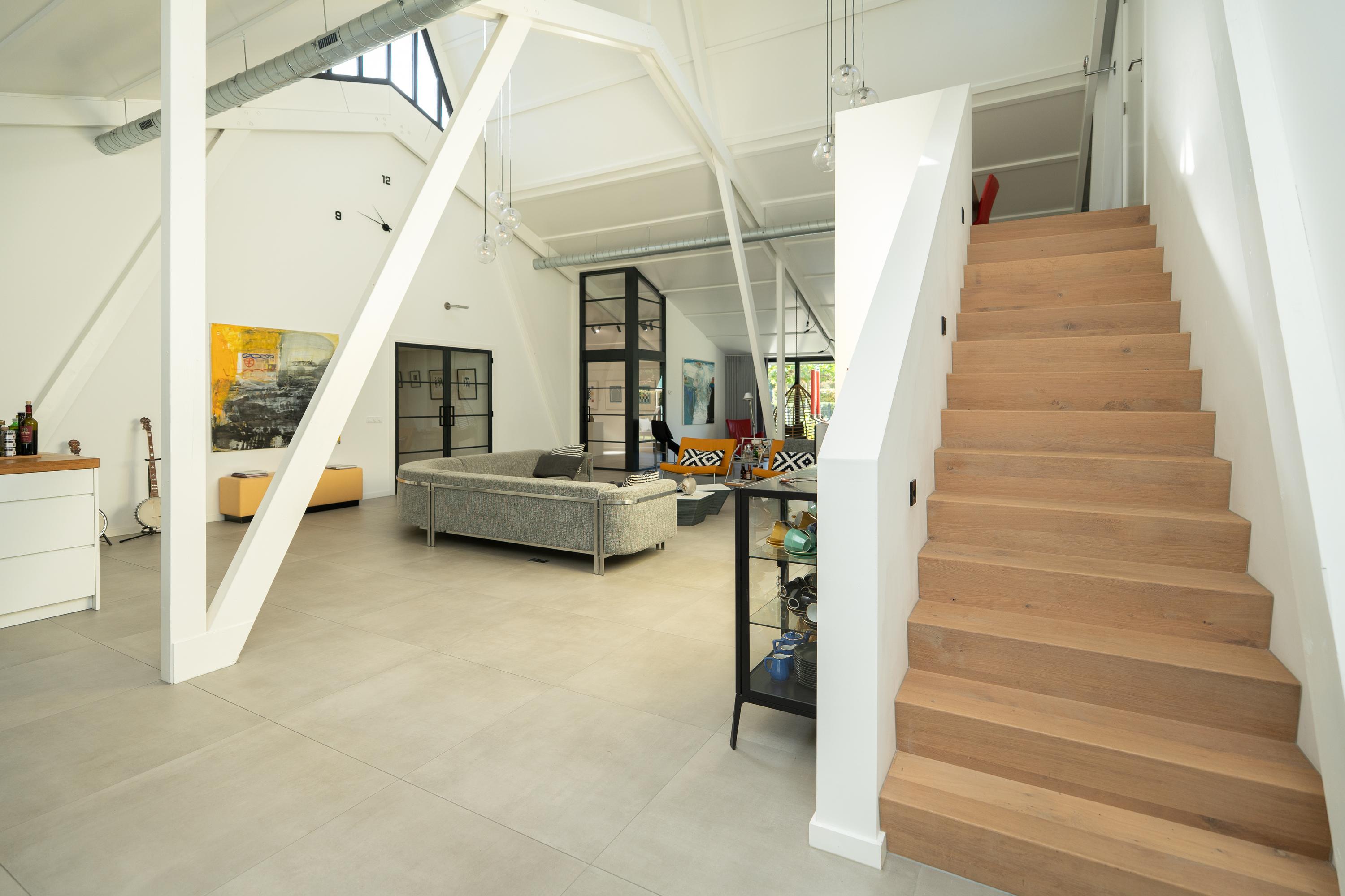 Entrance hall, spacious hall that immediately emphasises the spacious character of the house. The hall contains the meter cupboard, loft and the first toilet with washbasin. A spacious living room with high ceiling, where the many windows on all sides provide beautiful light and an open atmosphere. There are sliding doors to the front and back gardens at both the front and rear. There is also a spacious indoor storage room under the stairs and the staircase itself is beautifully concealed. Modern open kitchen with a large cooking island. The tall cabinets are beautifully concealed in the wall and the kitchen is equipped with various luxury built-in appliances. The utility room is located at the front of the house and has a kitchen unit, heat pump and boiler, and an extra outside door.