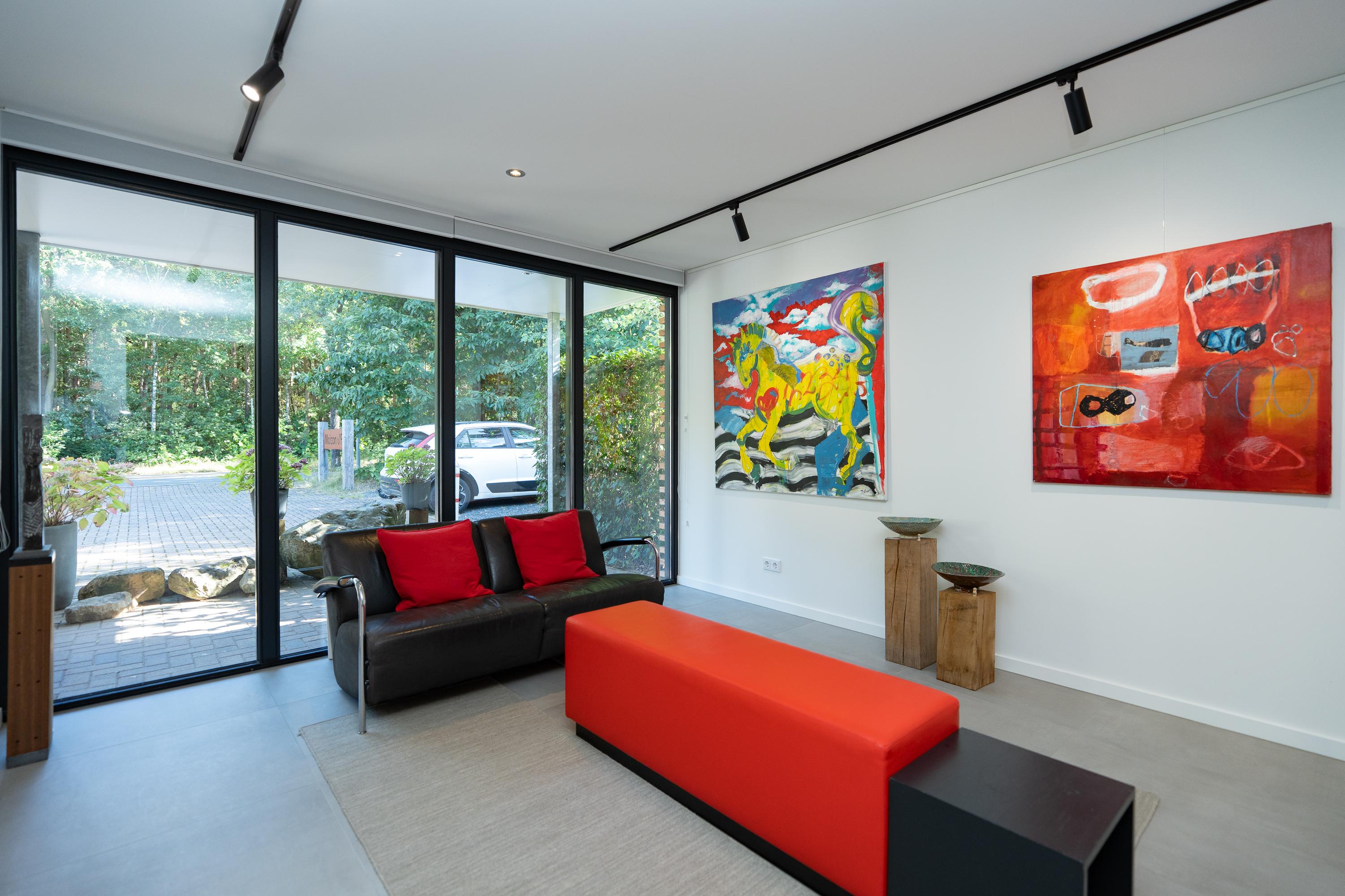 There are a total of three bedrooms and a multifunctional study on the ground floor. The study is currently used as a gallery. The master bedroom has a spacious walk-in closet and an adjoining very spacious bathroom with a combination sauna, freestanding bathtub, shower, double sink, and toilet. Here you can relax and enjoy the green surroundings while bathing. The second bathroom is located near the other bedrooms and is equipped with a shower, double sink and toilet.