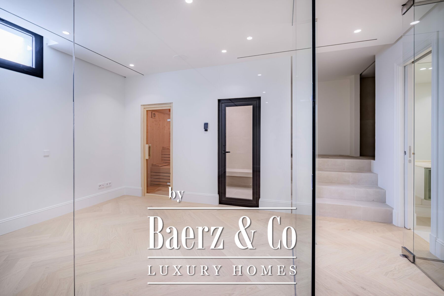 Inside, 475 m² of living space unfolds across three levels. Four bedrooms and six bathrooms balance fluid, open-plan layouts with pockets of intimacy, each room displaying neutral palettes and meticulous carpentry. The master suite occupies the first floor, distinguished by bespoke furnishings and garden views. The kitchen, fully equipped and open to the garden, communicates seamlessly with an exterior BBQ area.
