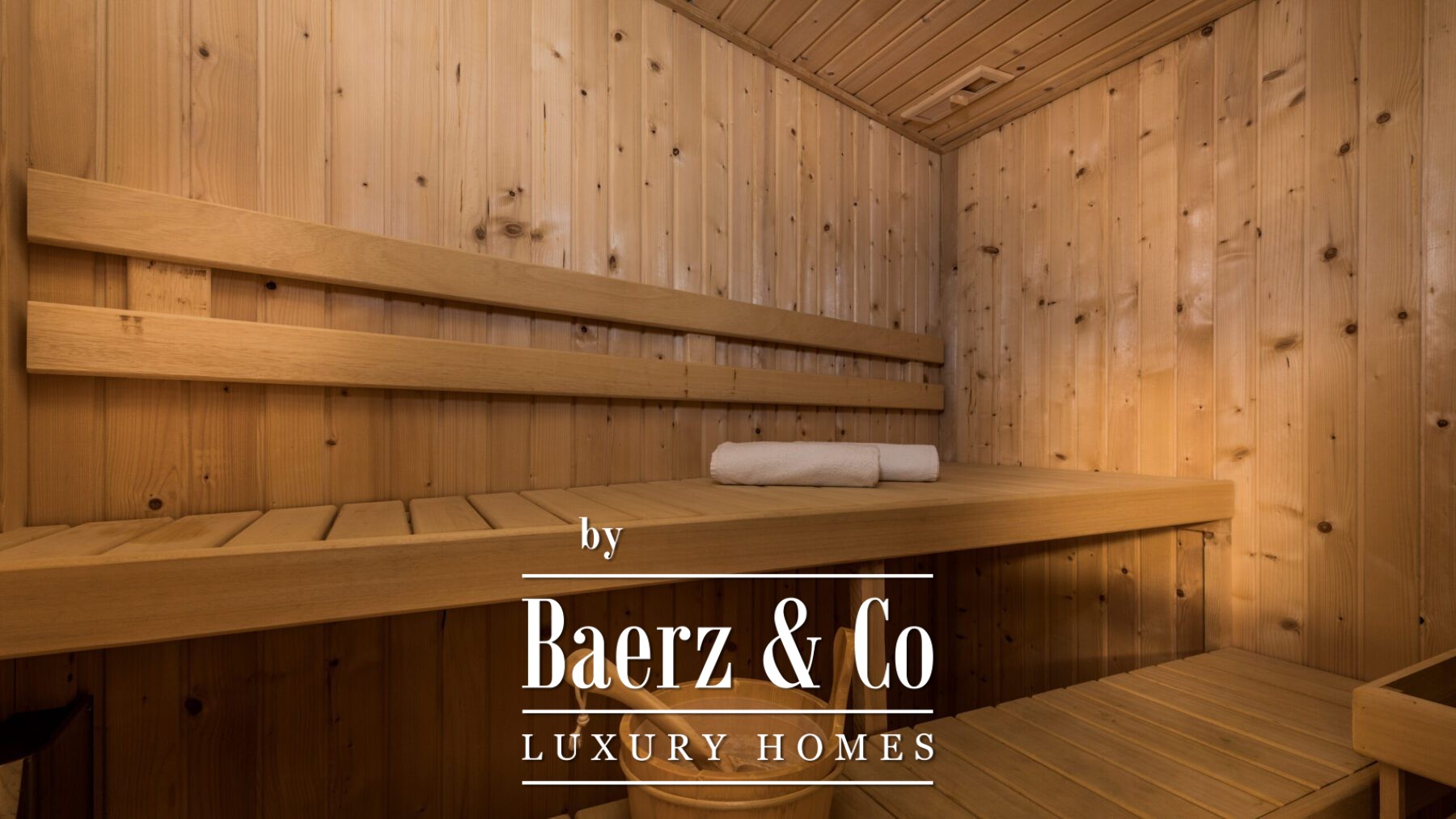 The basement level includes two more bedrooms with natural light, fitted wardrobes, a bathroom, and a spa area with a jacuzzi, steam bath, sauna, and showers. There are also storage rooms and a utility room. An elevator and oak staircase with glass railings provide access to each floor.