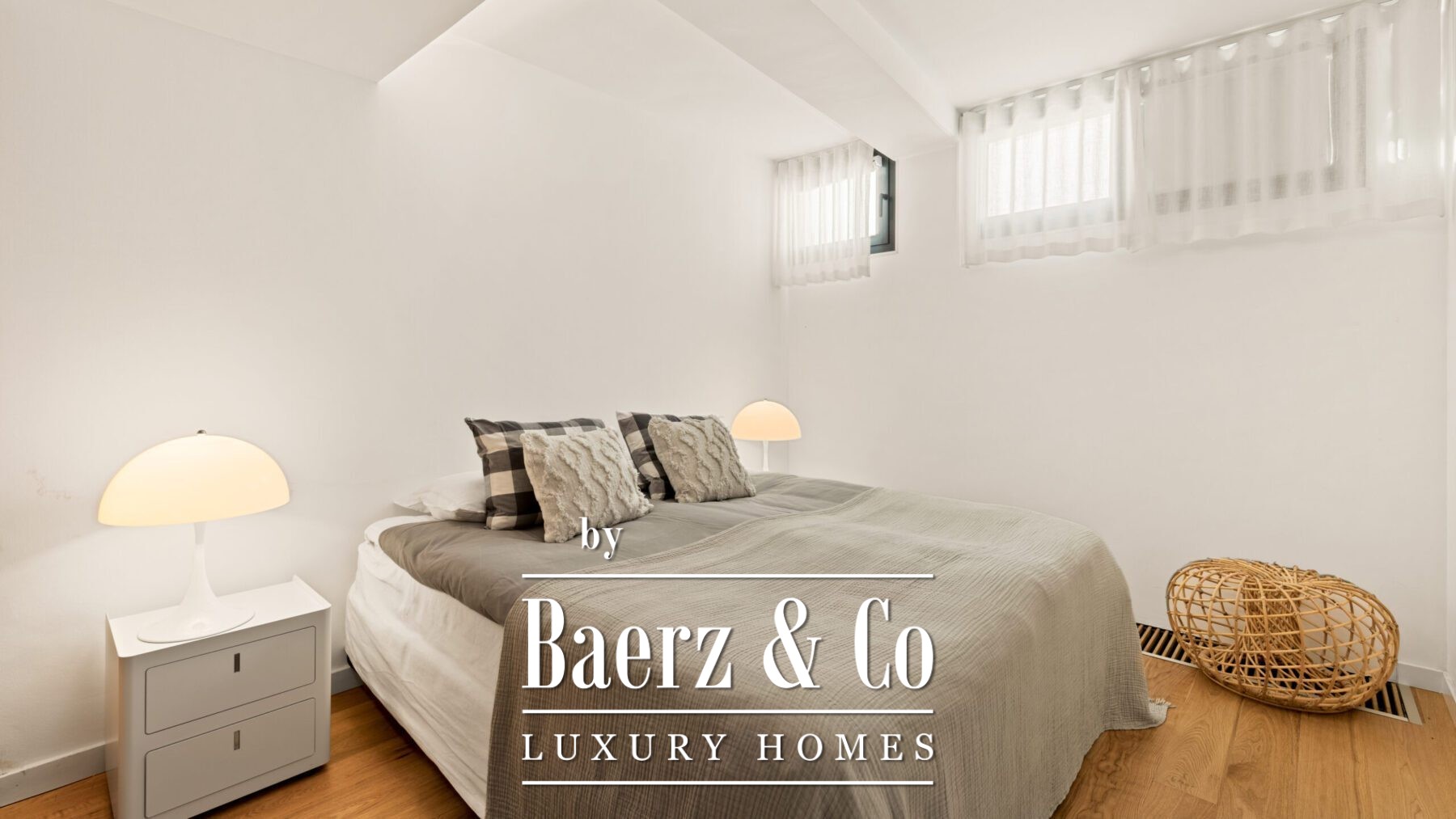 Facing southwest, the property treats its residents to breath-taking sea views and stunning sunsets. Its design incorporates wood, glass, stone, and concrete, creating a remarkable family residence.