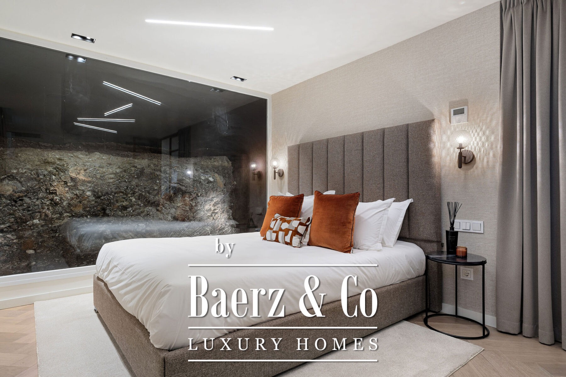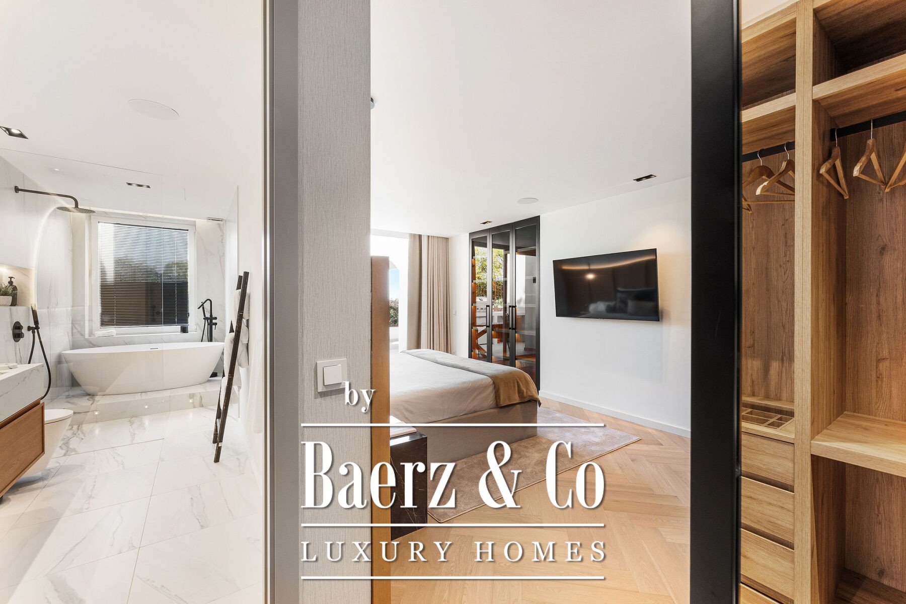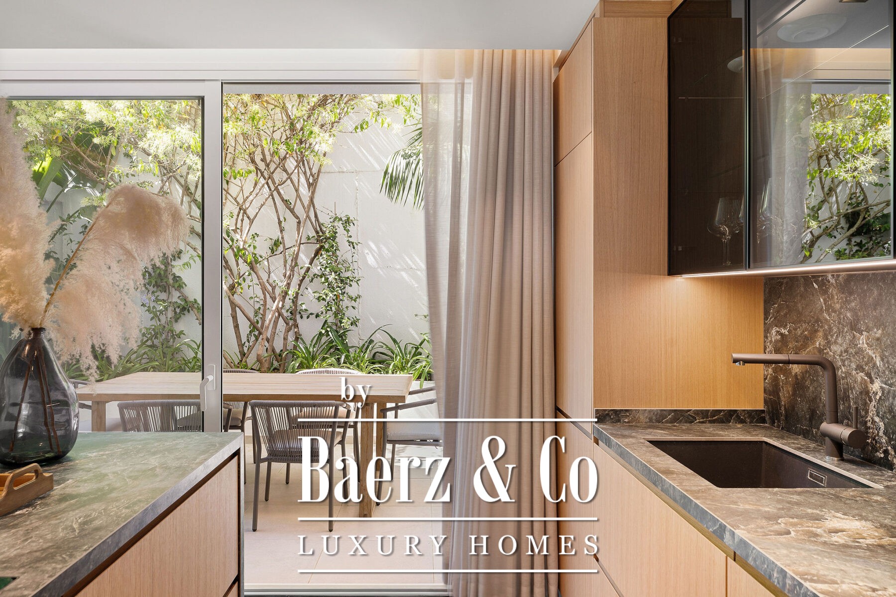 On the ground floor, natural light accentuates the open-plan living, dining, and state-of-the-art Gaggenau kitchen, each defined by premium wood and marble finishes. Herringbone floors and a neutral color palette impart warmth and understated sophistication. Extending from the living area, a private patio invites alfresco dining and moments of quiet retreat. The opulent principal suite features an expansive closet, a freestanding bathtub overlooking the terrace, and an en-suite bathroom. An additional bedroom on this floor ensures flexible accommodation for family or guests.
