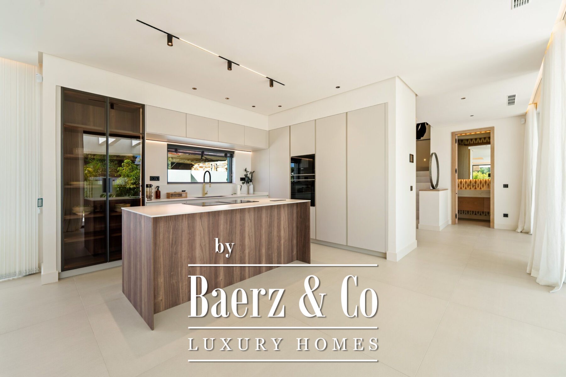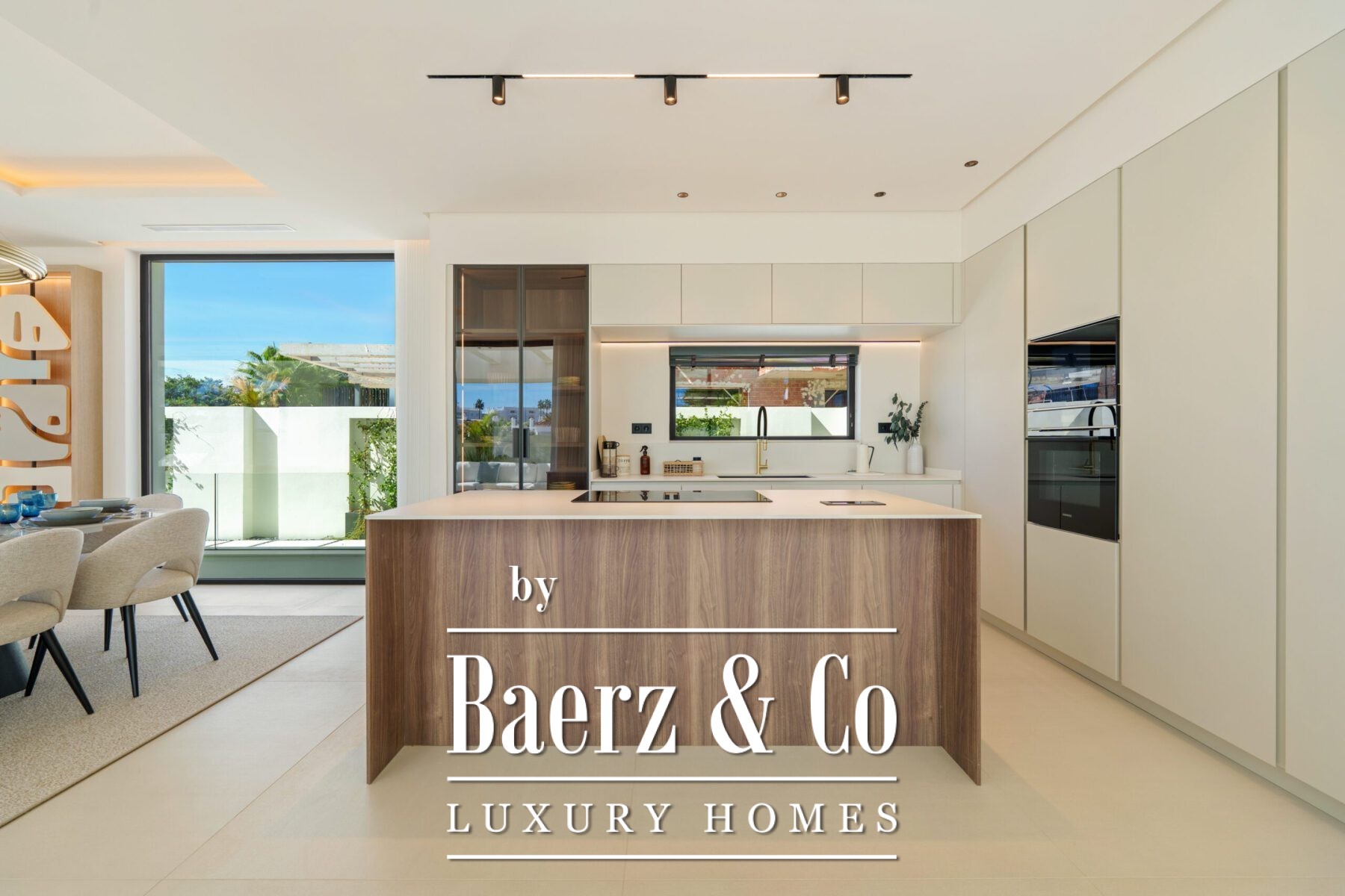 The atmosphere inside is luminous and poised, defined by soft neutral hues, recessed lighting, and generous floor-to-ceiling windows that invite the Andalusian light. The open-plan living and dining zone, anchored by a bespoke entertainment wall and contemporary fixtures, flows seamlessly into a state-of-the-art kitchen where a wood island and integrated appliances meet sleek cabinetry. This fluid spatial experience extends to a dining area meant for meaningful gatherings.