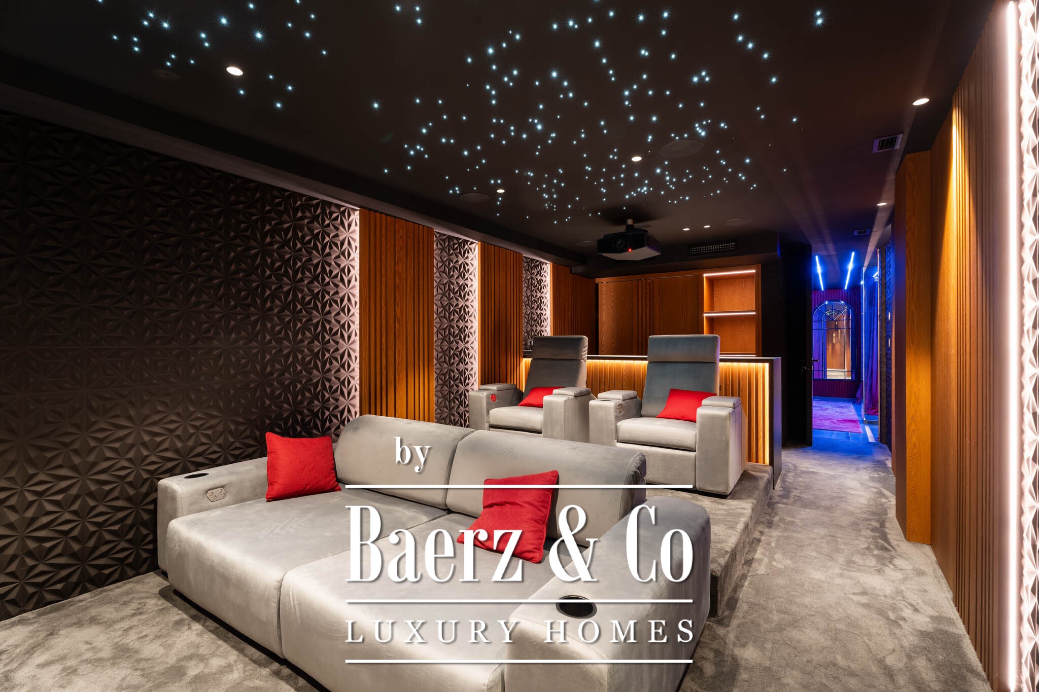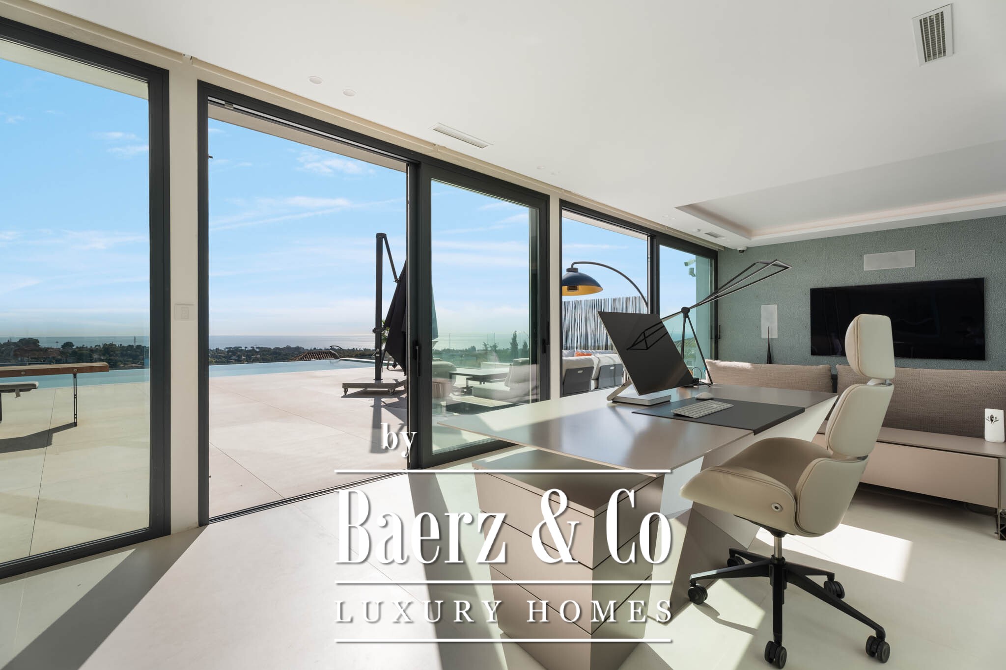 Six bedrooms, each with an en-suite bathroom, ensure comfort and seclusion. The principal suite enjoys unhindered sea views and access to its own terrace. Elevated above, a solarium with jacuzzi frames wide-reaching vistas from the golf course to the distant African shore. Entertainment and wellness areas reside on the lower floor, featuring a gym, sauna, cinema room and dedicated gathering spaces. A large garage with turning platforms enhances convenience.