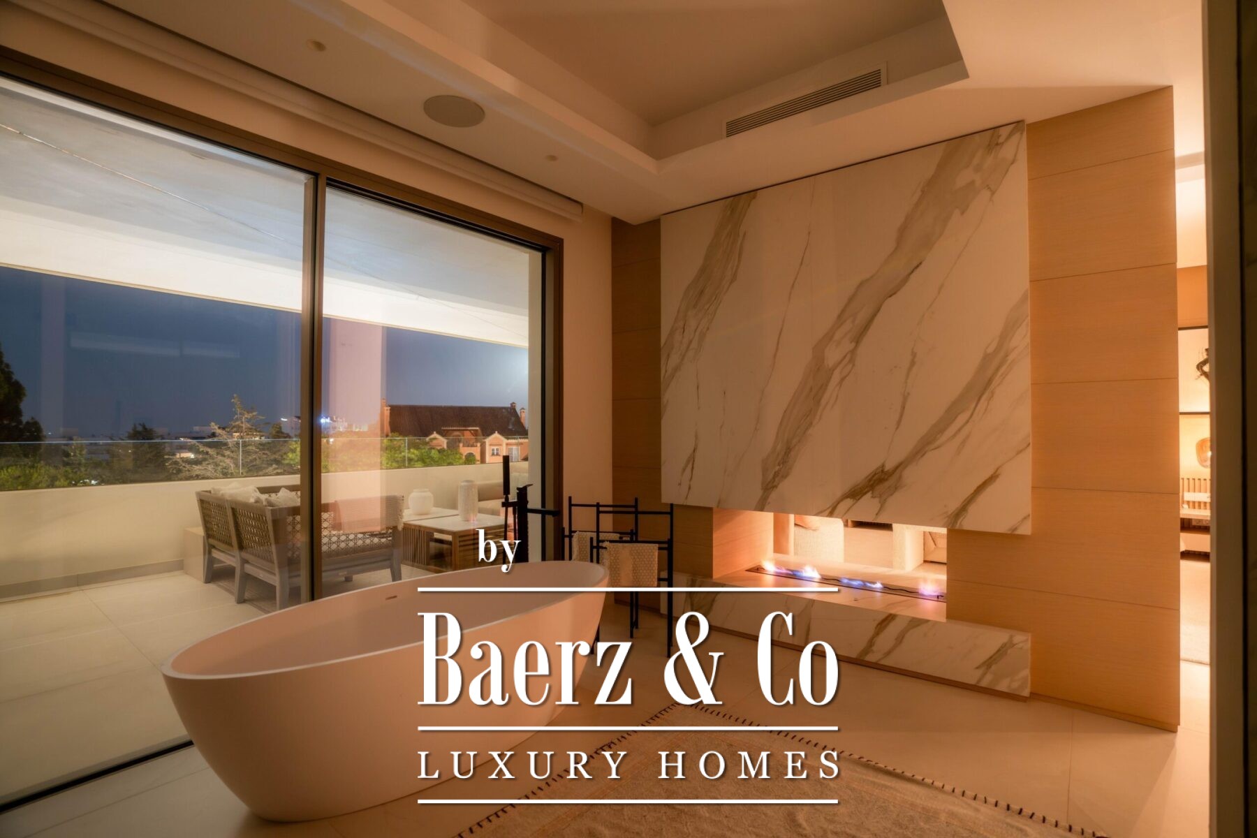 Generous living areas connect to a covered terrace designed for seamless indoor-outdoor living. The custom rooftop solarium, complete with a private plunge pool, opens up panoramic views over the Golf Valley and the iconic La Concha mountain. A private elevator links each of the four levels, allowing effortless access throughout, while the fully equipped Siematic kitchen invites convivial gatherings.