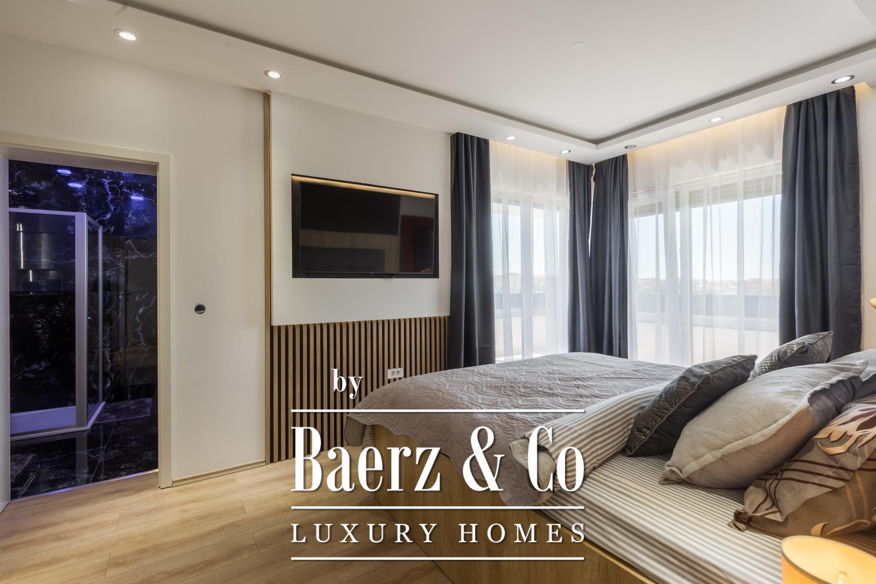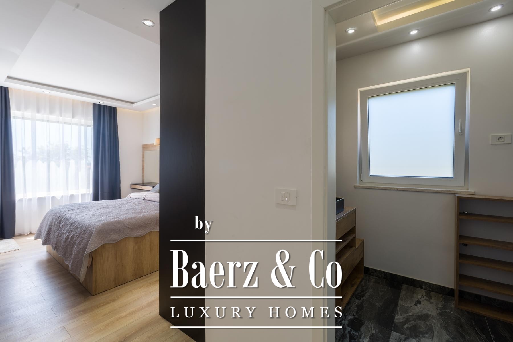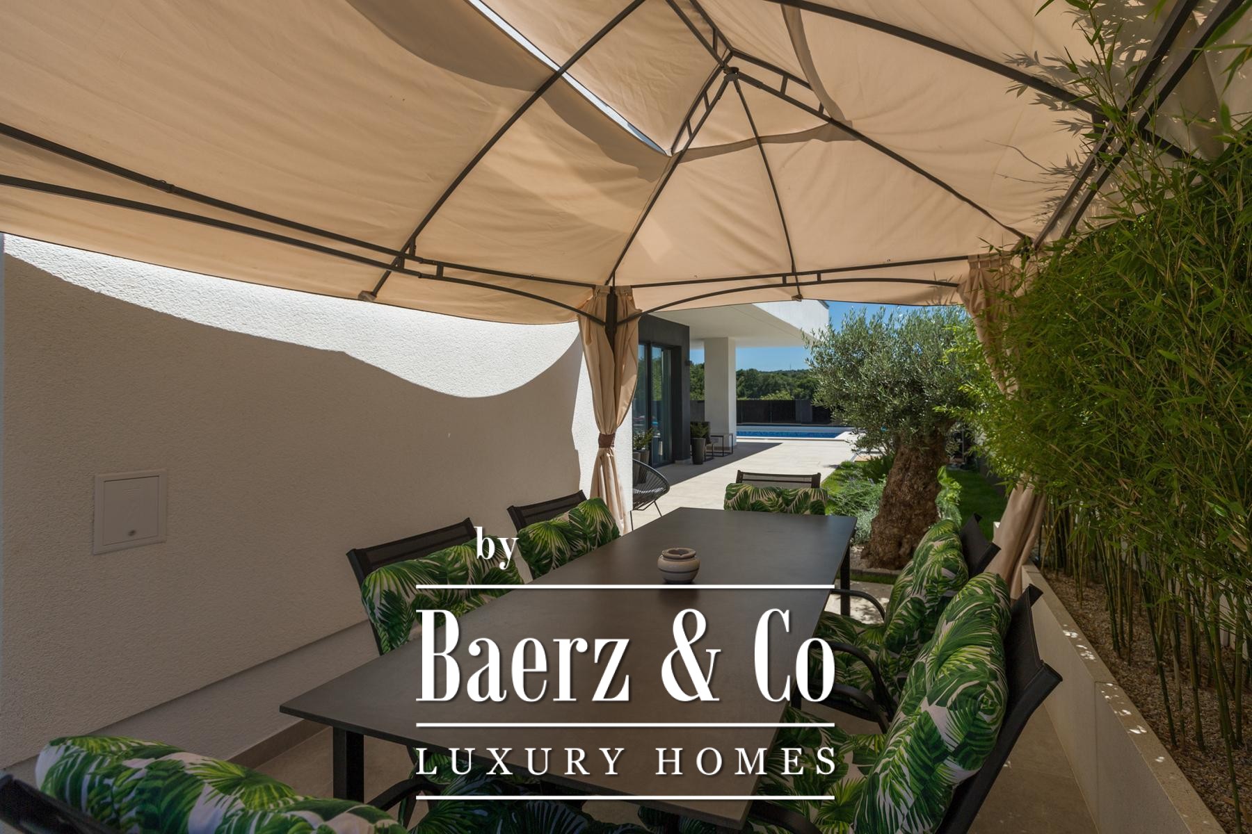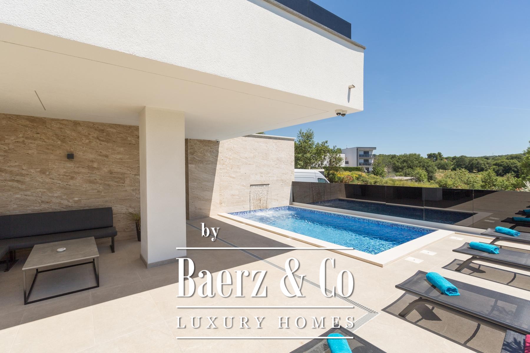 Medulin, one of the most prestigious tourist destinations on the southwestern coast of Istria, where this extraordinary, modern villa awaits, setting new standards of luxury and comfort. Situated on a 450 m2 plot, this meticulously designed new construction from 2024 spans an impressive 200 m2 of net usable area across two levels, offering a perfect blend of sophisticated design and functionality. The proximity of just 400 meters from the sea and beautiful beaches ensures easy access to the crystal-clear Adriatic, while its south orientation guarantees abundant sunlight throughout the day.Upon entering the ground floor of the villa, you will immediately be captivated by the spaciousness and open-plan concept that seamlessly connects the indoor and outdoor living areas. The contemporarily equipped kitchen, featuring the latest appliances and elegant lines, forms the heart of the home, perfect for preparing gastronomic delights. It naturally flows into the opulent living room, bathed in natural light filtering through large glass walls. These expansive glass surfaces not only provide a magnificent view of the meticulously landscaped exterior but also offer direct access to the covered terrace and the main highlight of the outdoor space - an impressive swimming pool.The outdoor area is a true oasis of peace and relaxation. The swimming pool, surrounded by a high stone wall from which a calming waterfall cascades, creates a unique ambiance. Carefully selected green foliage dominates the entire courtyard, creating the impression of a tropical garden that perfectly blends with the villa's architecture, imbuing it with warmth and natural charm. Adjacent to the pool, there is a summer kitchen and a barbecue area, ideal for gatherings and enjoying Mediterranean evenings under the stars. The entire exterior is designed with the aim of providing maximum privacy and relaxation, inviting you to carefree enjoyment in a luxurious setting.An internal staircase, a masterpiece of modern design and lighting, leads you to the upper floor of the villa. Specially designed lighting, subtly highlighted in the evenings, creates an atmosphere of warmth and elegance