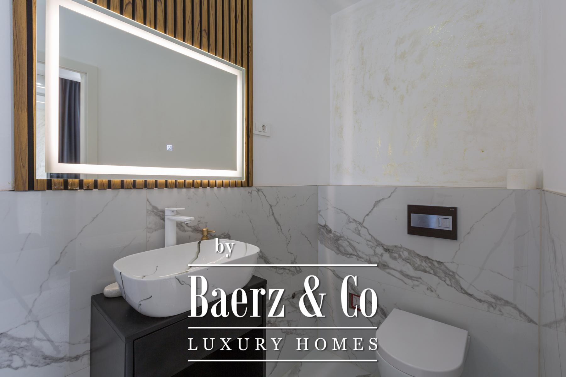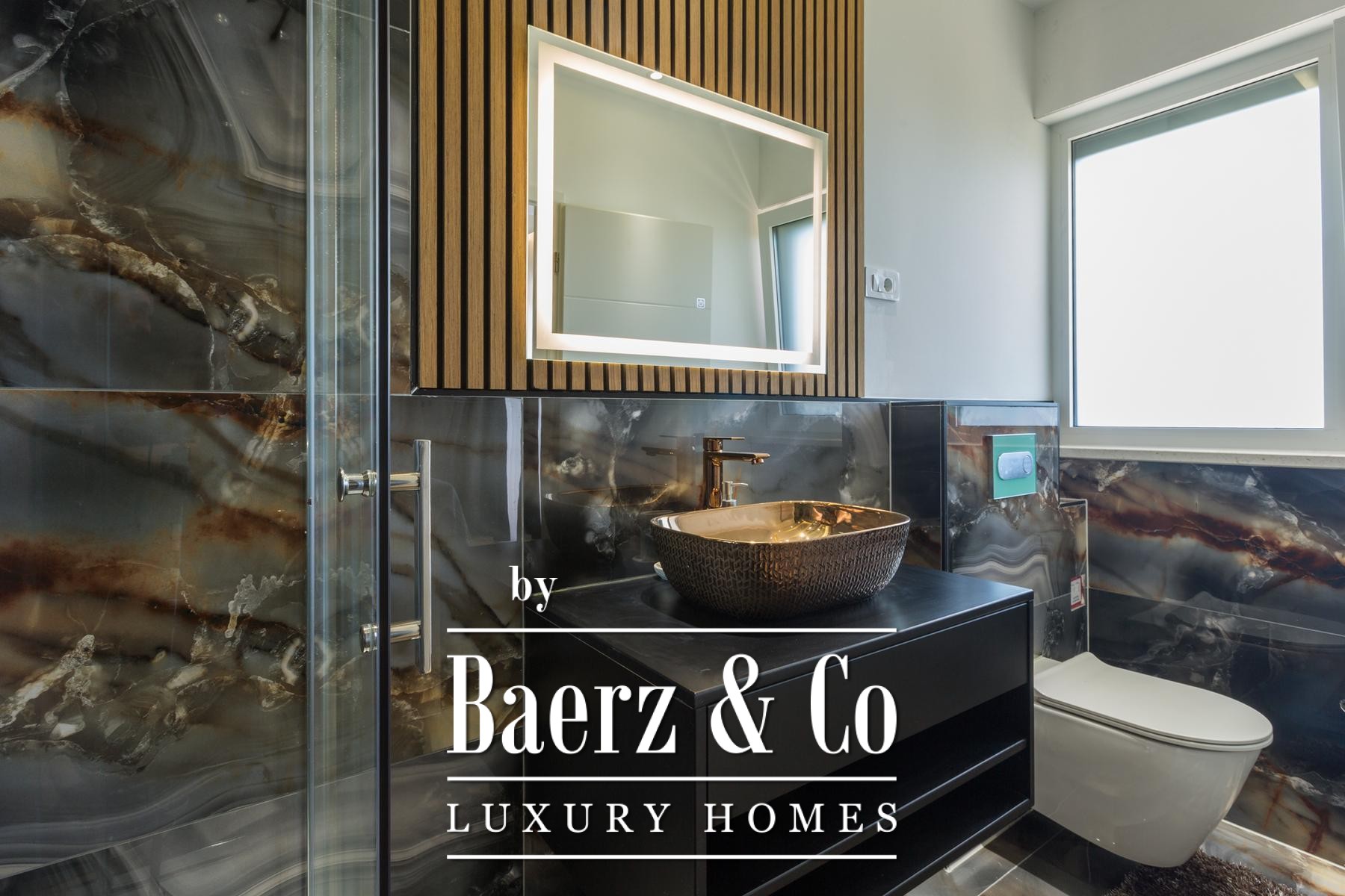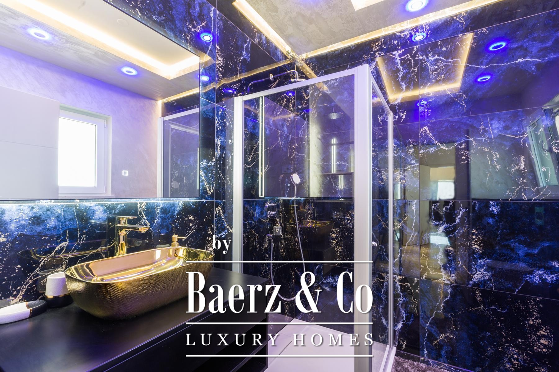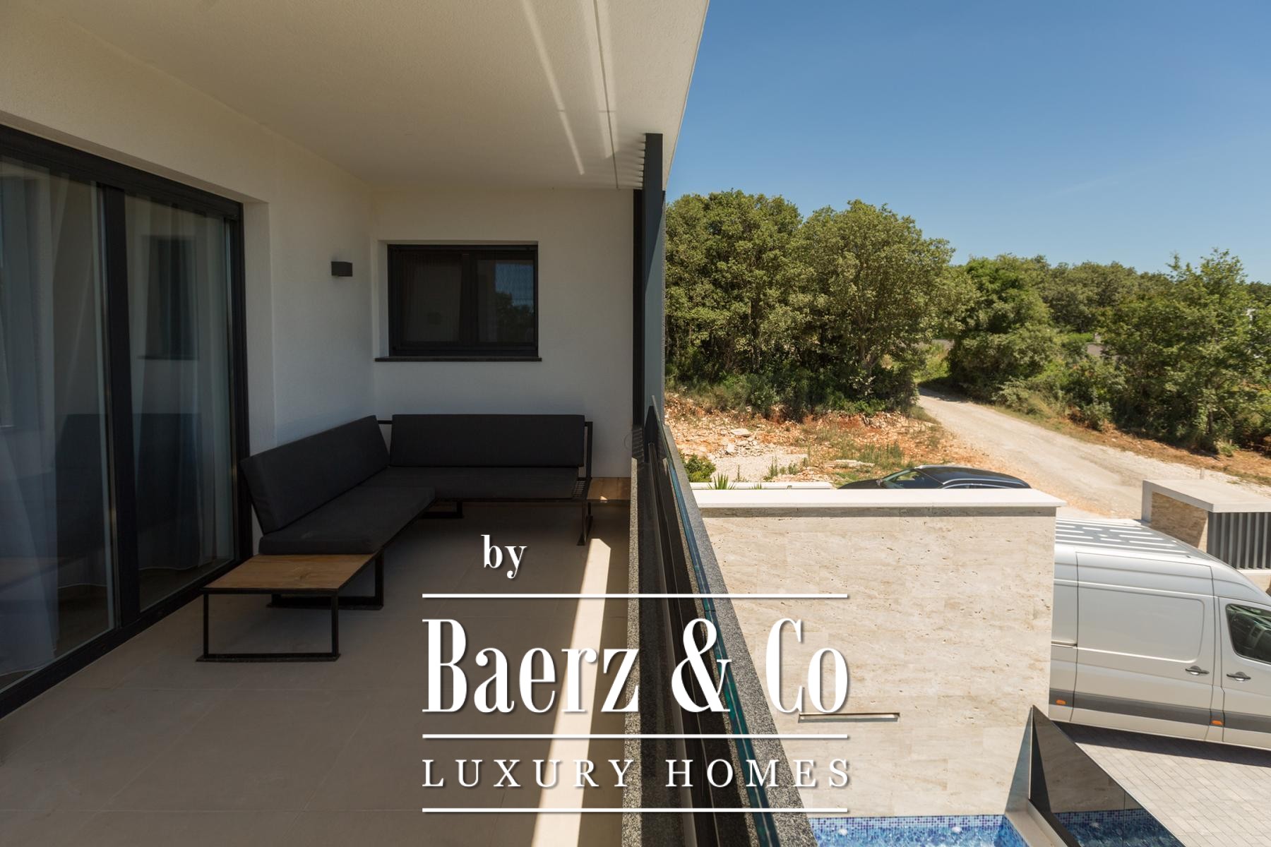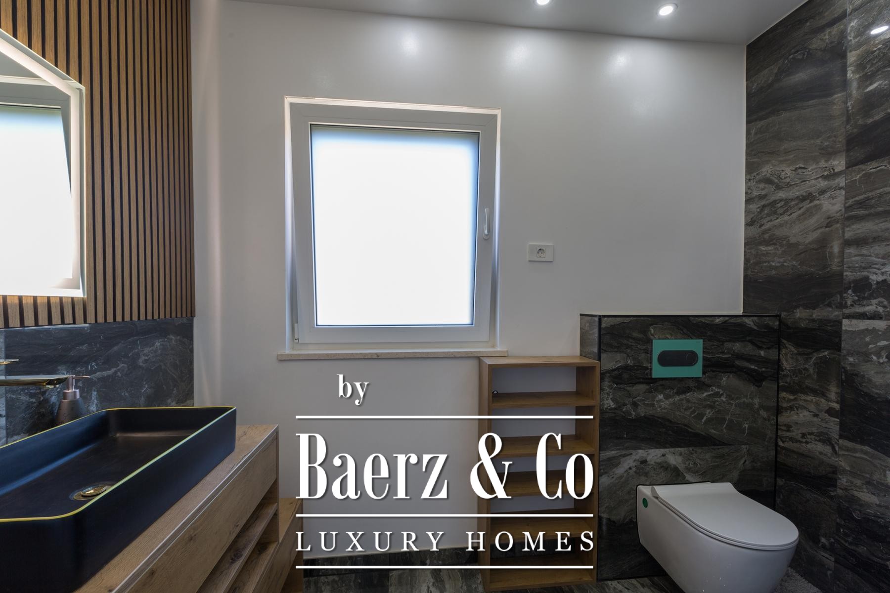 Medulin, one of the most prestigious tourist destinations on the southwestern coast of Istria, where this extraordinary, modern villa awaits, setting new standards of luxury and comfort. Situated on a 450 m2 plot, this meticulously designed new construction from 2024 spans an impressive 200 m2 of net usable area across two levels, offering a perfect blend of sophisticated design and functionality. The proximity of just 400 meters from the sea and beautiful beaches ensures easy access to the crystal-clear Adriatic, while its south orientation guarantees abundant sunlight throughout the day.Upon entering the ground floor of the villa, you will immediately be captivated by the spaciousness and open-plan concept that seamlessly connects the indoor and outdoor living areas. The contemporarily equipped kitchen, featuring the latest appliances and elegant lines, forms the heart of the home, perfect for preparing gastronomic delights. It naturally flows into the opulent living room, bathed in natural light filtering through large glass walls. These expansive glass surfaces not only provide a magnificent view of the meticulously landscaped exterior but also offer direct access to the covered terrace and the main highlight of the outdoor space - an impressive swimming pool.The outdoor area is a true oasis of peace and relaxation. The swimming pool, surrounded by a high stone wall from which a calming waterfall cascades, creates a unique ambiance. Carefully selected green foliage dominates the entire courtyard, creating the impression of a tropical garden that perfectly blends with the villa's architecture, imbuing it with warmth and natural charm. Adjacent to the pool, there is a summer kitchen and a barbecue area, ideal for gatherings and enjoying Mediterranean evenings under the stars. The entire exterior is designed with the aim of providing maximum privacy and relaxation, inviting you to carefree enjoyment in a luxurious setting.An internal staircase, a masterpiece of modern design and lighting, leads you to the upper floor of the villa. Specially designed lighting, subtly highlighted in the evenings, creates an atmosphere of warmth and elegance