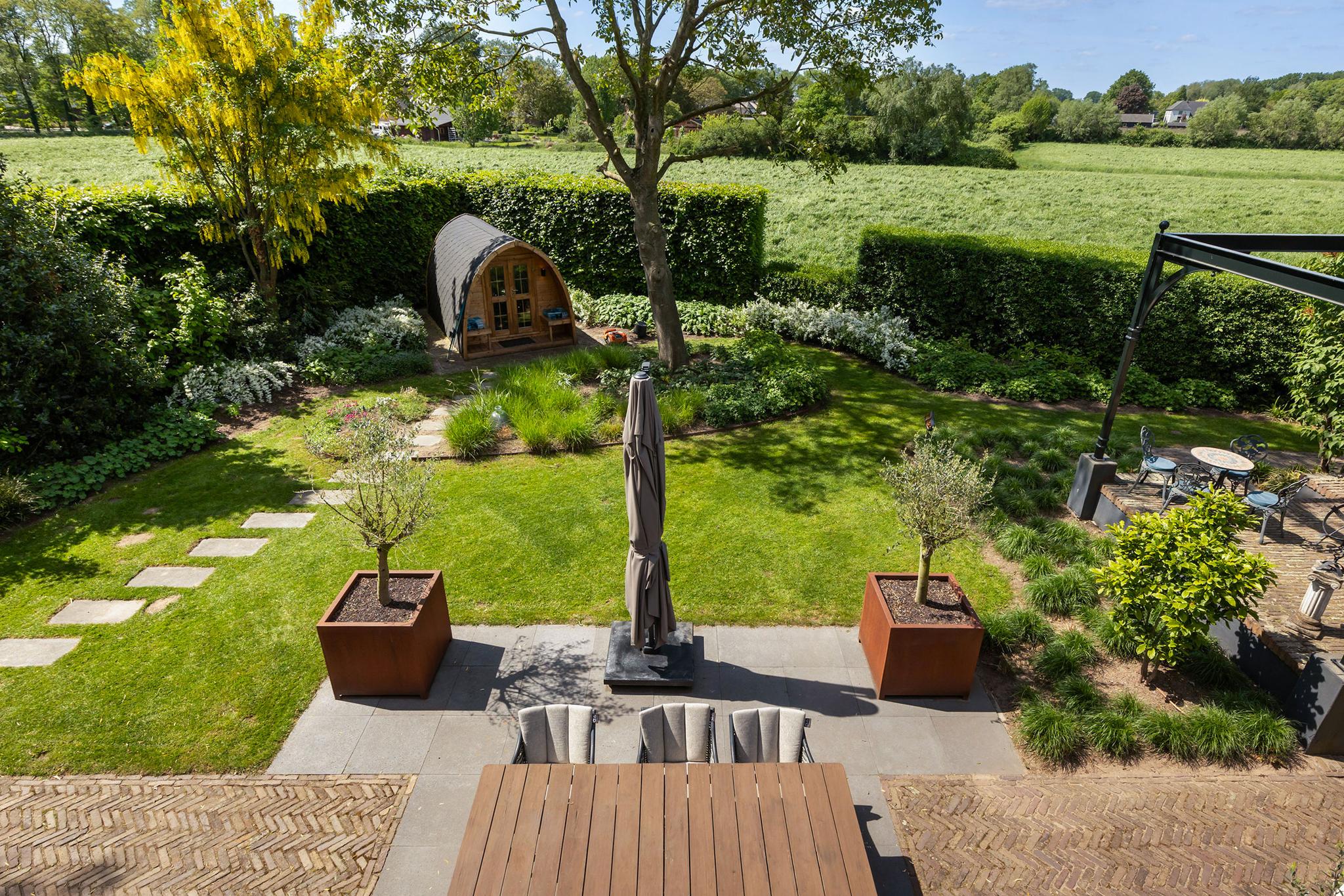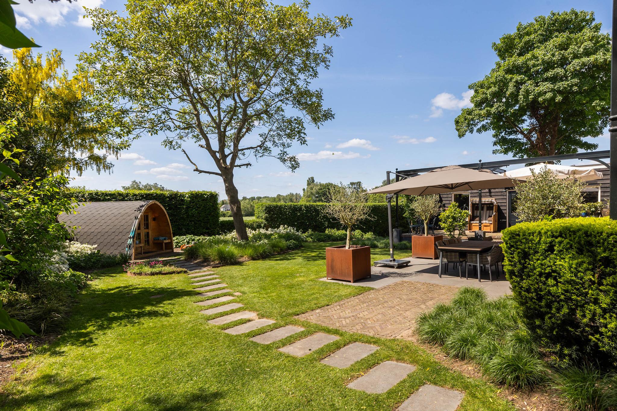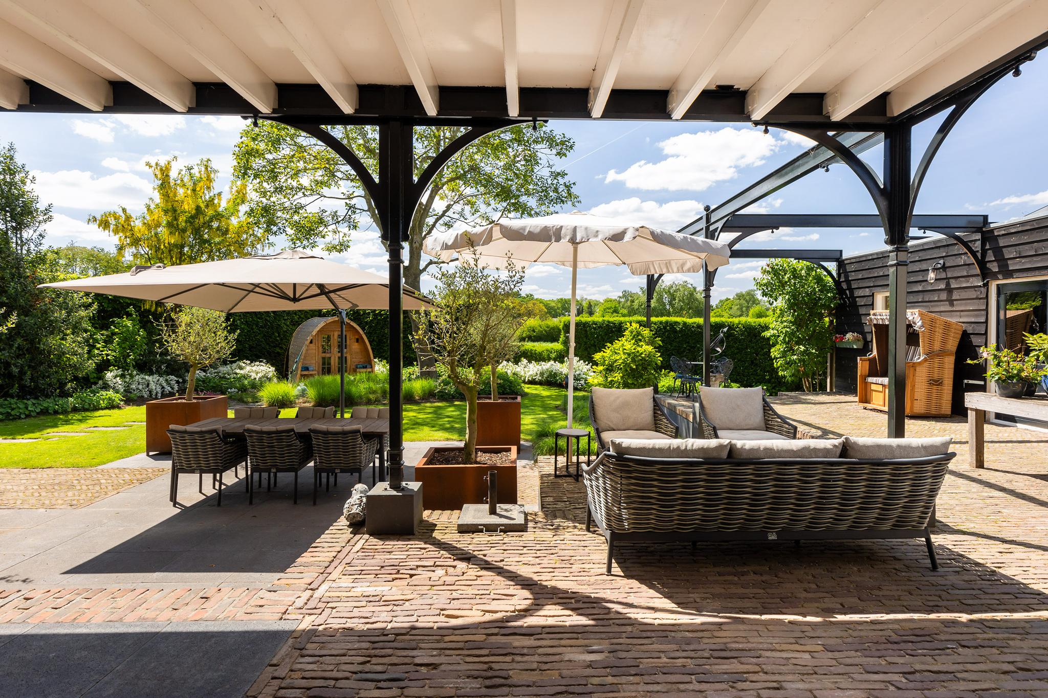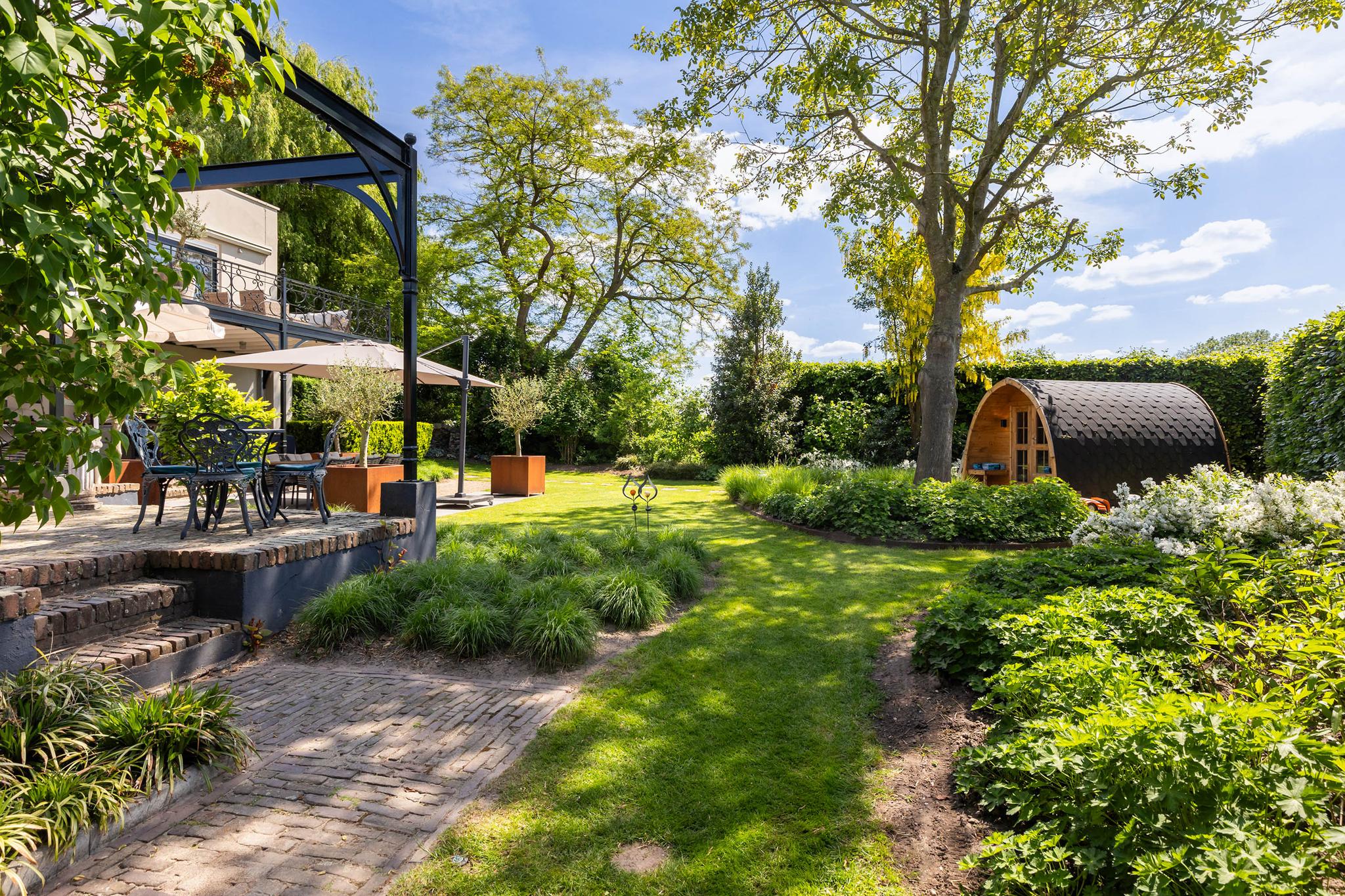 The garden was redesigned in 2022 as an extension of the living space – offering tranquillity, relaxation and a welcoming atmosphere. Features include decorative paving, manicured lawns, an automatic irrigation system fed by a private well, a robotic lawnmower, and multiple terraces for low-maintenance outdoor enjoyment. Hedges of privet, laurel and beech frame the property with natural elegance, while strategic openings offer views of the surrounding polder landscape. Stepping stones lead across the lawn to a half-round log cabin. The wrought-iron pergola and spacious veranda – with timber beamed ceiling and prepared for a jacuzzi and outdoor kitchen – elevate outdoor living to a new level. The main terrace, directly connected to the veranda, comfortably accommodates a large dining table. Mature olive trees in Corten steel planters add a Mediterranean touch. A second garden zone on the side of the plot includes its own terrace, lawn and a majestic weeping willow.