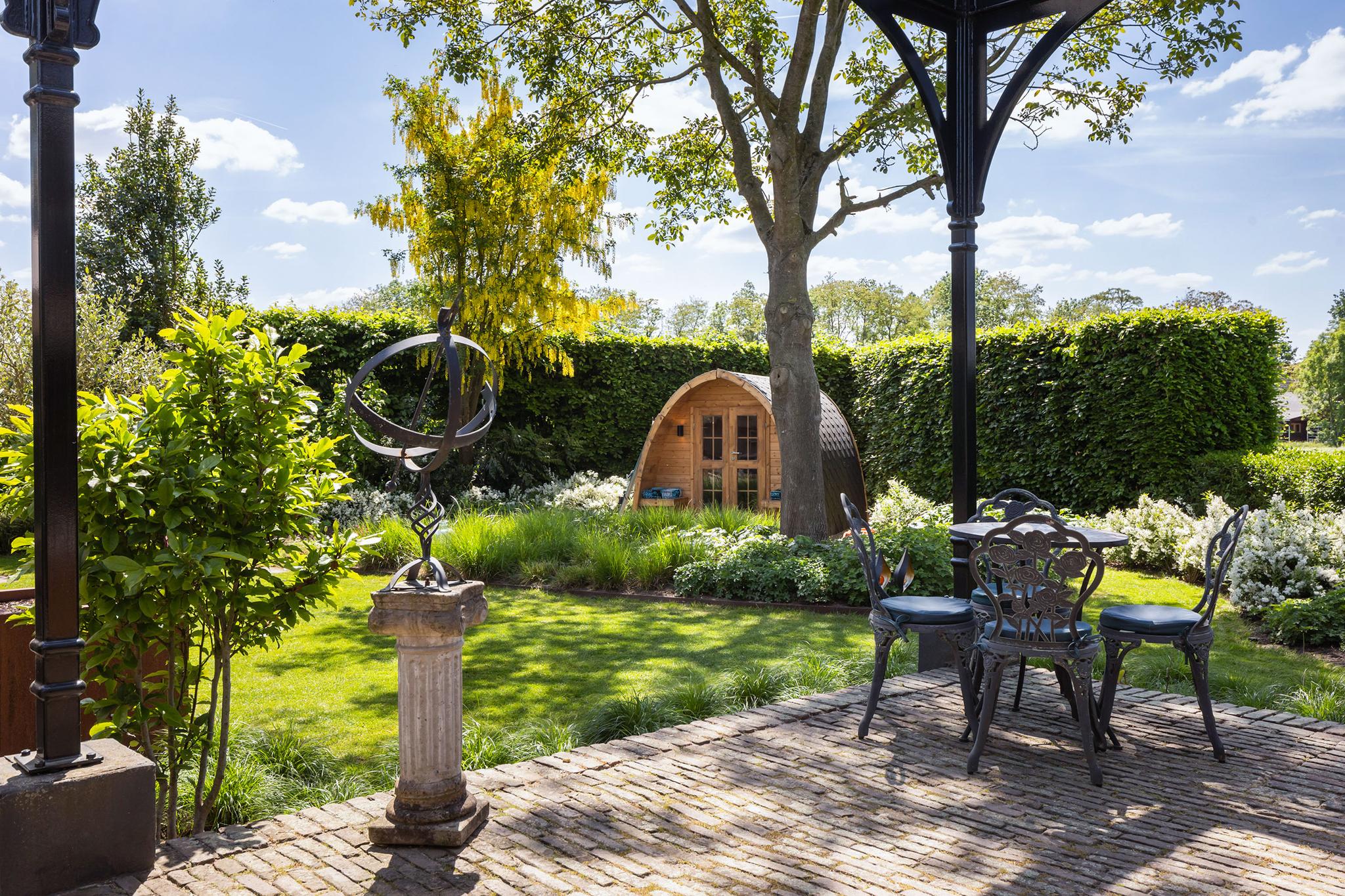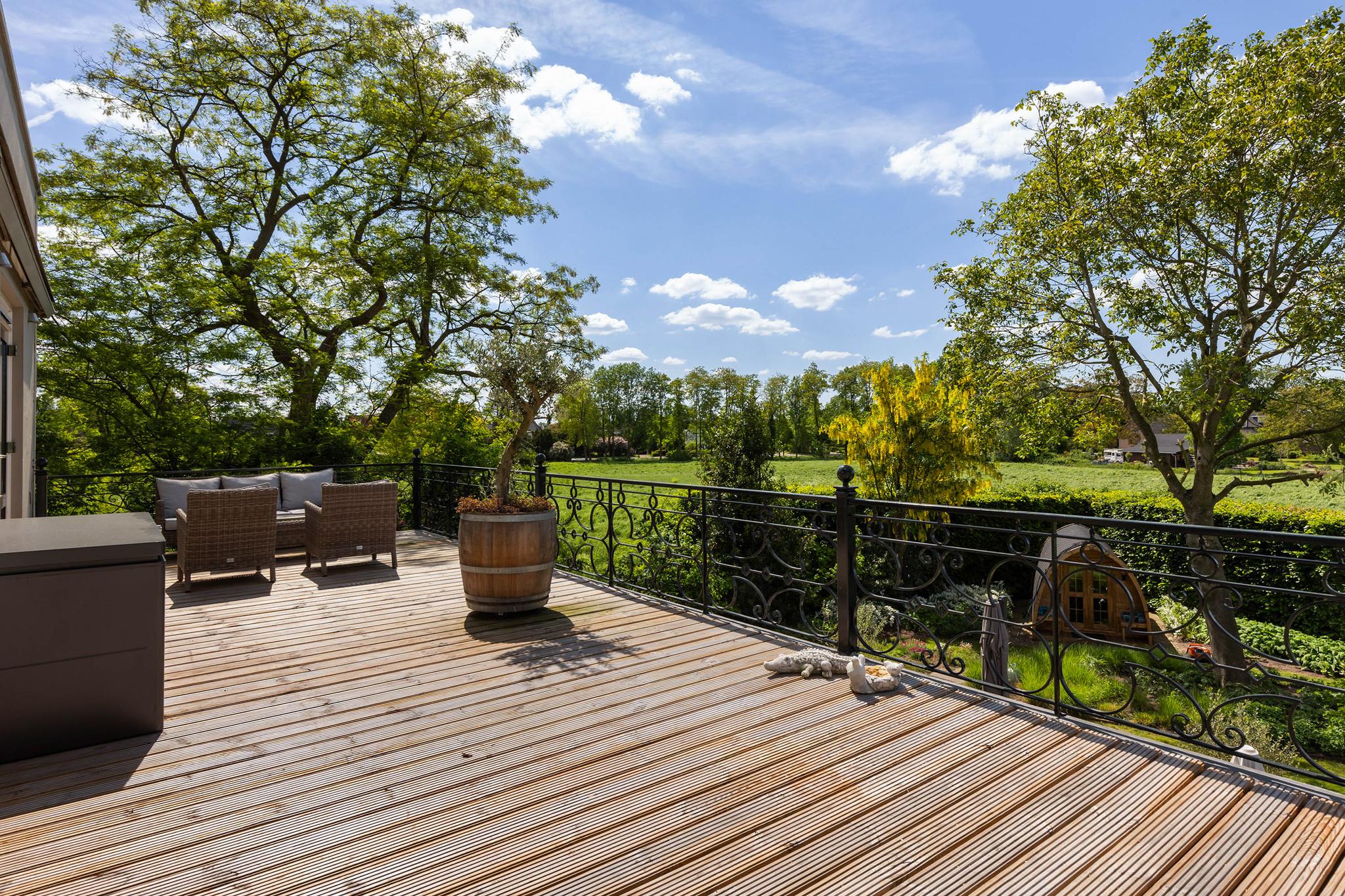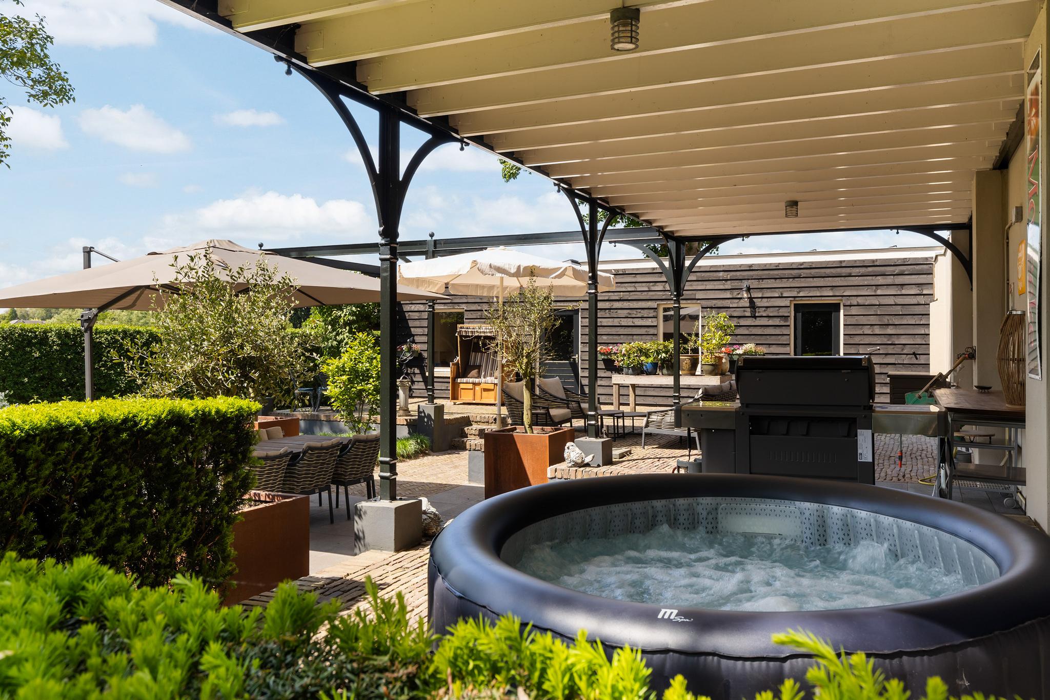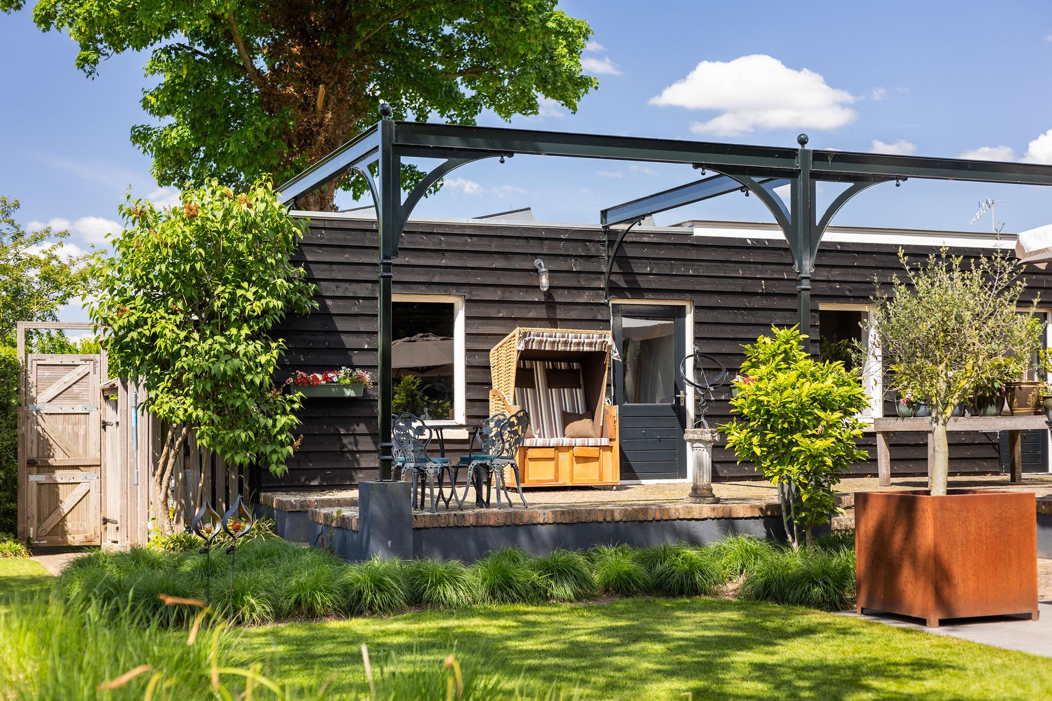 The garden was redesigned in 2022 as an extension of the living space – offering tranquillity, relaxation and a welcoming atmosphere. Features include decorative paving, manicured lawns, an automatic irrigation system fed by a private well, a robotic lawnmower, and multiple terraces for low-maintenance outdoor enjoyment. Hedges of privet, laurel and beech frame the property with natural elegance, while strategic openings offer views of the surrounding polder landscape. Stepping stones lead across the lawn to a half-round log cabin. The wrought-iron pergola and spacious veranda – with timber beamed ceiling and prepared for a jacuzzi and outdoor kitchen – elevate outdoor living to a new level. The main terrace, directly connected to the veranda, comfortably accommodates a large dining table. Mature olive trees in Corten steel planters add a Mediterranean touch. A second garden zone on the side of the plot includes its own terrace, lawn and a majestic weeping willow.