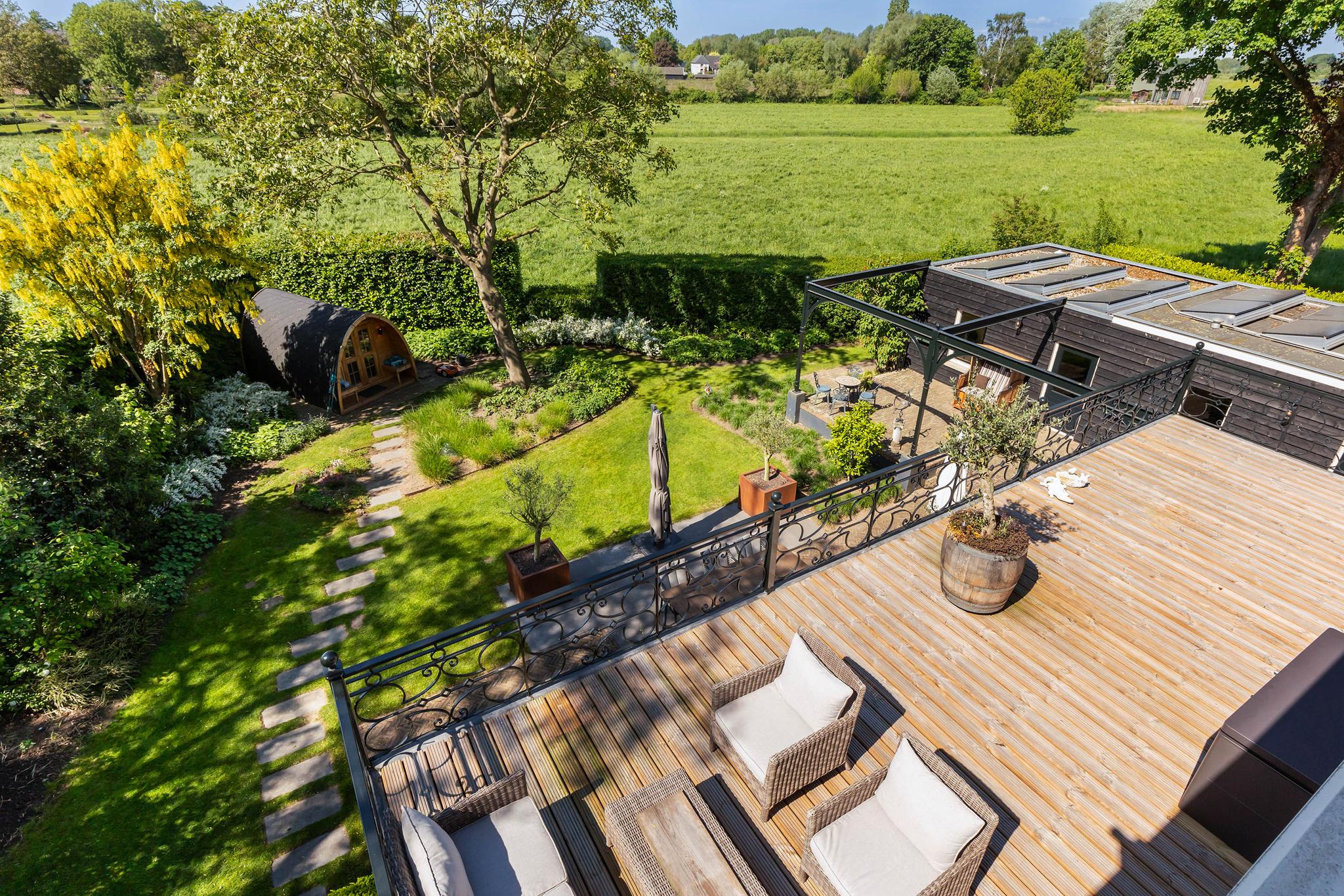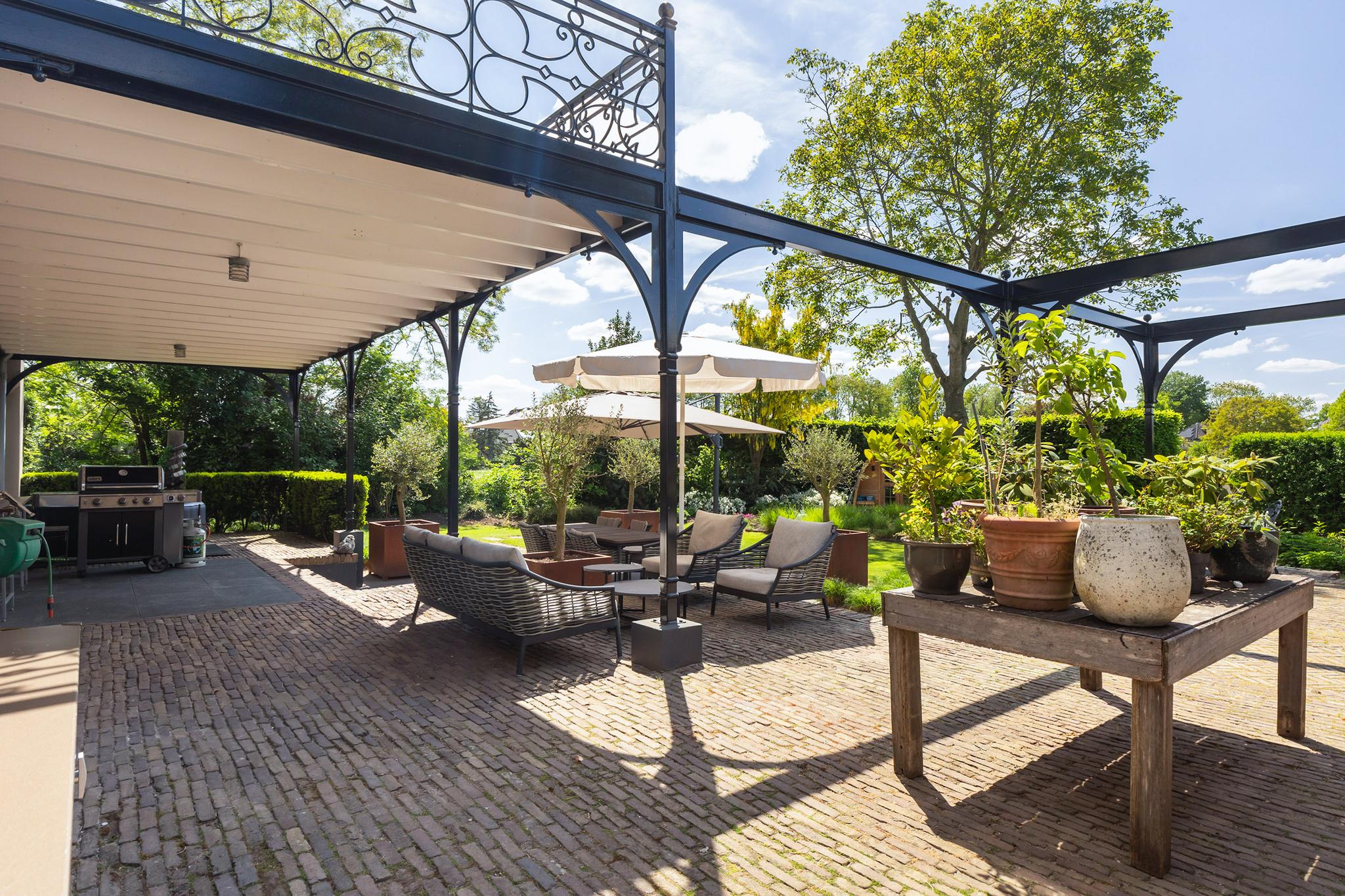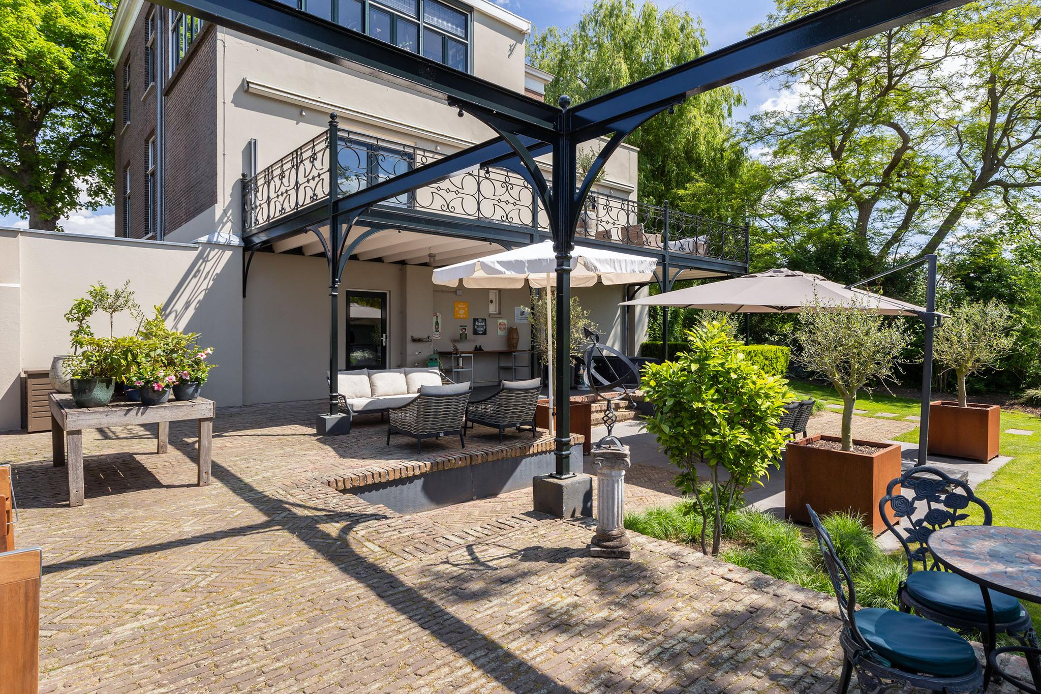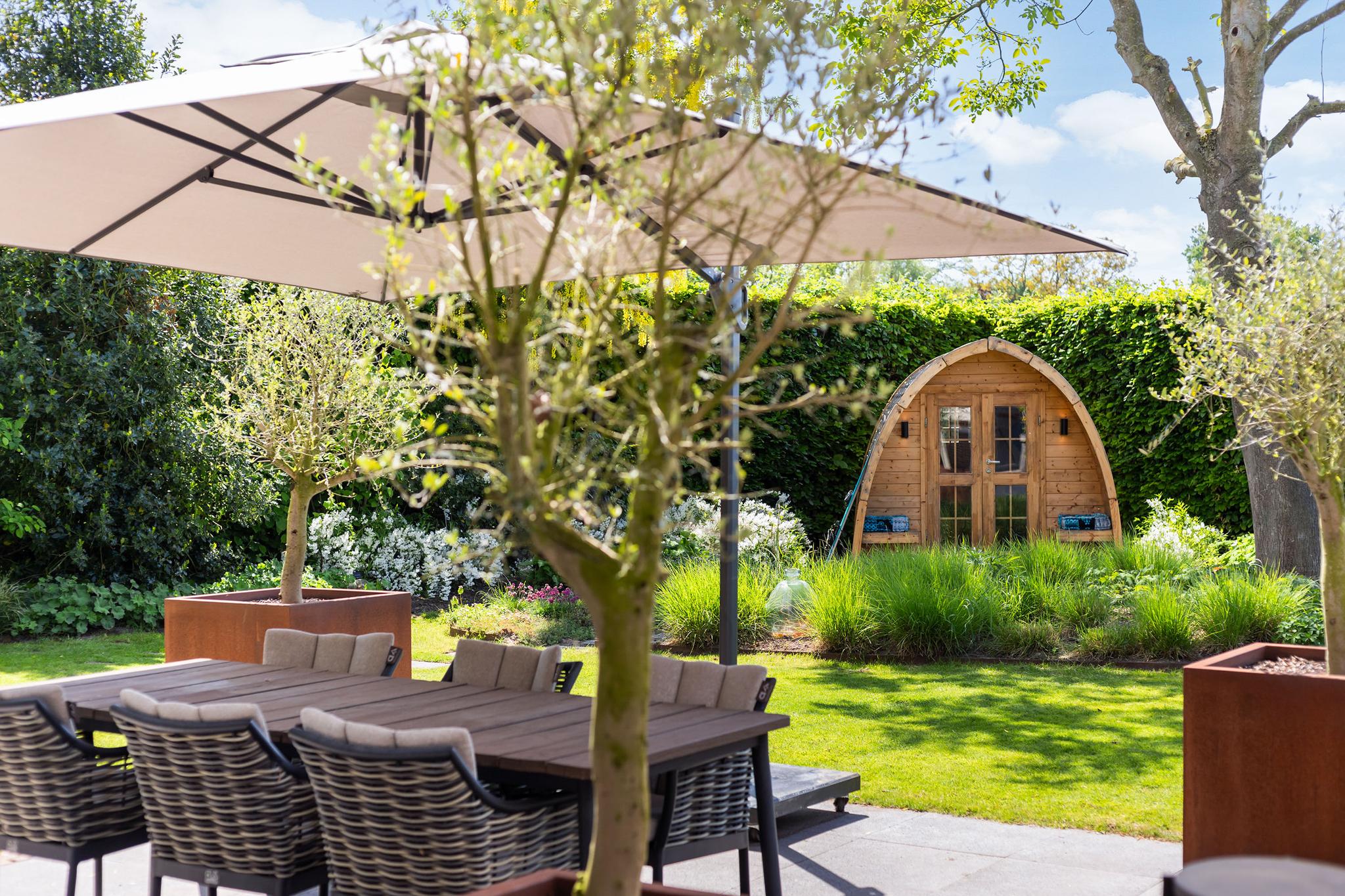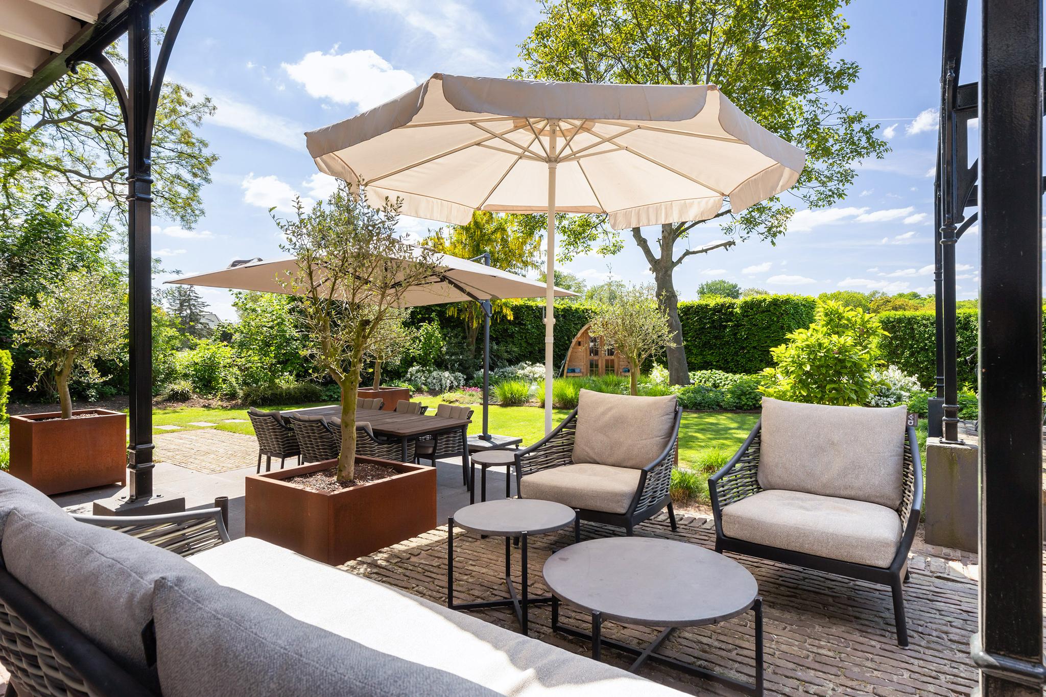 The garden was redesigned in 2022 as an extension of the living space – offering tranquillity, relaxation and a welcoming atmosphere. Features include decorative paving, manicured lawns, an automatic irrigation system fed by a private well, a robotic lawnmower, and multiple terraces for low-maintenance outdoor enjoyment. Hedges of privet, laurel and beech frame the property with natural elegance, while strategic openings offer views of the surrounding polder landscape. Stepping stones lead across the lawn to a half-round log cabin. The wrought-iron pergola and spacious veranda – with timber beamed ceiling and prepared for a jacuzzi and outdoor kitchen – elevate outdoor living to a new level. The main terrace, directly connected to the veranda, comfortably accommodates a large dining table. Mature olive trees in Corten steel planters add a Mediterranean touch. A second garden zone on the side of the plot includes its own terrace, lawn and a majestic weeping willow.
