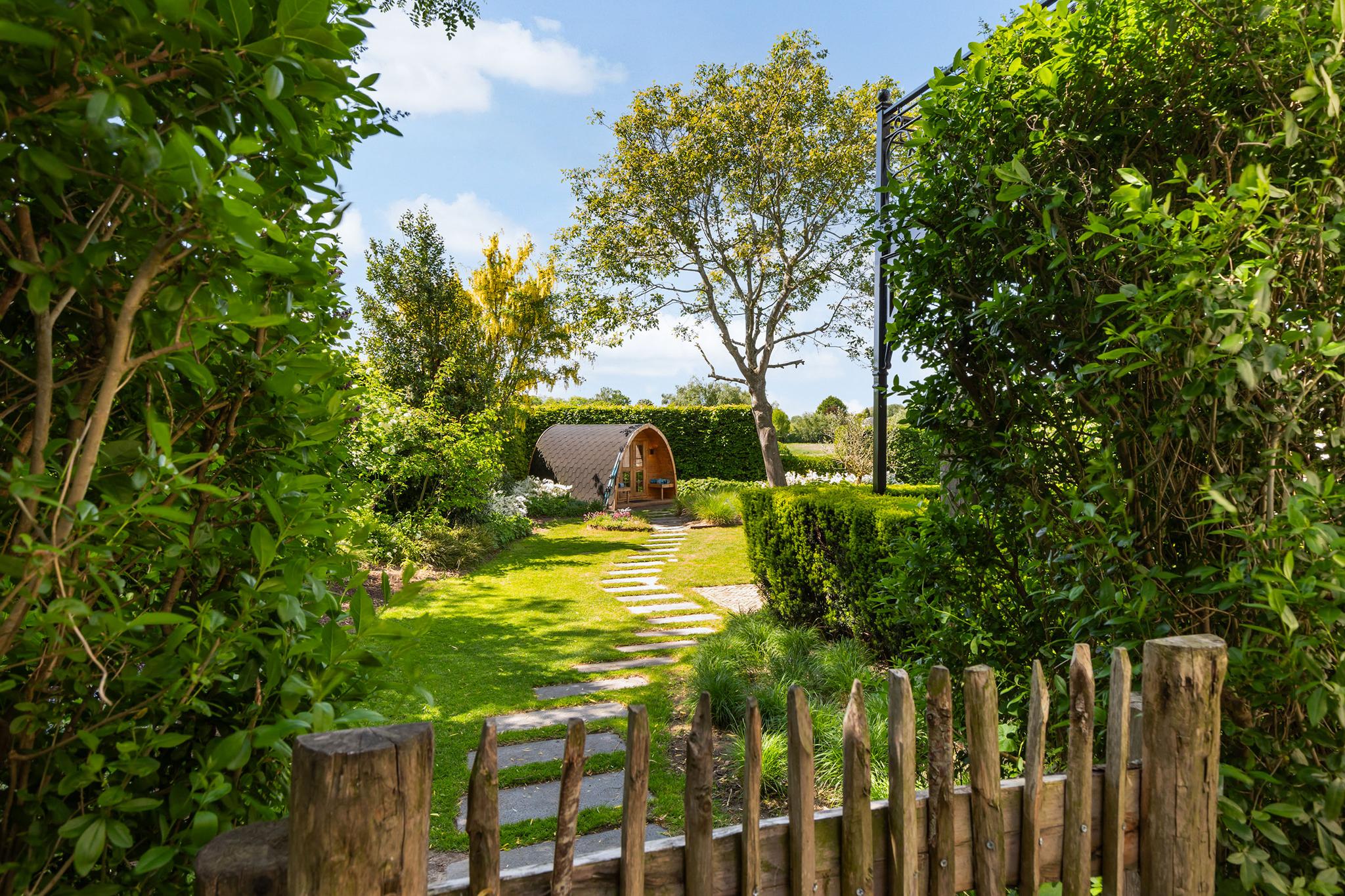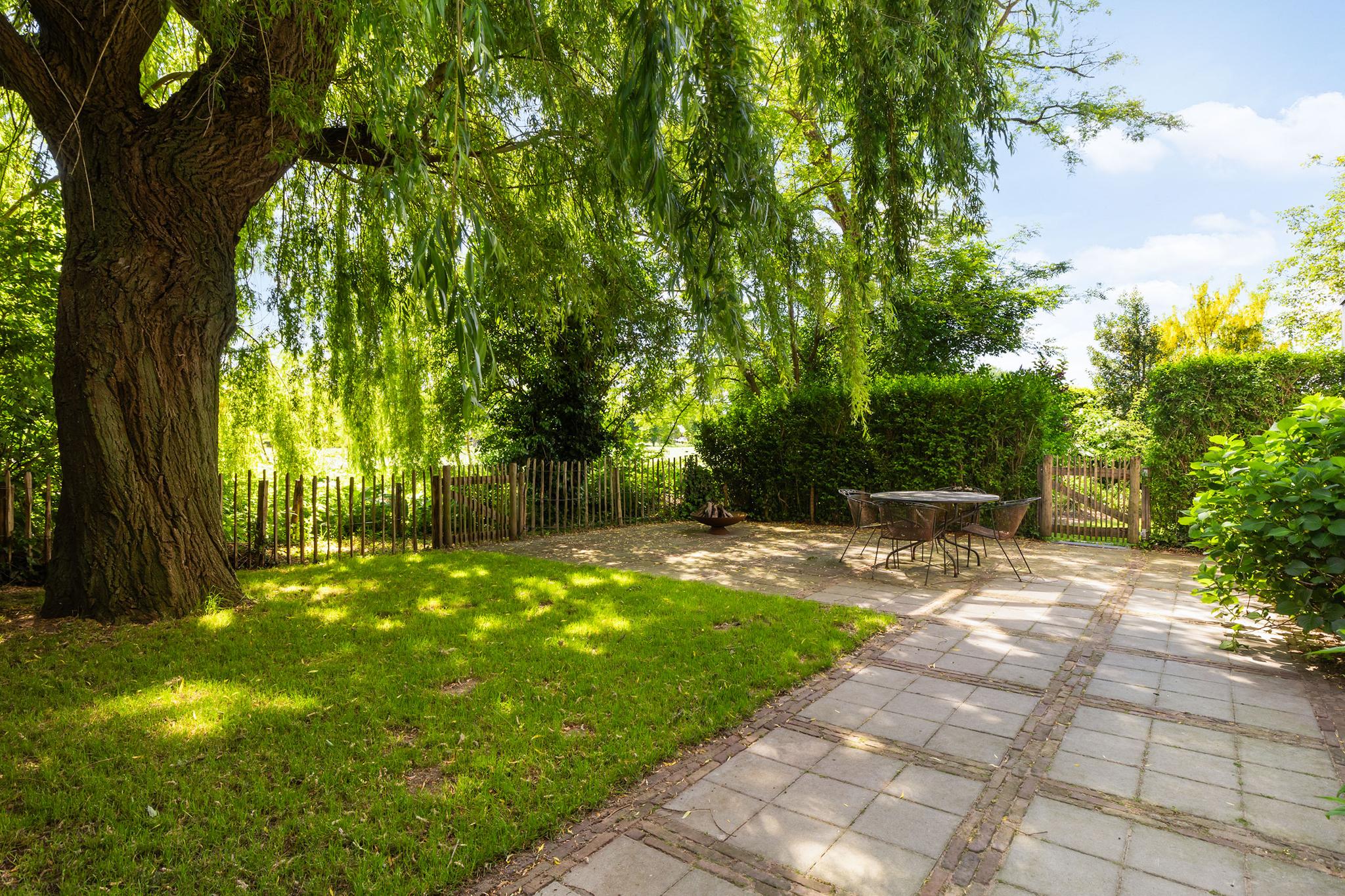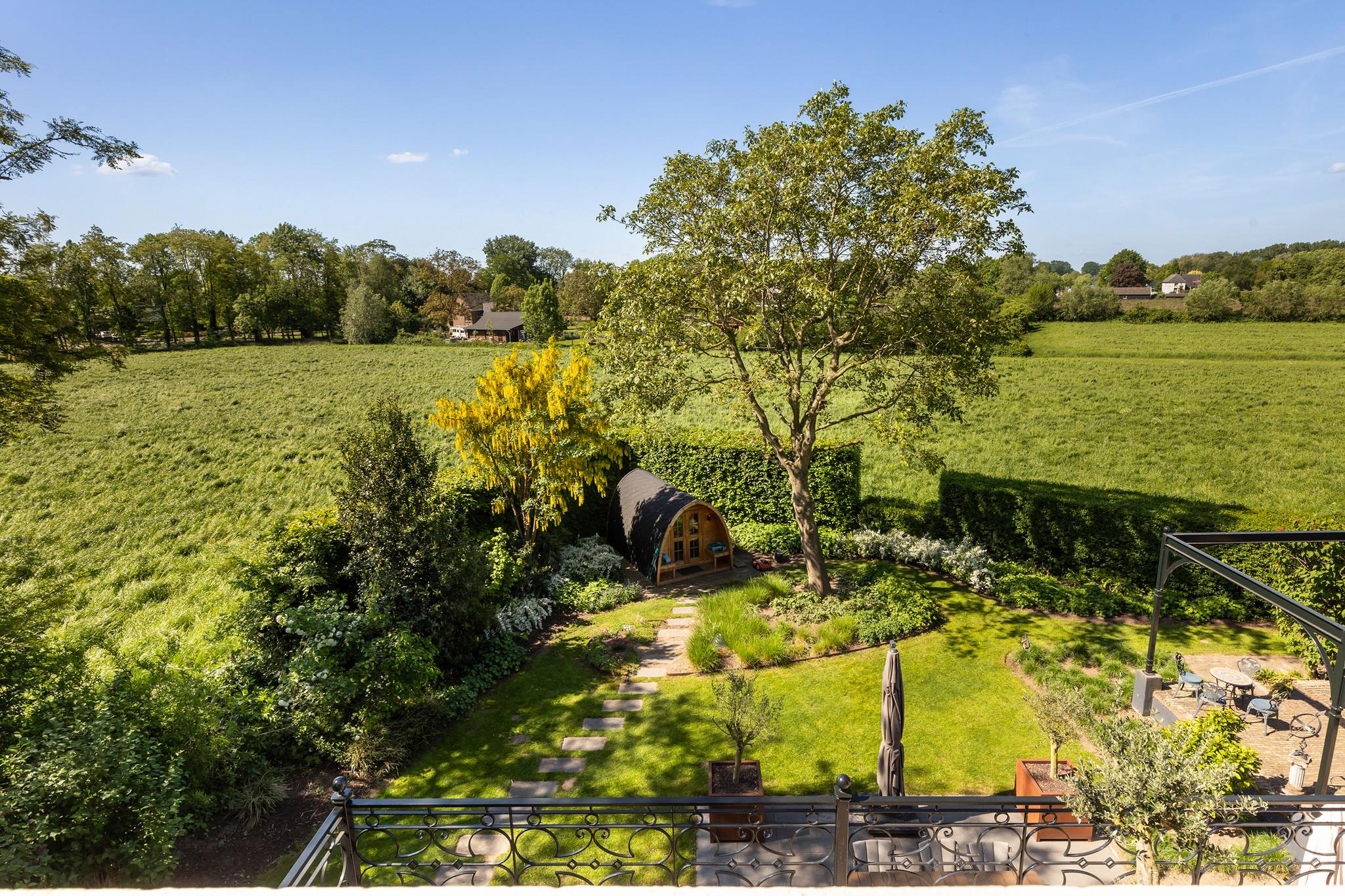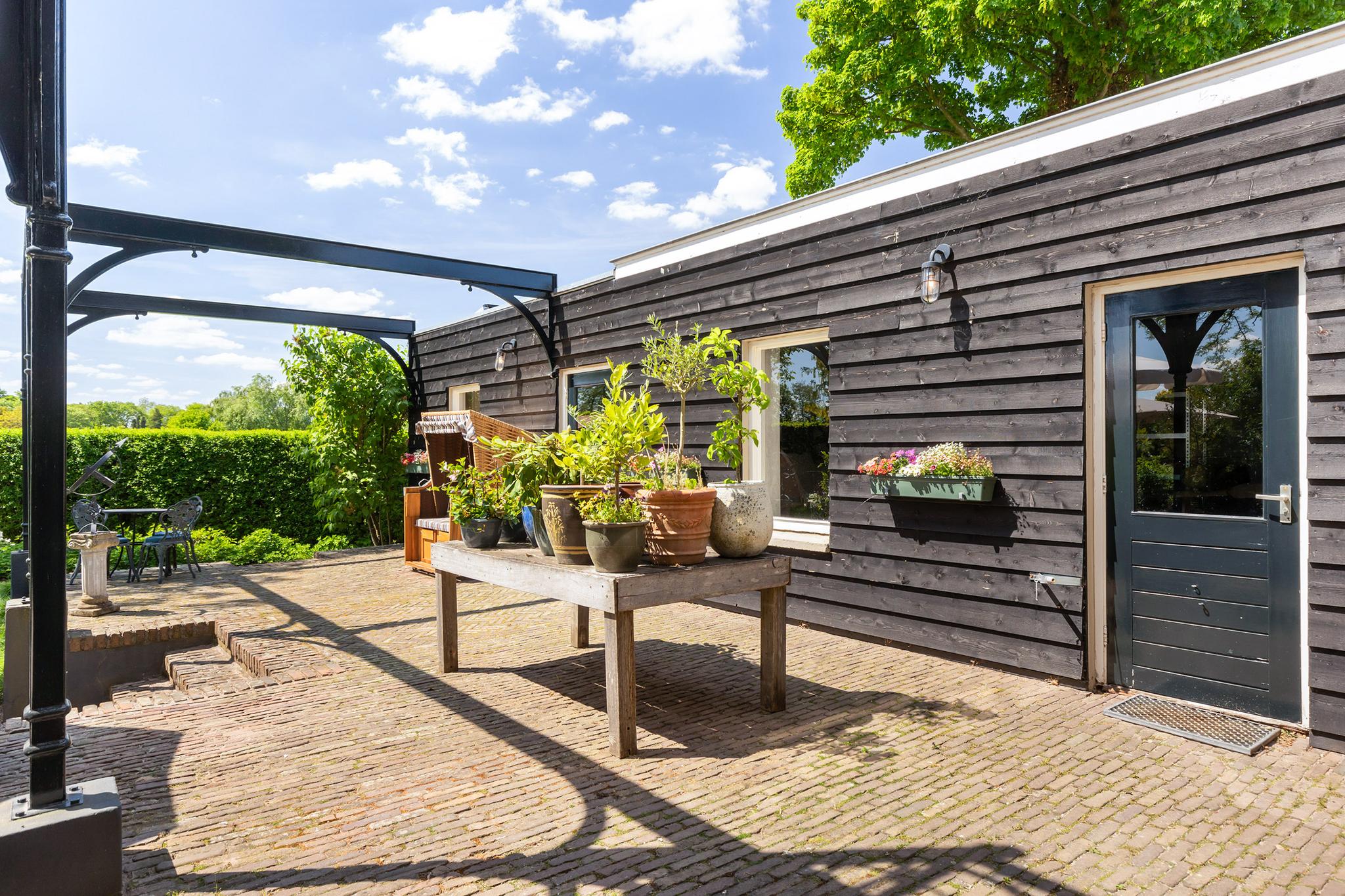 The garden was redesigned in 2022 as an extension of the living space – offering tranquillity, relaxation and a welcoming atmosphere. Features include decorative paving, manicured lawns, an automatic irrigation system fed by a private well, a robotic lawnmower, and multiple terraces for low-maintenance outdoor enjoyment. Hedges of privet, laurel and beech frame the property with natural elegance, while strategic openings offer views of the surrounding polder landscape. Stepping stones lead across the lawn to a half-round log cabin. The wrought-iron pergola and spacious veranda – with timber beamed ceiling and prepared for a jacuzzi and outdoor kitchen – elevate outdoor living to a new level. The main terrace, directly connected to the veranda, comfortably accommodates a large dining table. Mature olive trees in Corten steel planters add a Mediterranean touch. A second garden zone on the side of the plot includes its own terrace, lawn and a majestic weeping willow.