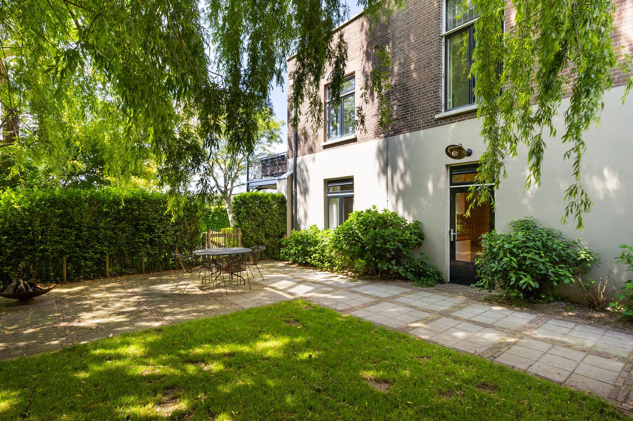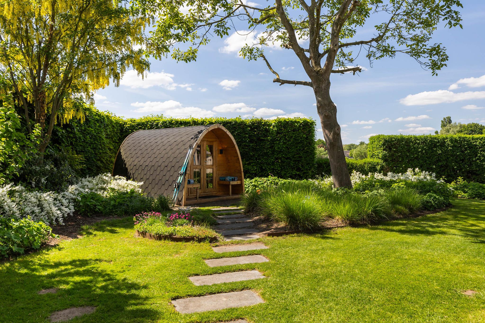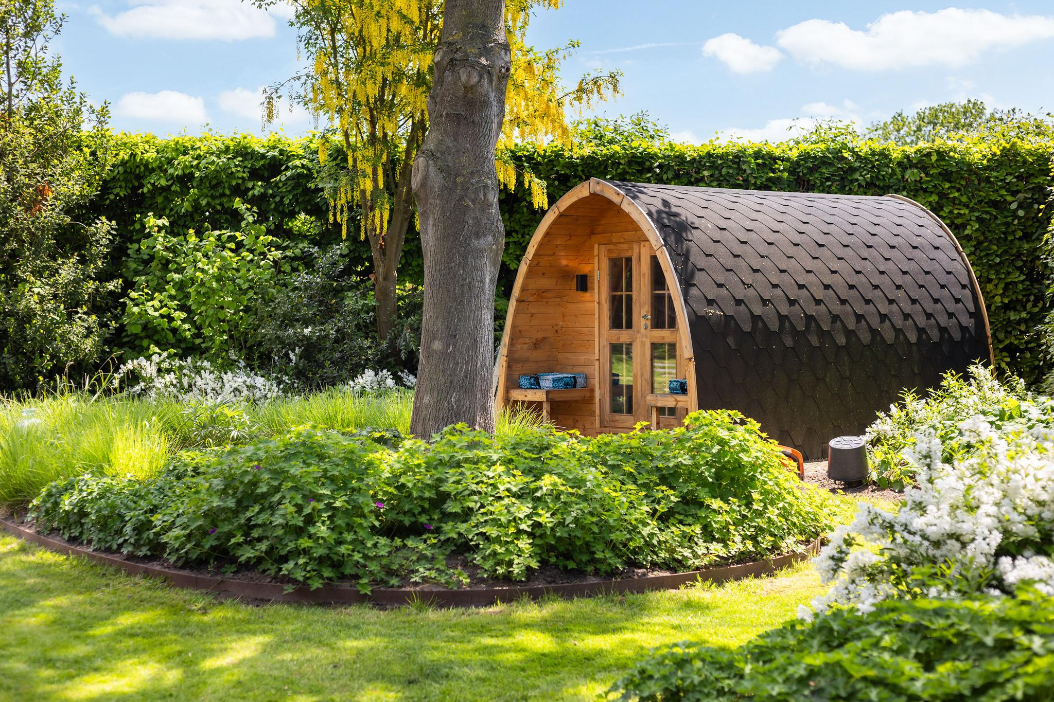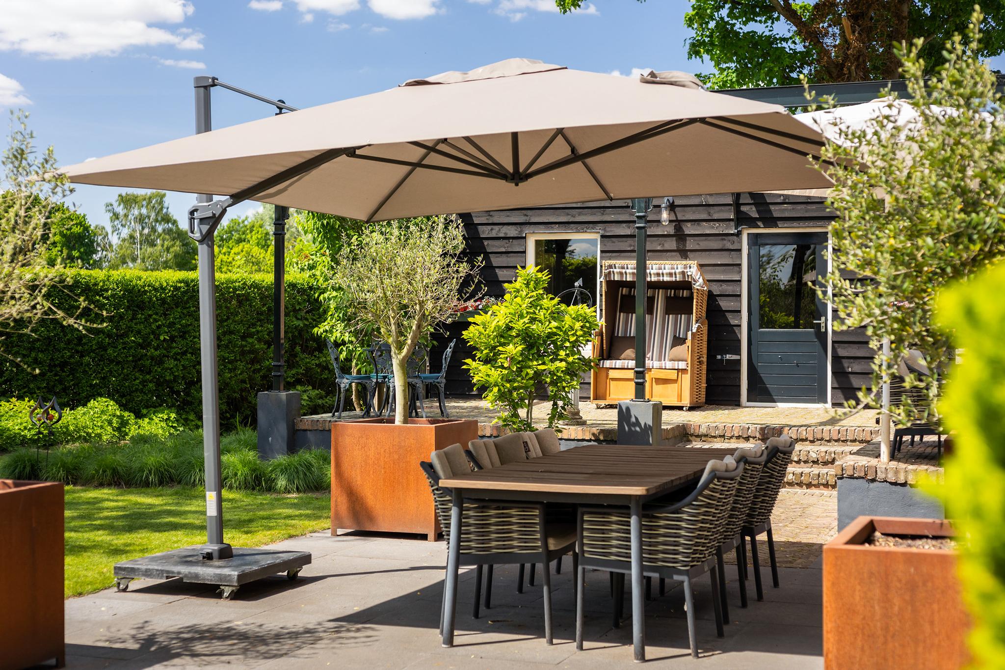 The garden was redesigned in 2022 as an extension of the living space – offering tranquillity, relaxation and a welcoming atmosphere. Features include decorative paving, manicured lawns, an automatic irrigation system fed by a private well, a robotic lawnmower, and multiple terraces for low-maintenance outdoor enjoyment. Hedges of privet, laurel and beech frame the property with natural elegance, while strategic openings offer views of the surrounding polder landscape. Stepping stones lead across the lawn to a half-round log cabin. The wrought-iron pergola and spacious veranda – with timber beamed ceiling and prepared for a jacuzzi and outdoor kitchen – elevate outdoor living to a new level. The main terrace, directly connected to the veranda, comfortably accommodates a large dining table. Mature olive trees in Corten steel planters add a Mediterranean touch. A second garden zone on the side of the plot includes its own terrace, lawn and a majestic weeping willow.