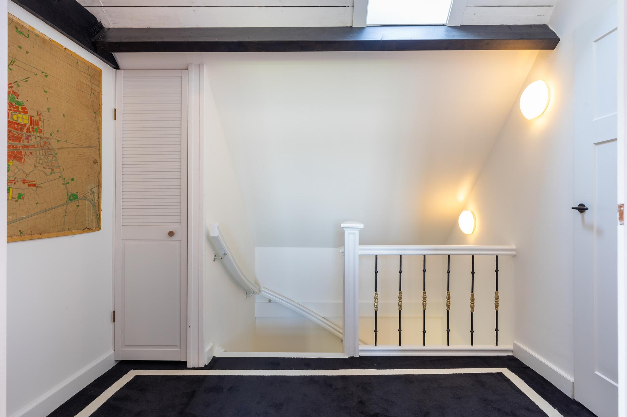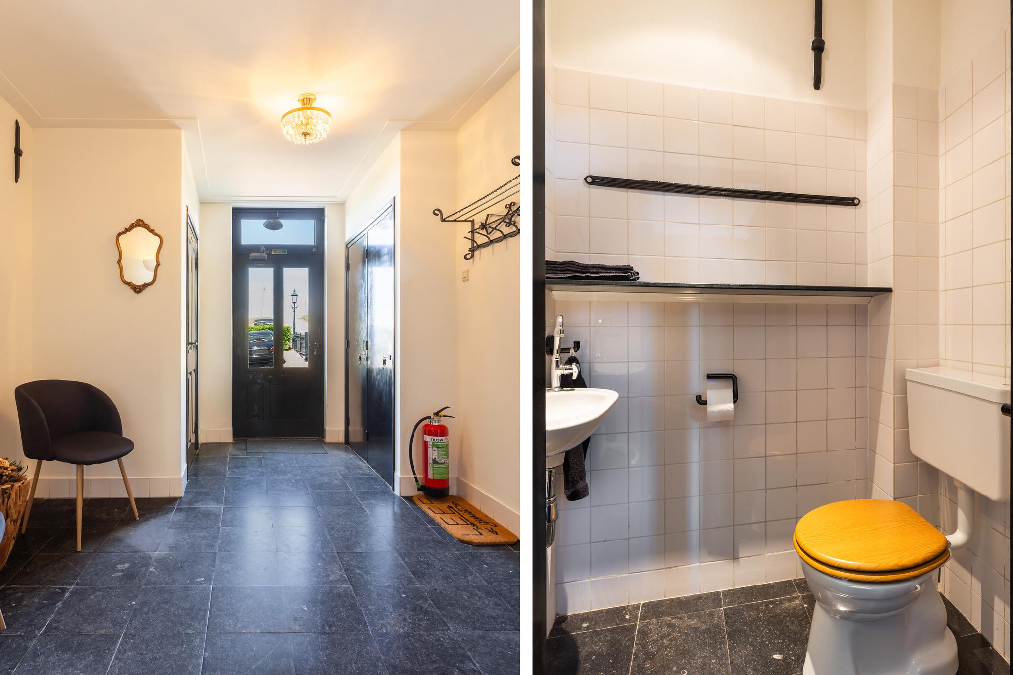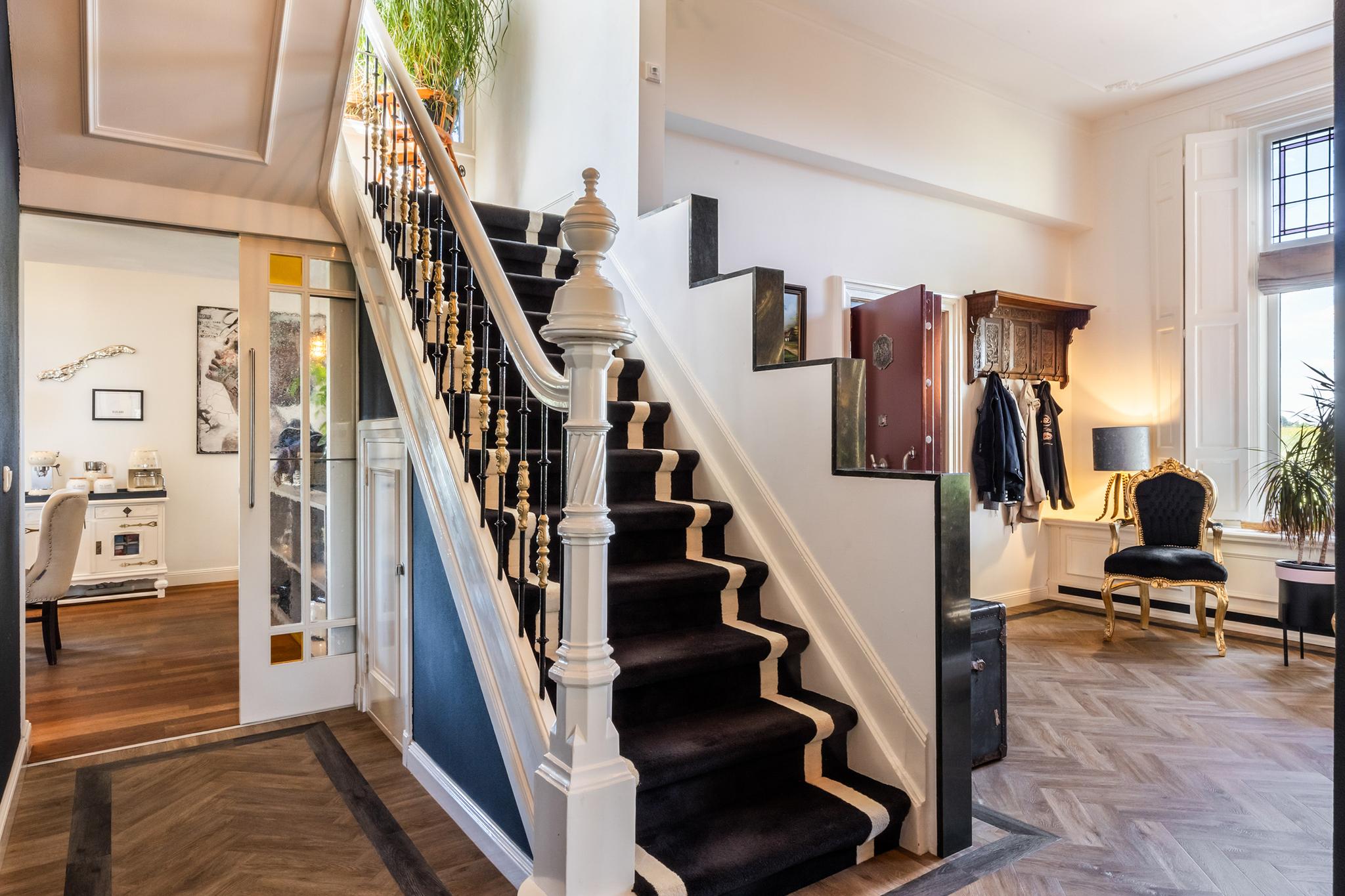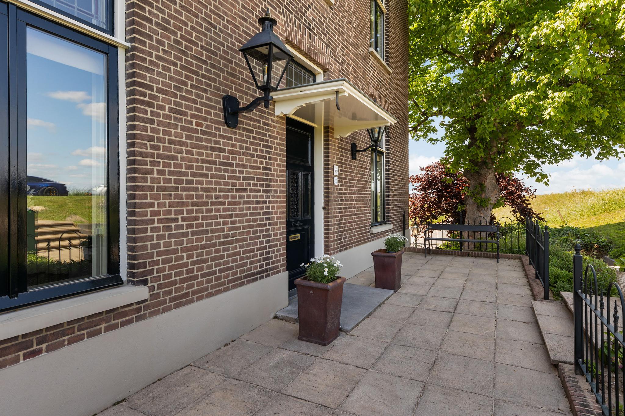 Access to the charming front garden is available via the parking area or directly from the dike, where a staircase with landings leads to the original front door, adorned with wrought-iron railings and flanked by inviting benches – a nod to the property’s elegant past.