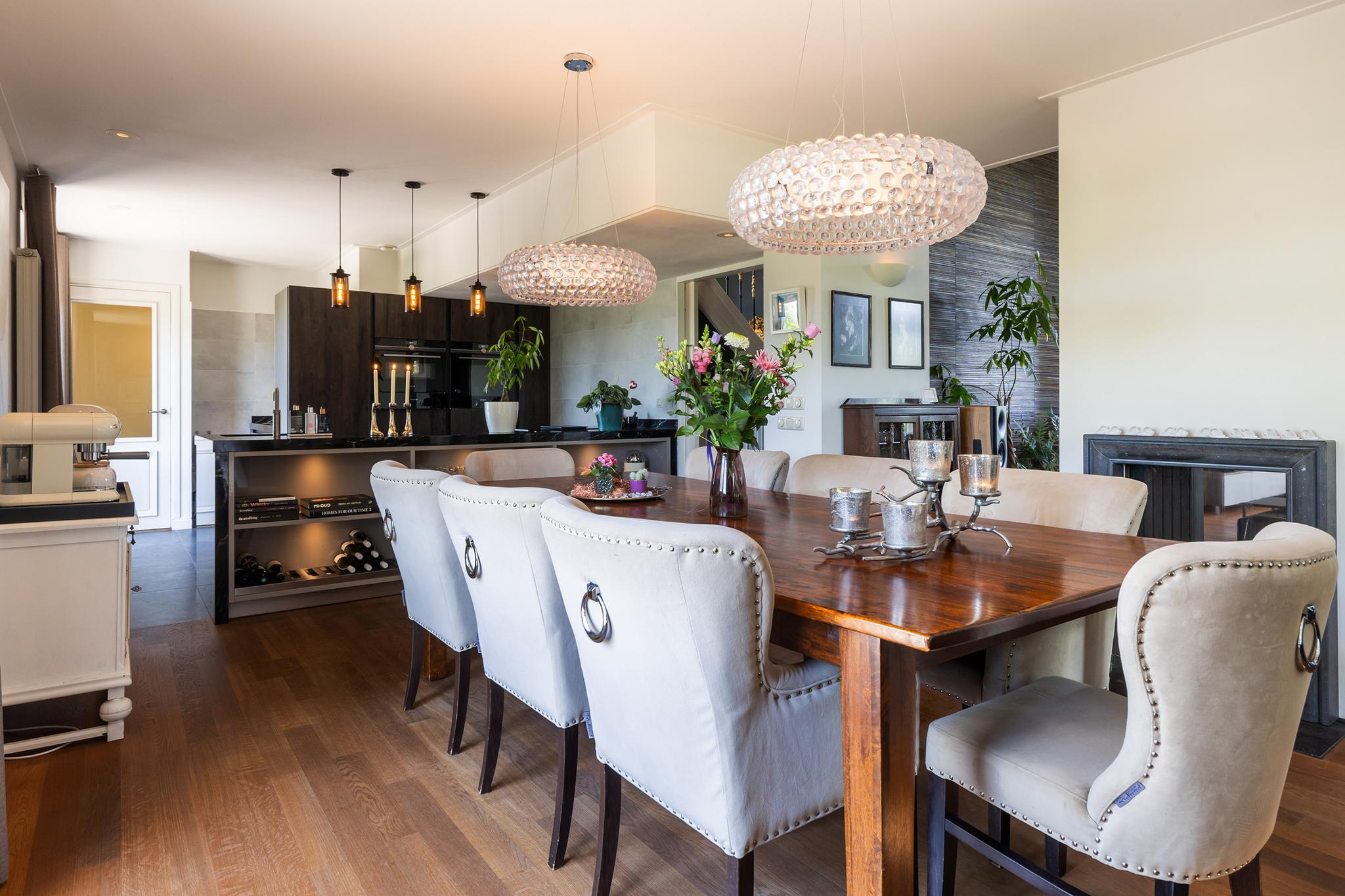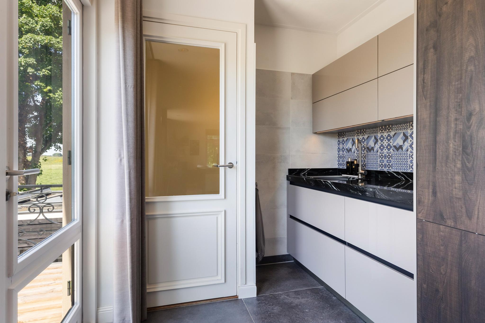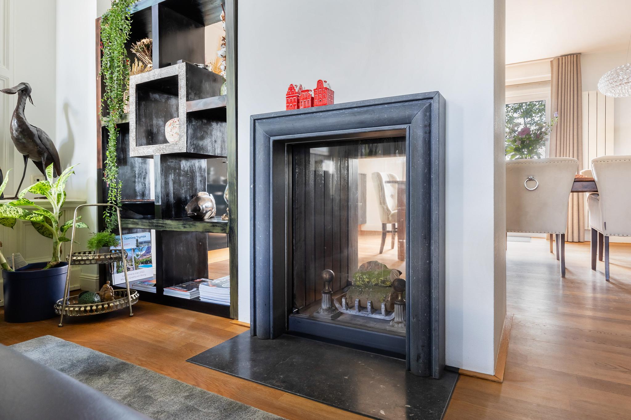 The villa spans four floors, offering a wealth of possibilities for living and working. The main living level sits at dike height and features a refined living space where atmosphere, comfort and panoramic views converge. Adjacent to the entrance hall is a generous study with a character fireplace and views over the rivers. The living room, dining area and kitchen flow seamlessly into one another, connected by an elegant see-through fireplace. French doors open onto a spacious balcony, offering uninterrupted views over the water and surrounding countryside – a truly captivating panorama that never ceases to inspire.