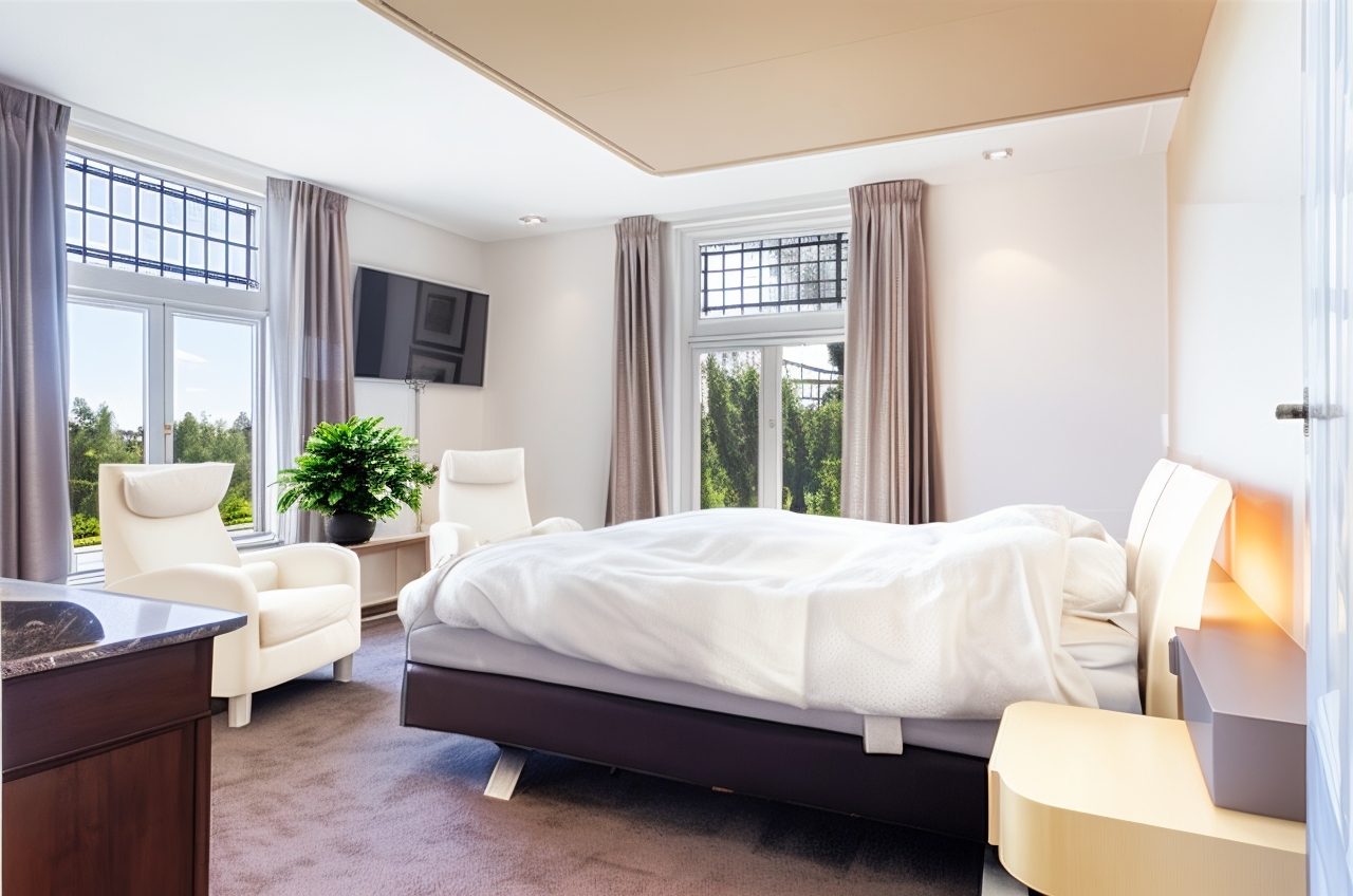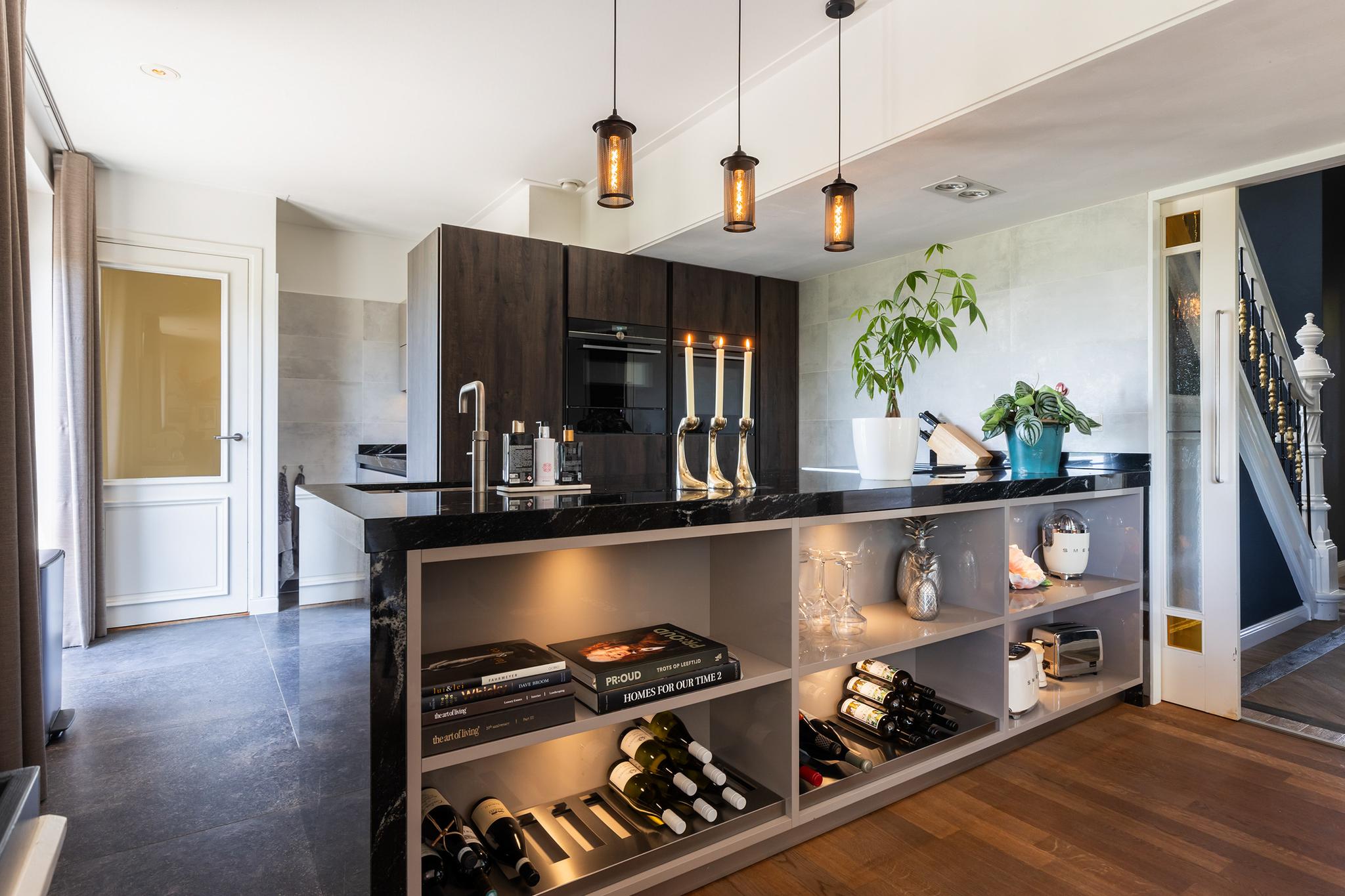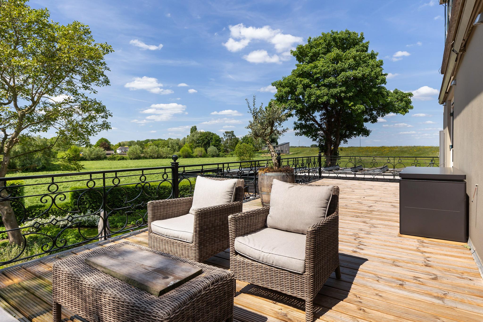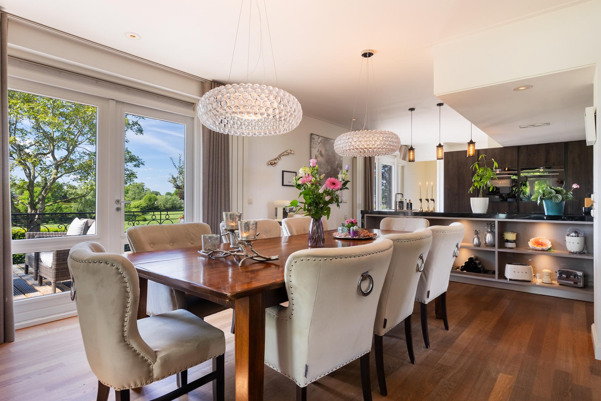 The villa spans four floors, offering a wealth of possibilities for living and working. The main living level sits at dike height and features a refined living space where atmosphere, comfort and panoramic views converge. Adjacent to the entrance hall is a generous study with a character fireplace and views over the rivers. The living room, dining area and kitchen flow seamlessly into one another, connected by an elegant see-through fireplace. French doors open onto a spacious balcony, offering uninterrupted views over the water and surrounding countryside – a truly captivating panorama that never ceases to inspire.