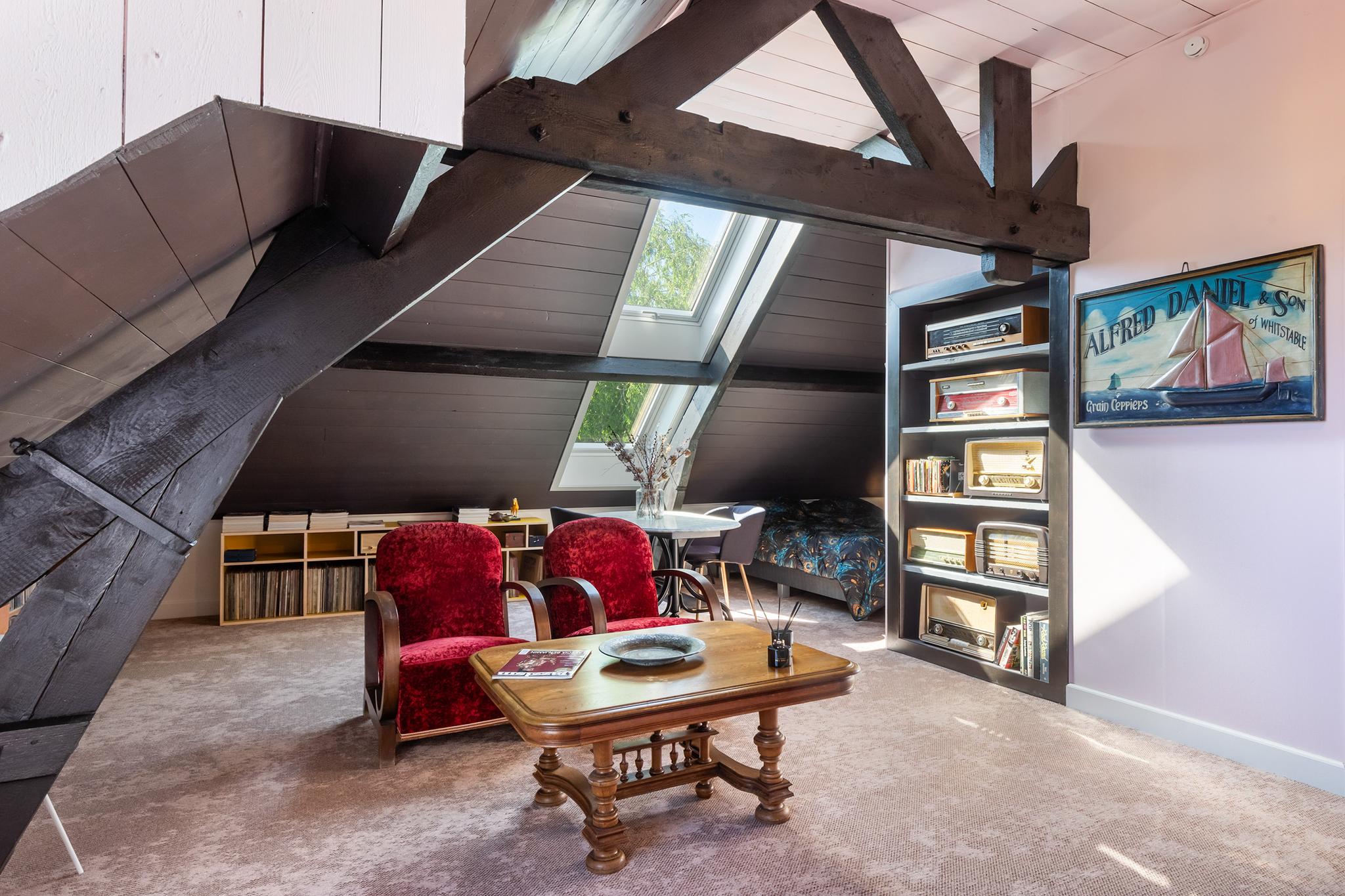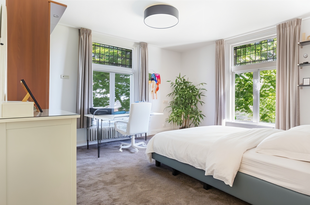 One of the home’s highlights is the conservatory on the first floor: fully restored and offering breathtaking views of the passing river traffic, the expansive landscape, and the setting sun. This space is ideal as a lounge, library or tranquil retreat, perfectly complemented by the adjoining intimate roof terrace. The first floor also features three comfortable bedrooms, a walk-in wardrobe, and a luxurious bathroom with bath, shower, twin basins and a toilet. The second floor accommodates a charming fourth bedroom with its own shower and washbasin, plus additional storage space suitable for a home office or playroom. All rooms are beautifully finished and offer views of the exceptional surroundings.