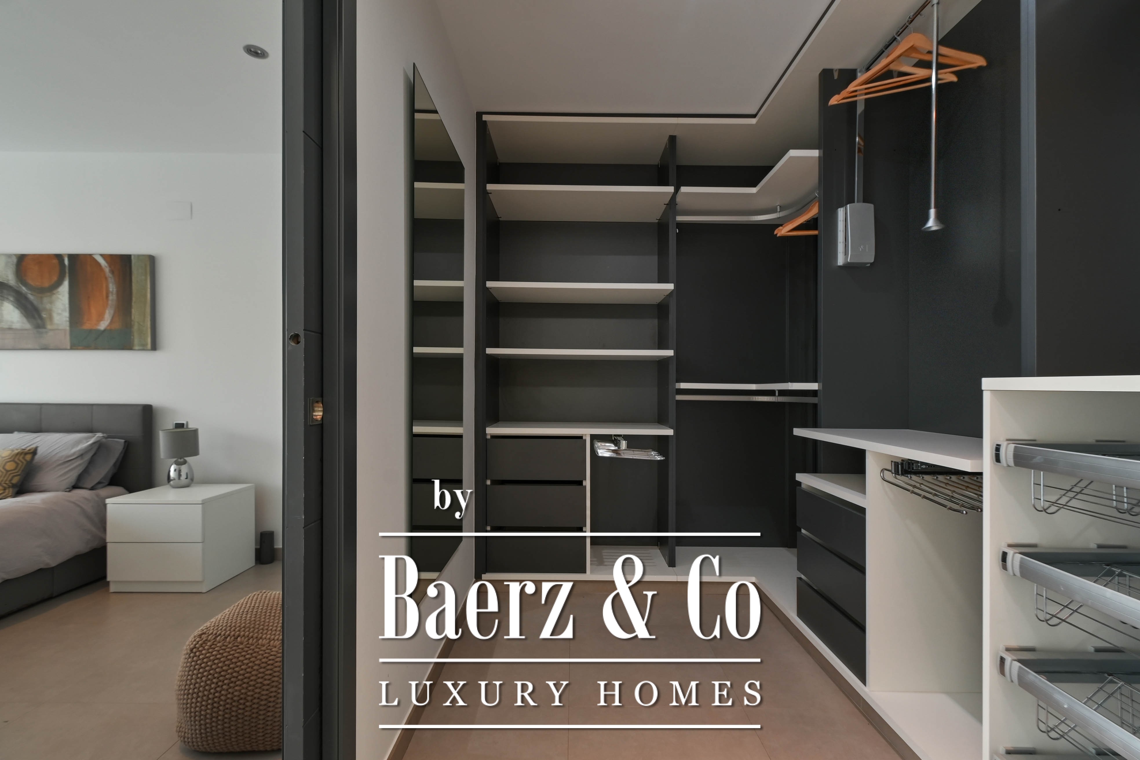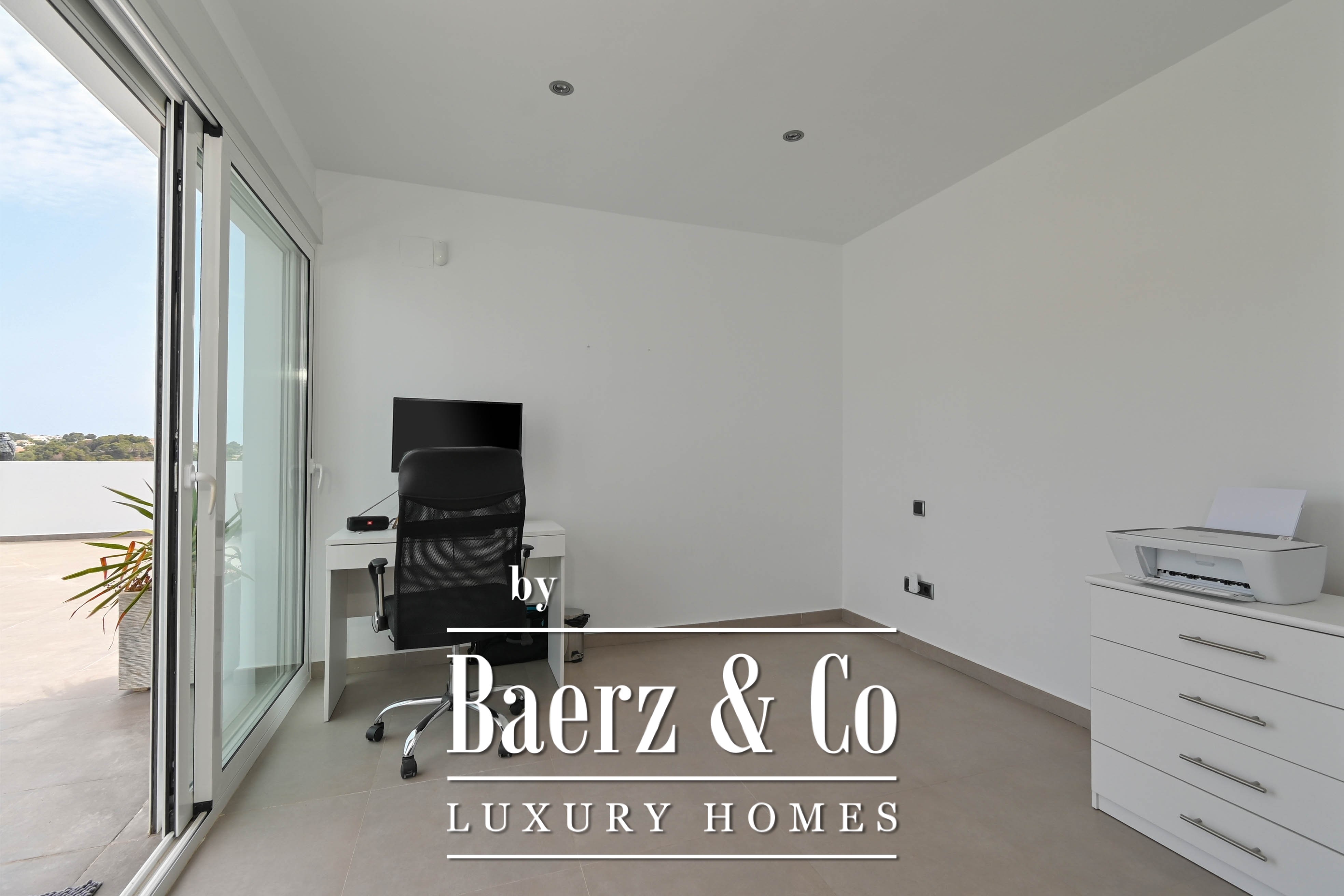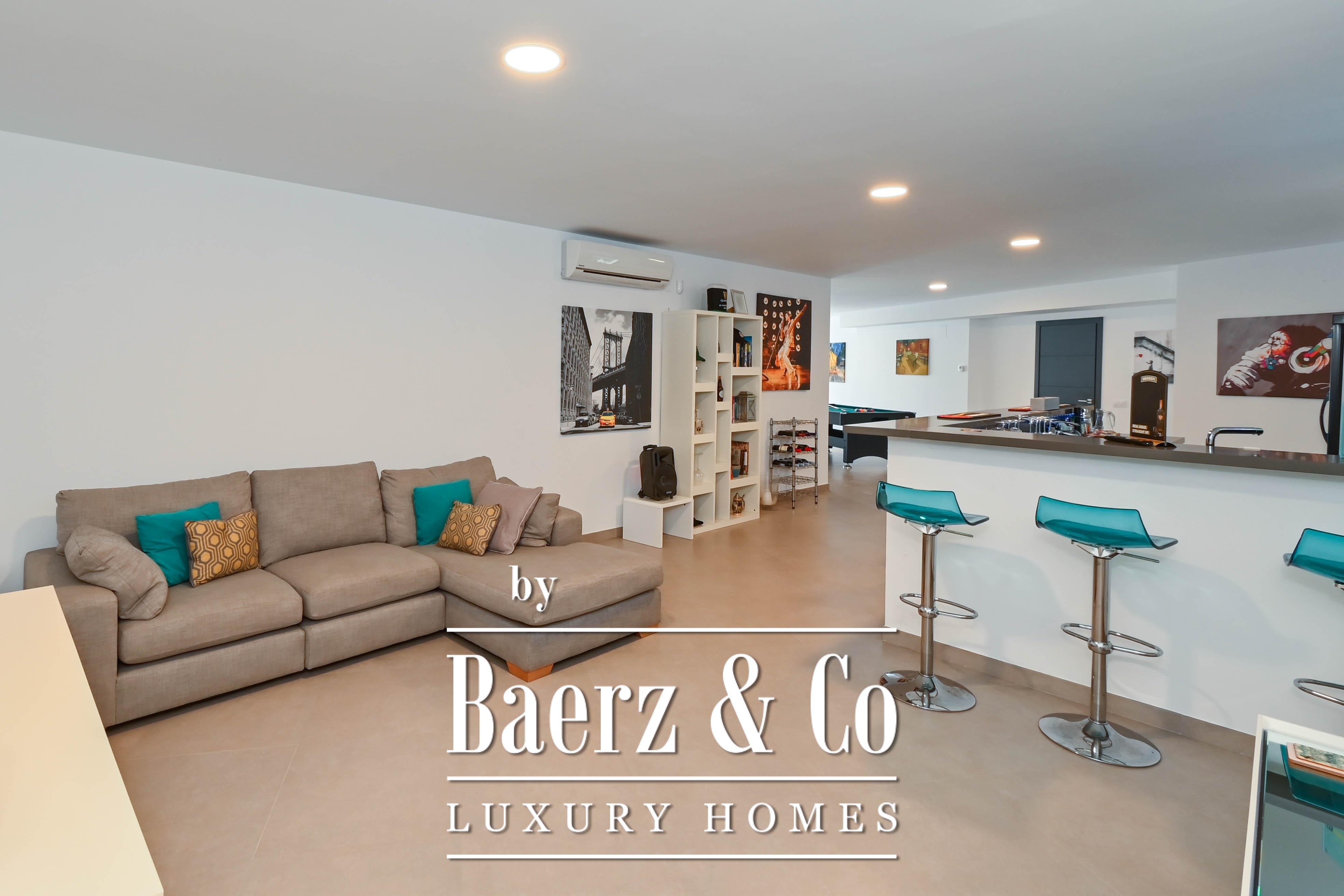 The open kitchen with central island is fully integrated into the living area and forms the heart of the home. Thanks to the large windows, the entire living space enjoys natural light and direct access to the terrace, the pool, and the pleasant outdoor areas – perfect for those who love Mediterranean outdoor living.