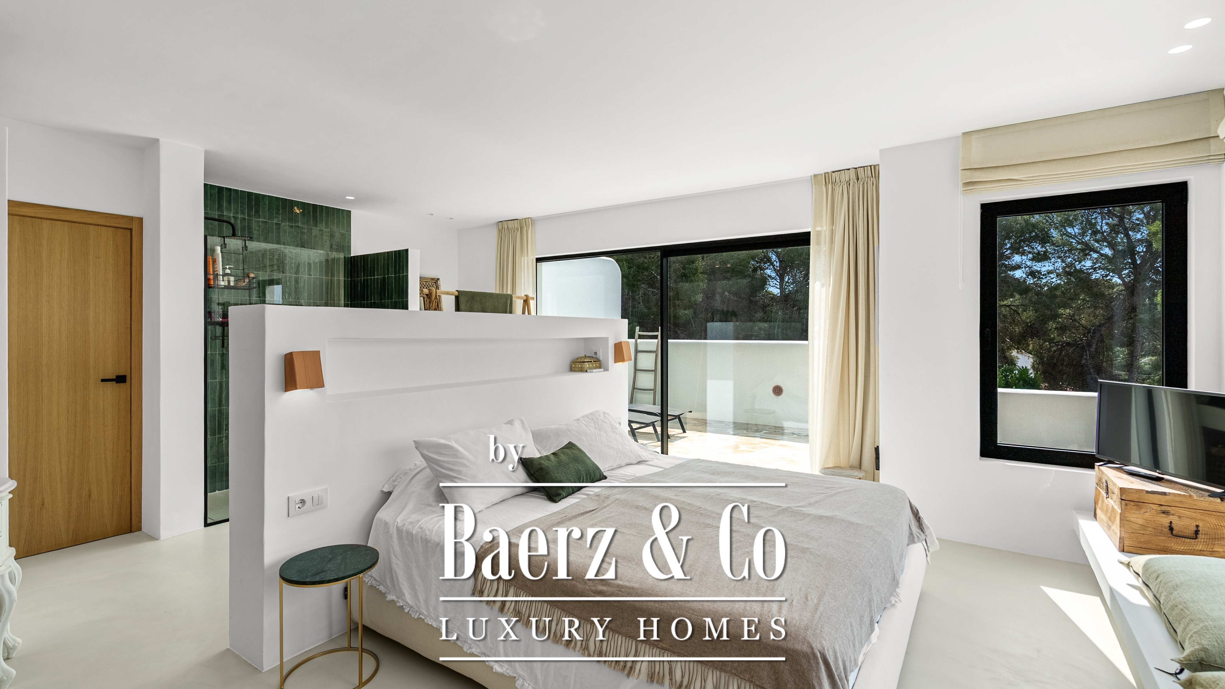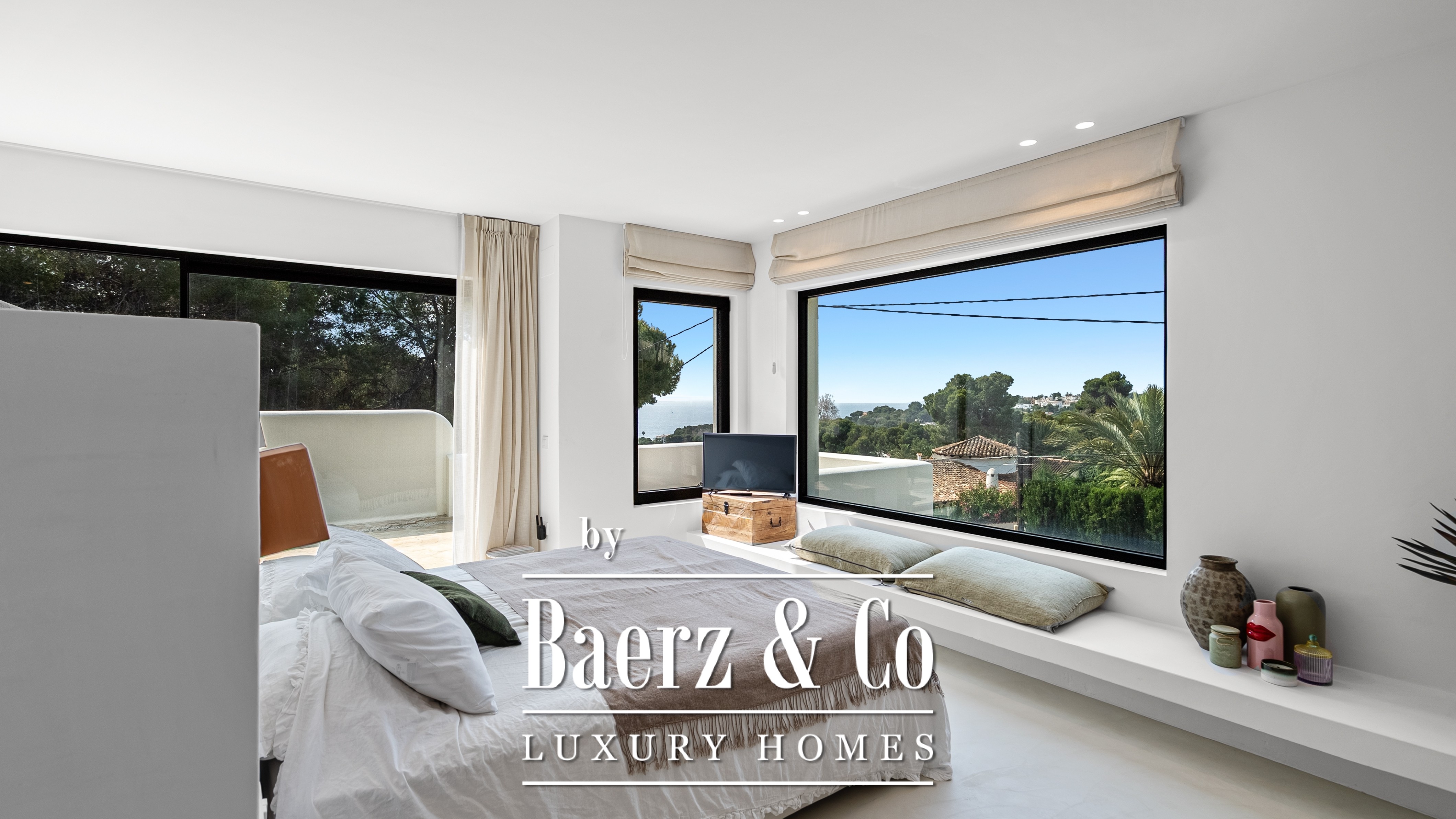 The villa offers four spacious bedrooms and three refined bathrooms, including a master suite with a unique detail: sea views even from the shower – a daily touch of luxury.