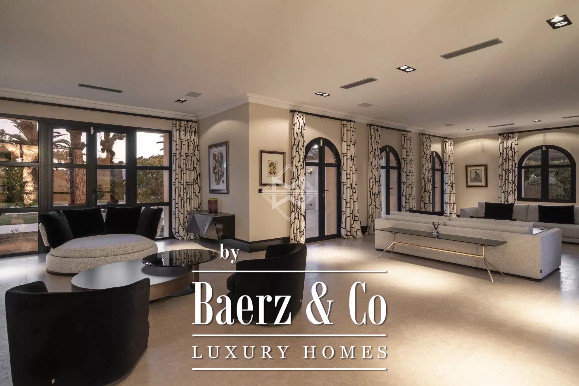 Inside, Villa Mougins is composed of spacious reception areas, an expansive Gaggenau-equipped kitchen, and five en suite bedrooms, anchored by a serene master suite on the main level. Additional living spaces include a family room with a study and TV lounge, alongside practical features such as a laundry and enclosed garage.