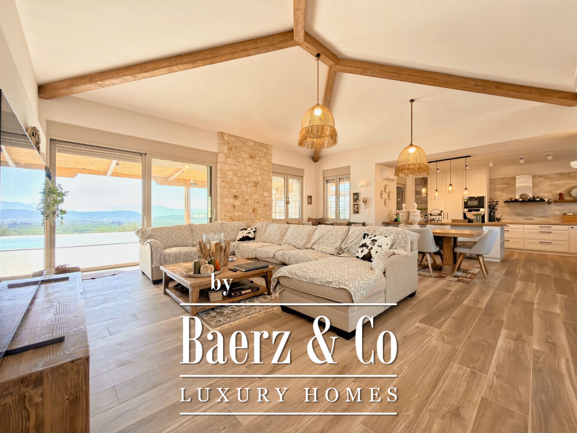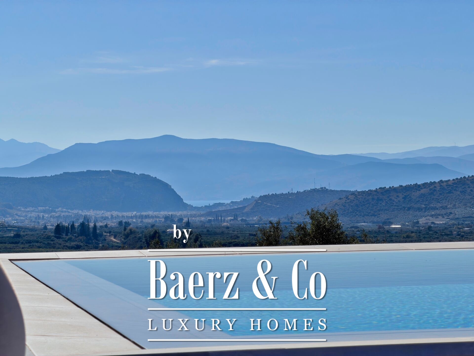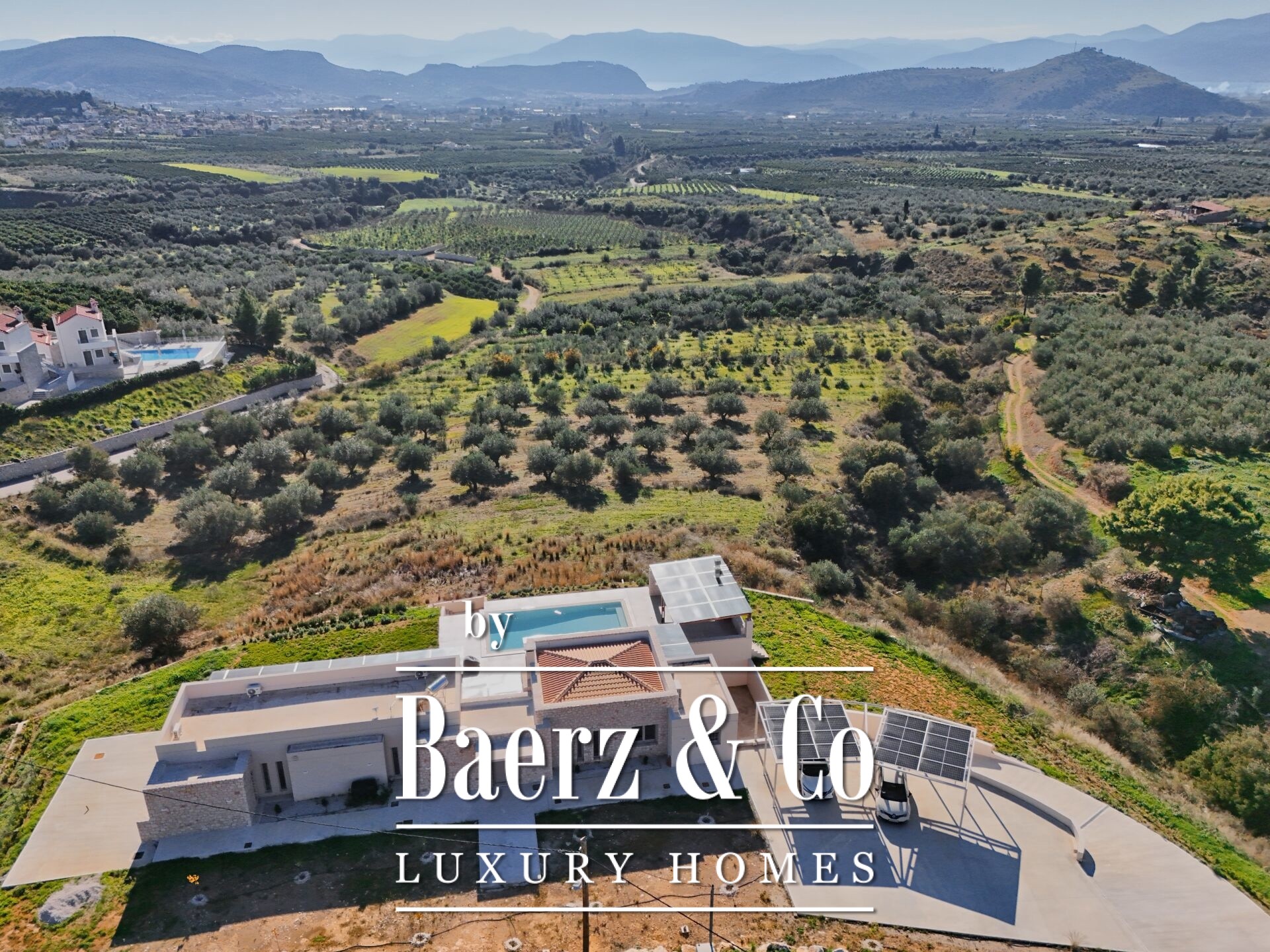 Luxury villa Nafplio presents a rare opportunity to inhabit a contemporary residence in one of Greece’s most tranquil and visually compelling locations. This 232 m² ground-floor home gracefully inhabits a 5,255 m² plot, where panoramic views over Nafplio and a western orientation invite natural light deep into each space, creating a rhythm of openness that aligns with the surrounding landscape.