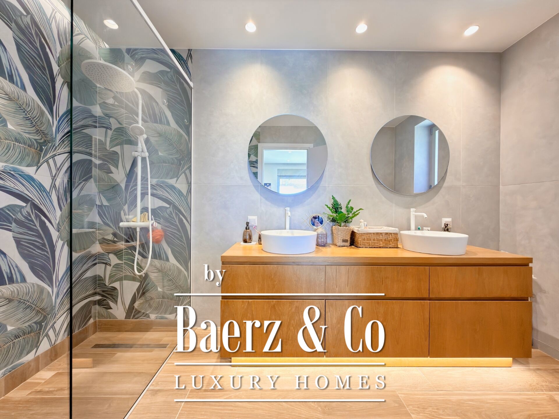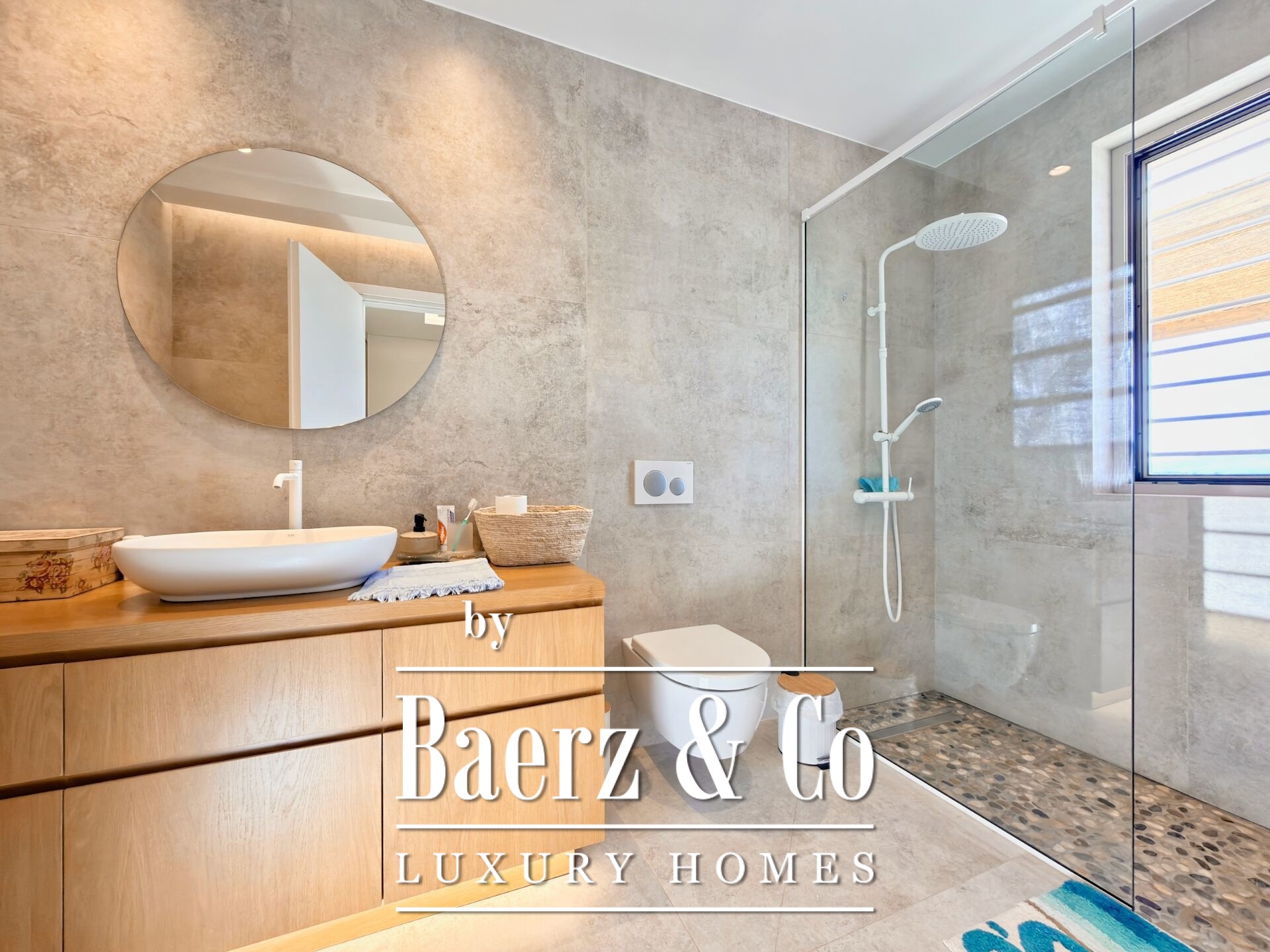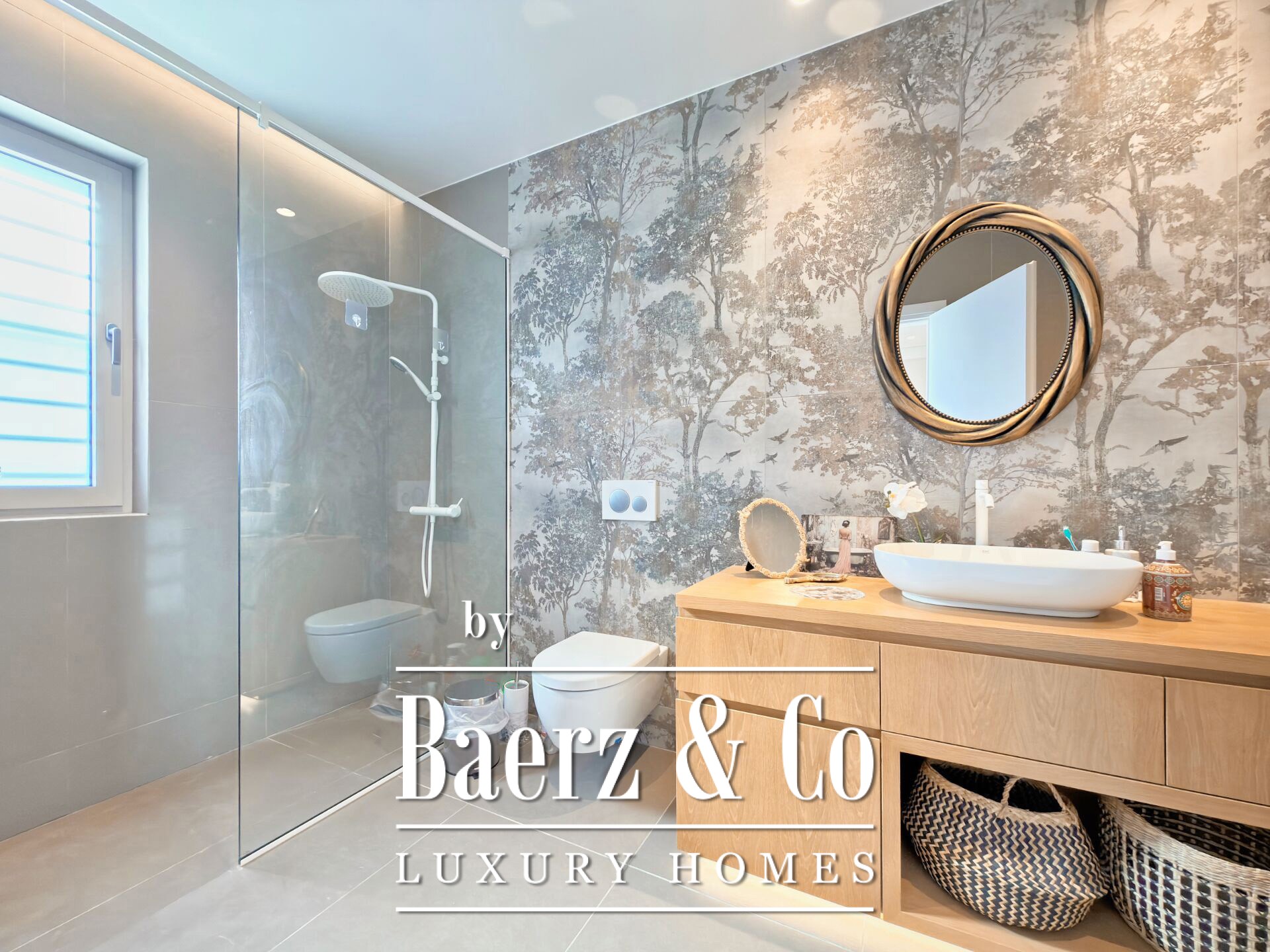 Outdoors, the restrained elegance of the courtyard is anchored by a 50 m² swimming pool and an expansive BBQ area beneath oak pergolas. With unobstructed mountain, sea, and nature views, the boundaries between inside and out dissolve effortlessly. A 47 m² basement accommodates parking and storage, while a photovoltaic system enhances self-sufficiency. This villa possesses the serenity of a country estate, yet delivers the comfort of a thoughtfully crafted home, tailored for all seasons.