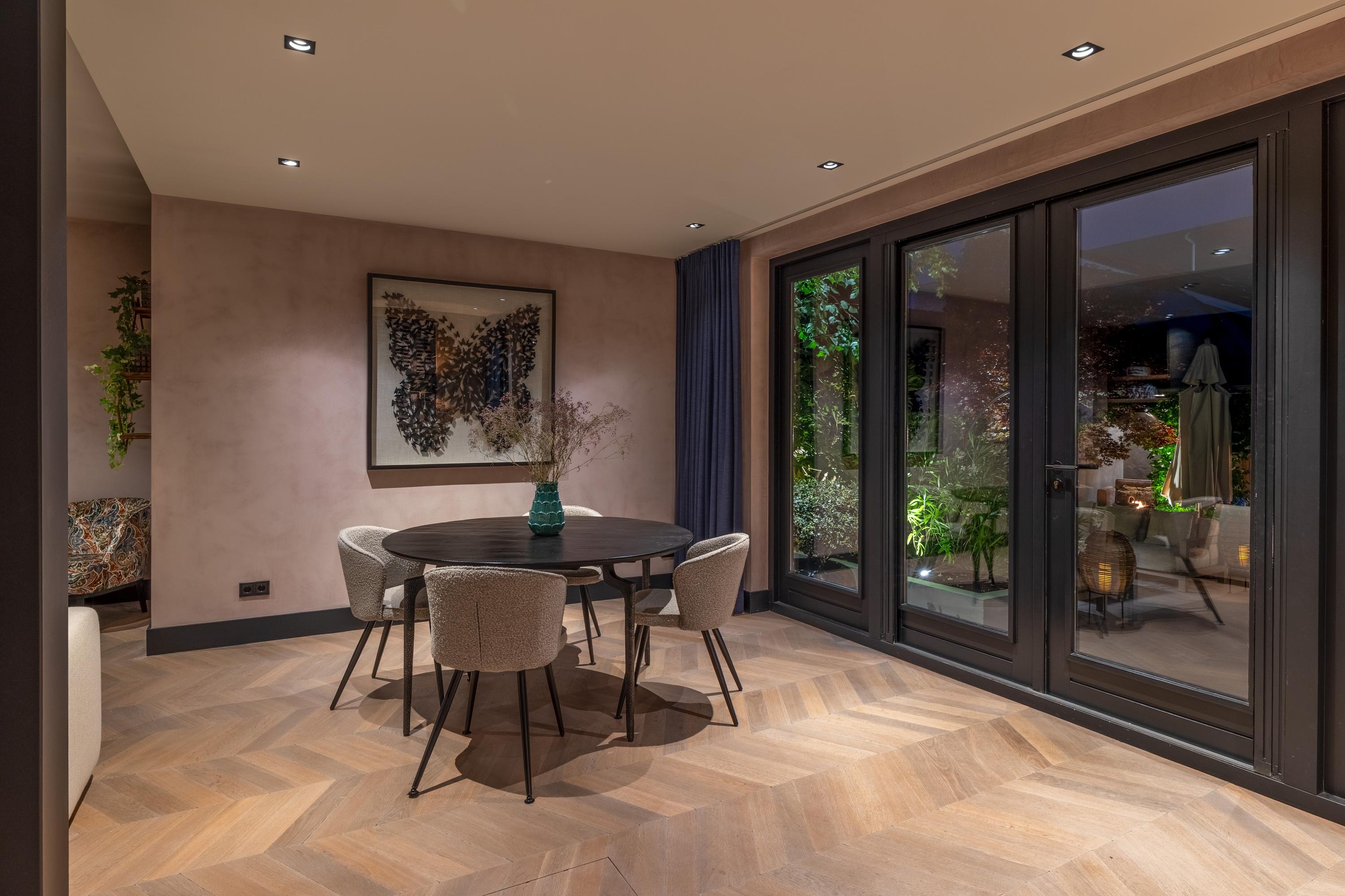De begane grond biedt volop ruimte om te leven, te koken en te ontspannen. De inrichting is harmonieus, met aandacht voor detail – van de perfecte verlichting tot aan de luxueus uitgevoerde afwerking van vloeren, wanden en ingebouwde elementen. Alles draagt bij aan een sfeer van ingetogen luxe.