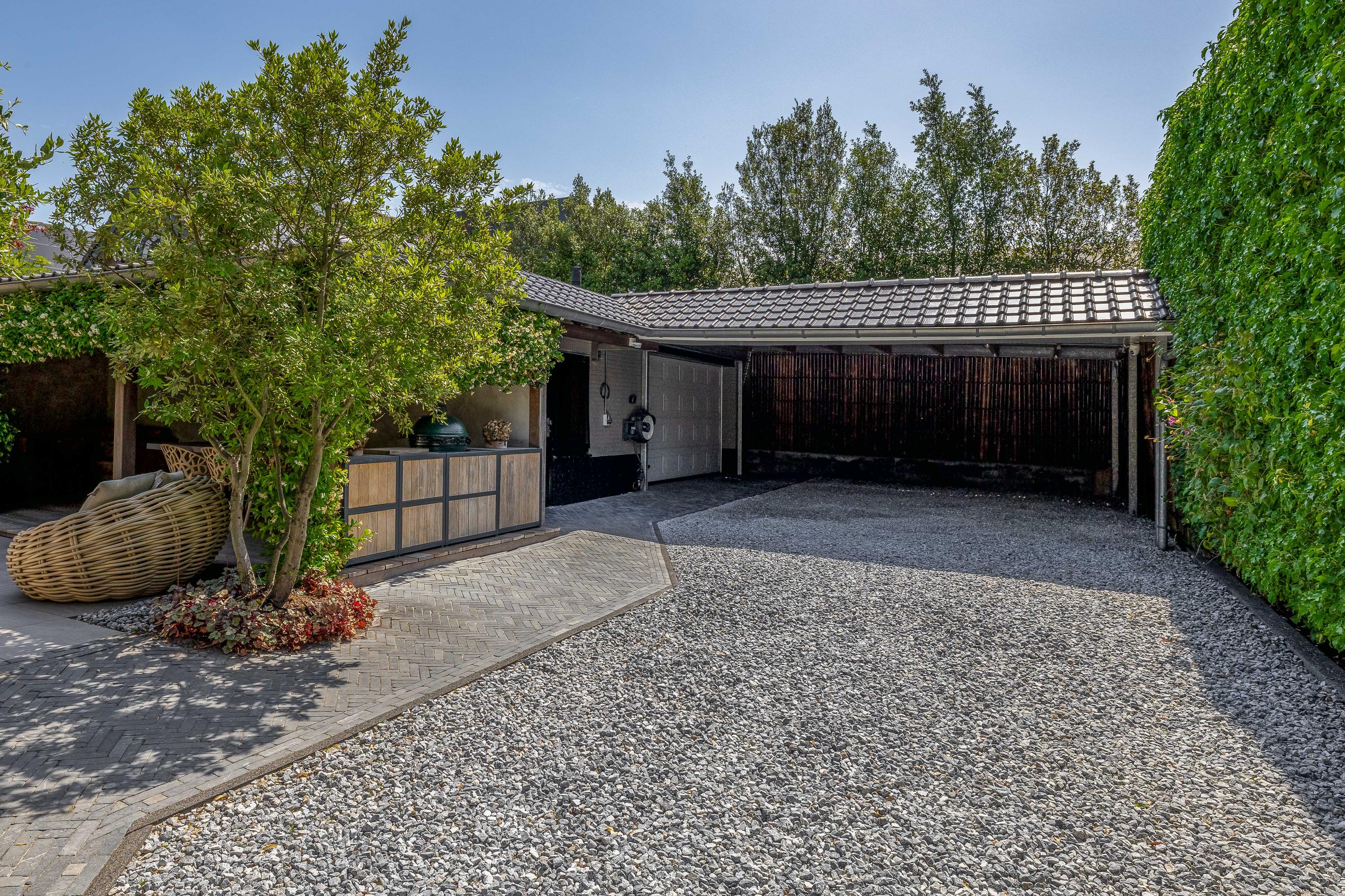 Achterin de tuin bevindt zich een stijlvolle overkapping met buitenkeuken en open haard – perfect voor ontspannen zomeravonden.