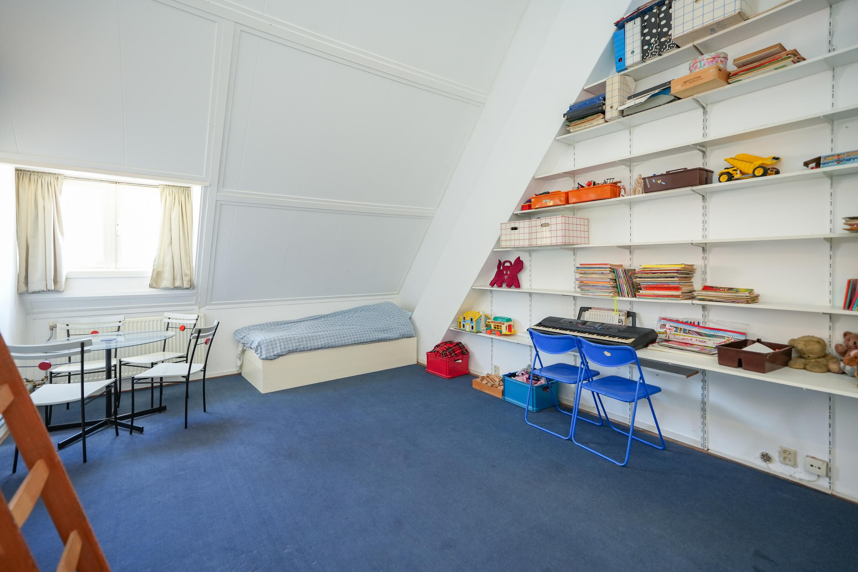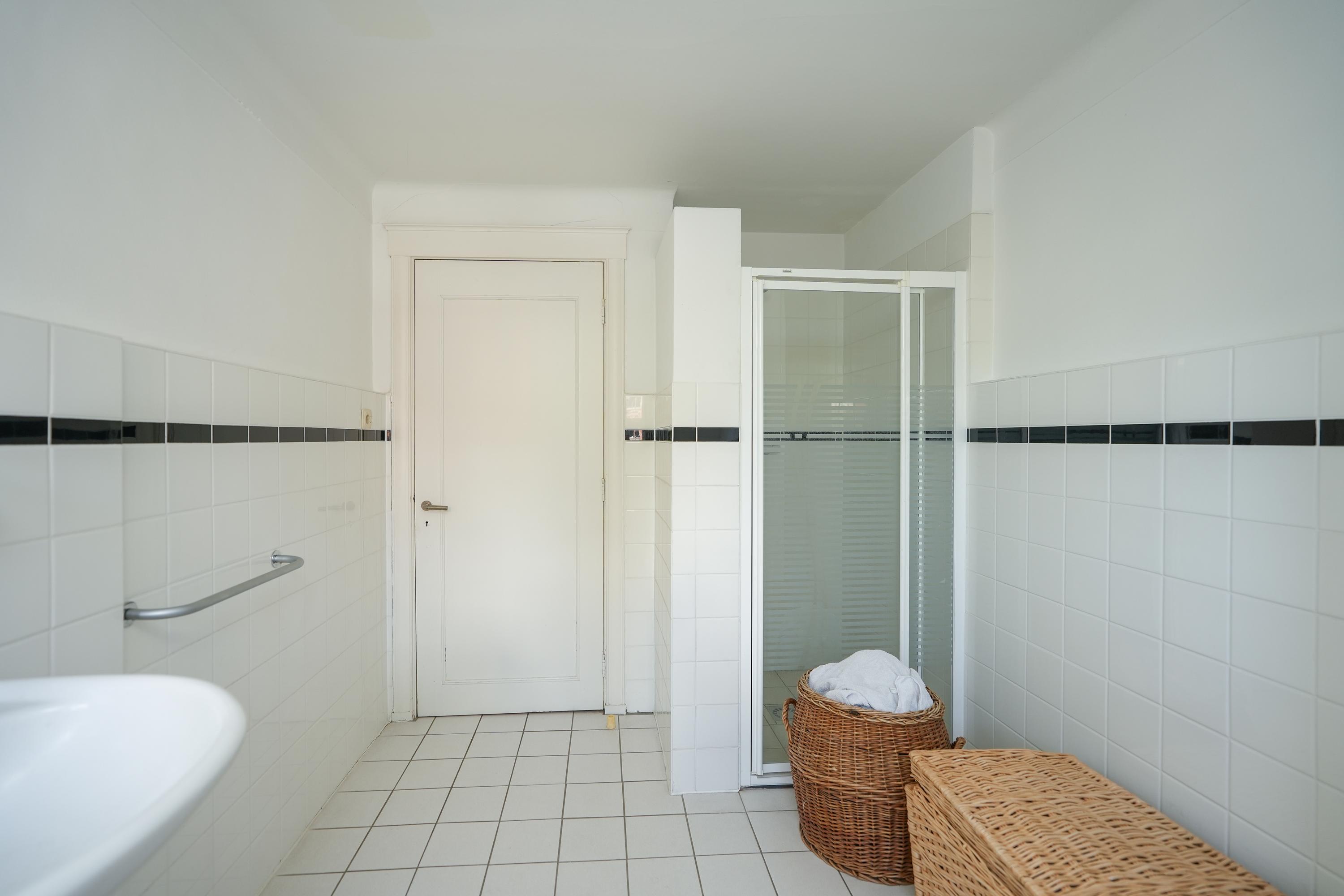Overloop met bergkast en vaste trap naar de 2e verdieping. Op deze etage bevinden zich drie van de zes slaapkamers. De slaapkamer aan de voorzijde beschikt over vaste kasten en openslaande deuren naar het balkon. De grootste slaapkamer aan de achterzijde is voorzien van vaste kasten, een fraaie schouw en openslaande deuren naar het dakterras, vanwaar je mooi uitkijkt over de groene achtertuin. De derde slaapkamer heeft een praktische kastenwand. De ruime badkamer is uitgerust met een ligbad, een douche en een dubbele wastafel. Daarnaast is er een separaat toilet met fonteintje.