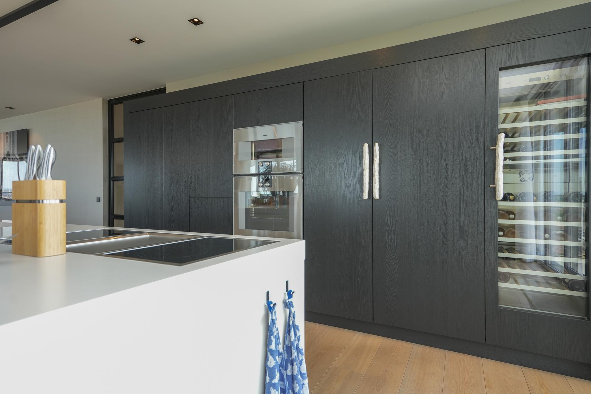 • Contemporary kitchen, designed by interior designer Pieter Laureys, with luxury fitted appliances including a steam oven, microwave, plate warmer, built-in griddle, boiling water tap and a wine refrigerator.