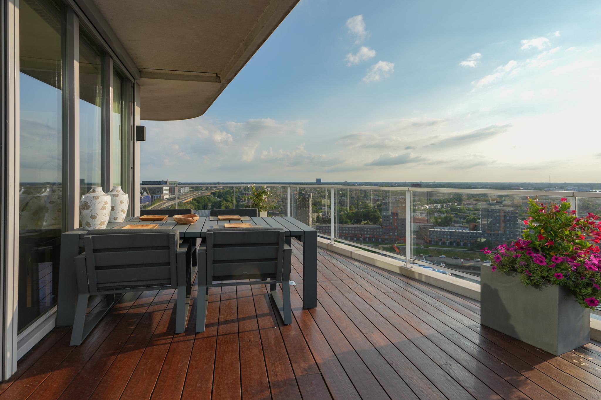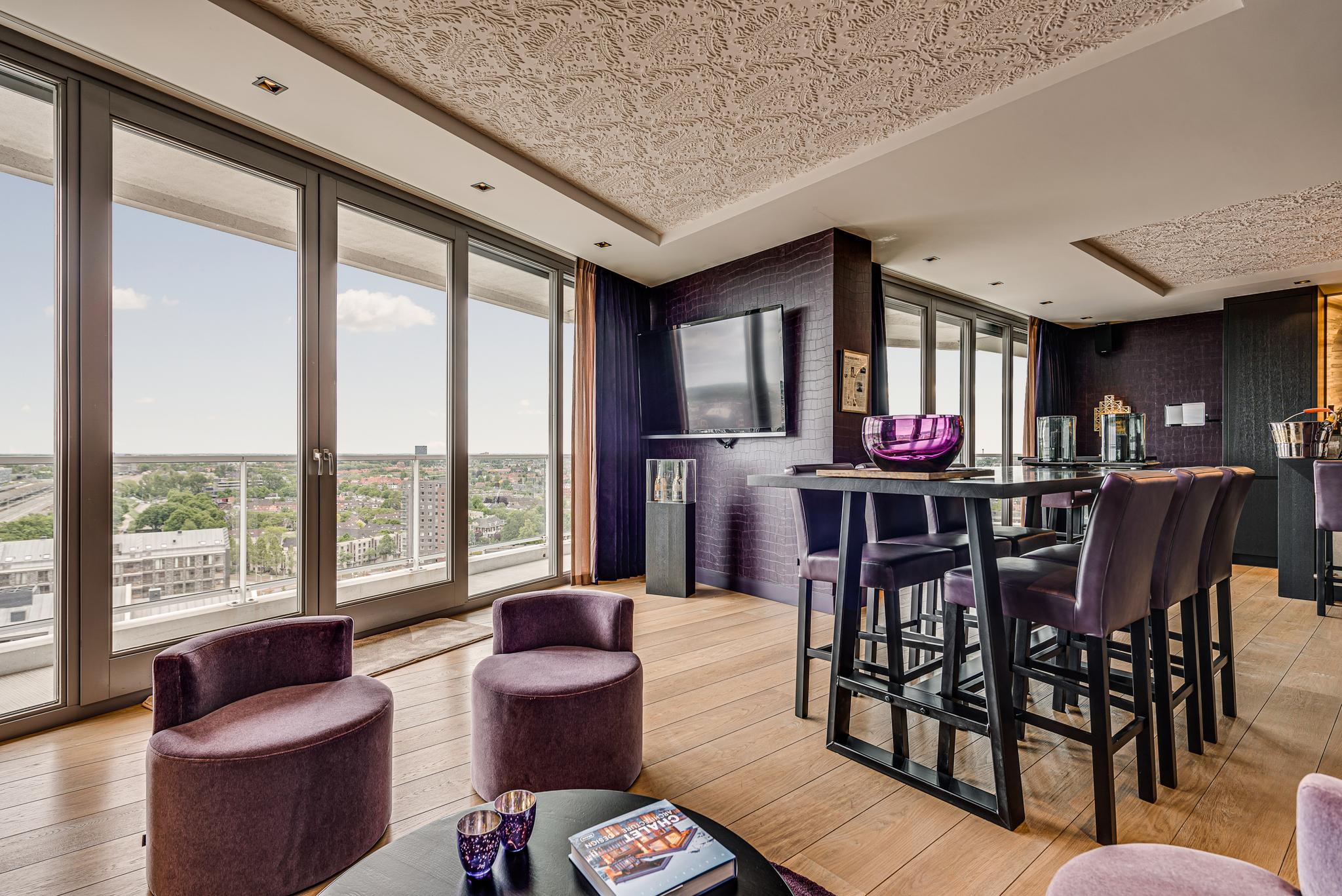 This exceptionally luxurious and vast apartment spans a total floor area of 649 sqm and is truly one of a kind. Experience the serene tranquility and privacy, all a mere stone's throw from the bustling city center of The Netherlands' oldest city. The best of both worlds converge in this exquisite penthouse. Fabulous floor-to-ceiling windows with a stunning incidence of light offer a 360-degree view of continually changing panoramas. This penthouse features a private wrap-around roof terrace of 239 sqm, with a Starlin jacuzzi.