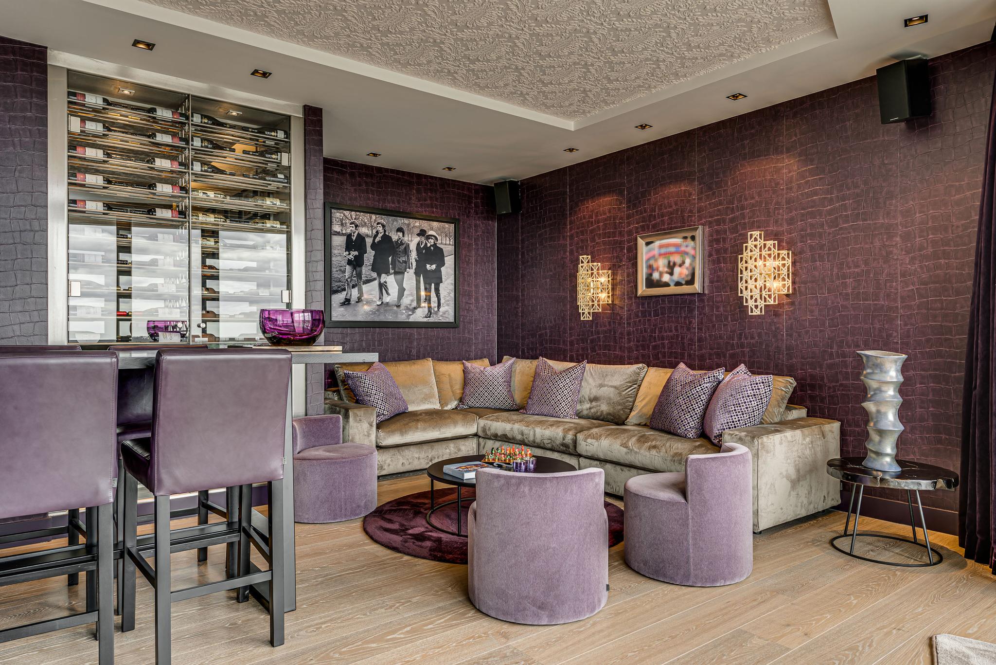 • Lounge area with an inviting bar, with a large wine/display cupboard, ice cube refrigerator, bar refrigerator, professional draft system and a high-end audio system with a B&O amplifier/mixing panel.