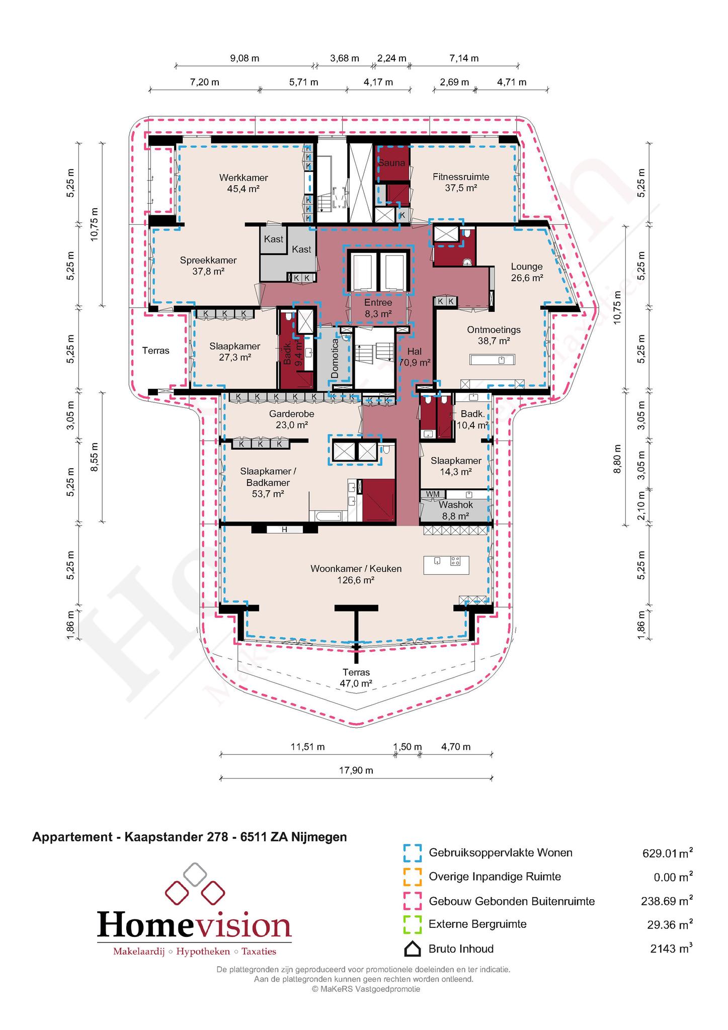 The penthouse can be accessed directly from the parking garage by elevator, which opens on to the hall of the home on the top floor. Majestic, tall hallways lead to each individual room. In addition to the generous yet welcoming living room with a captivating view of Waal River, this extremely luxurious home includes 3 spacious bedrooms with 3 luxury bathrooms. The apartment also accommodates a large office, spacious meeting room, inciting lounge area with a bar, a high-end gym, sauna, steam shower and a convenient laundry/ironing room. Of course, there is plenty of storage in the apartment.
