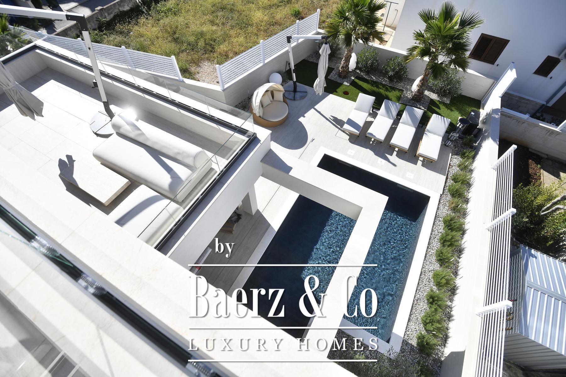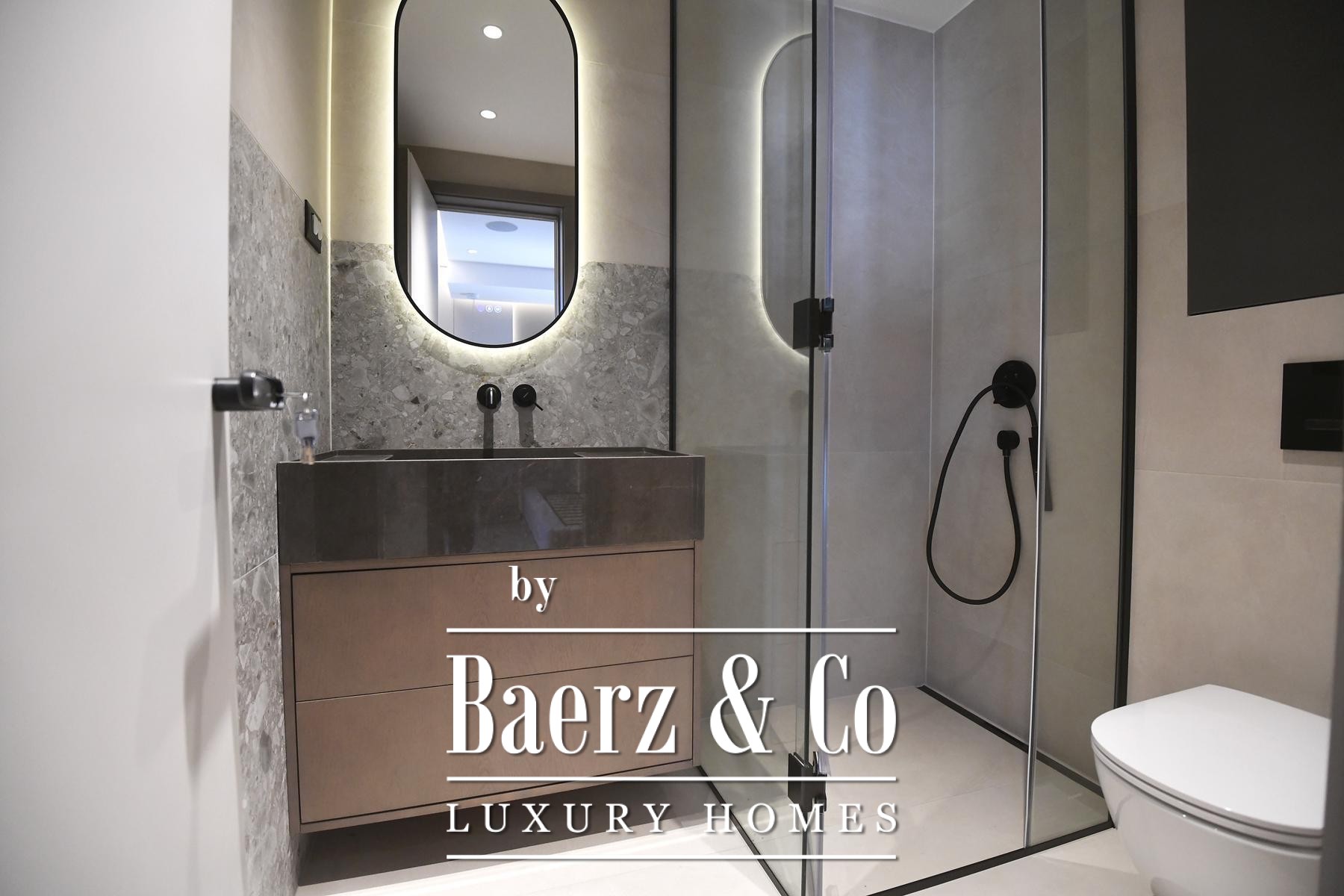 Each of the three bedrooms privileges privacy and sea views, with the master suite offering an en-suite bathroom and tailored wardrobes. Bathrooms feature Hansgrohe fixtures, walk-in showers, underfloor heating and precise finishes that recall a private spa. Practical living is ensured by a dedicated laundry room, storage space and an additional guest toilet.