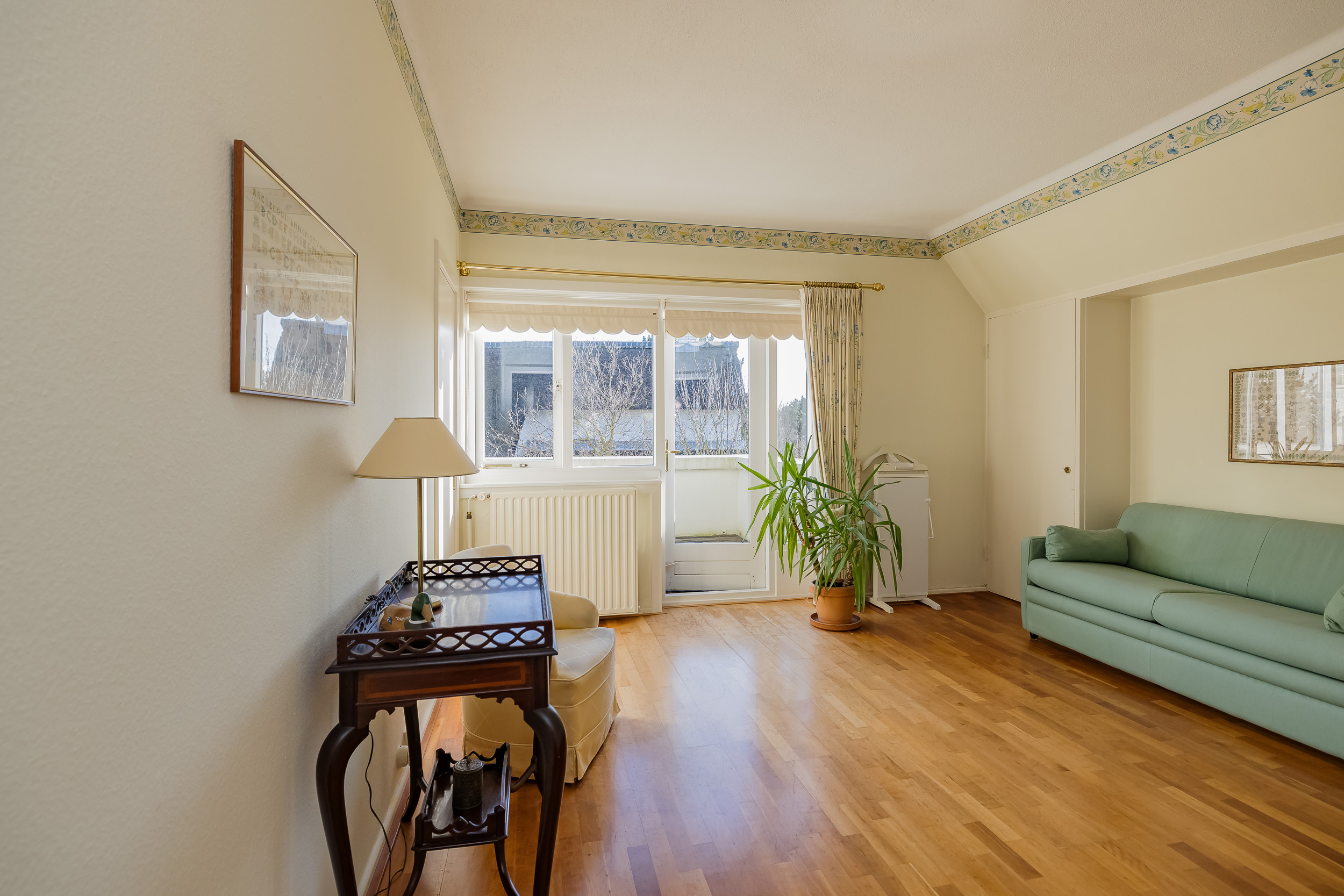 The spacious living room is a delightful living space with a warm, inviting atmosphere. The fireplace and elegant marble floor give the room character, while the doors from the living room provide direct access to the garden. The sun circles the house from morning to evening, creating a beautiful play of light.