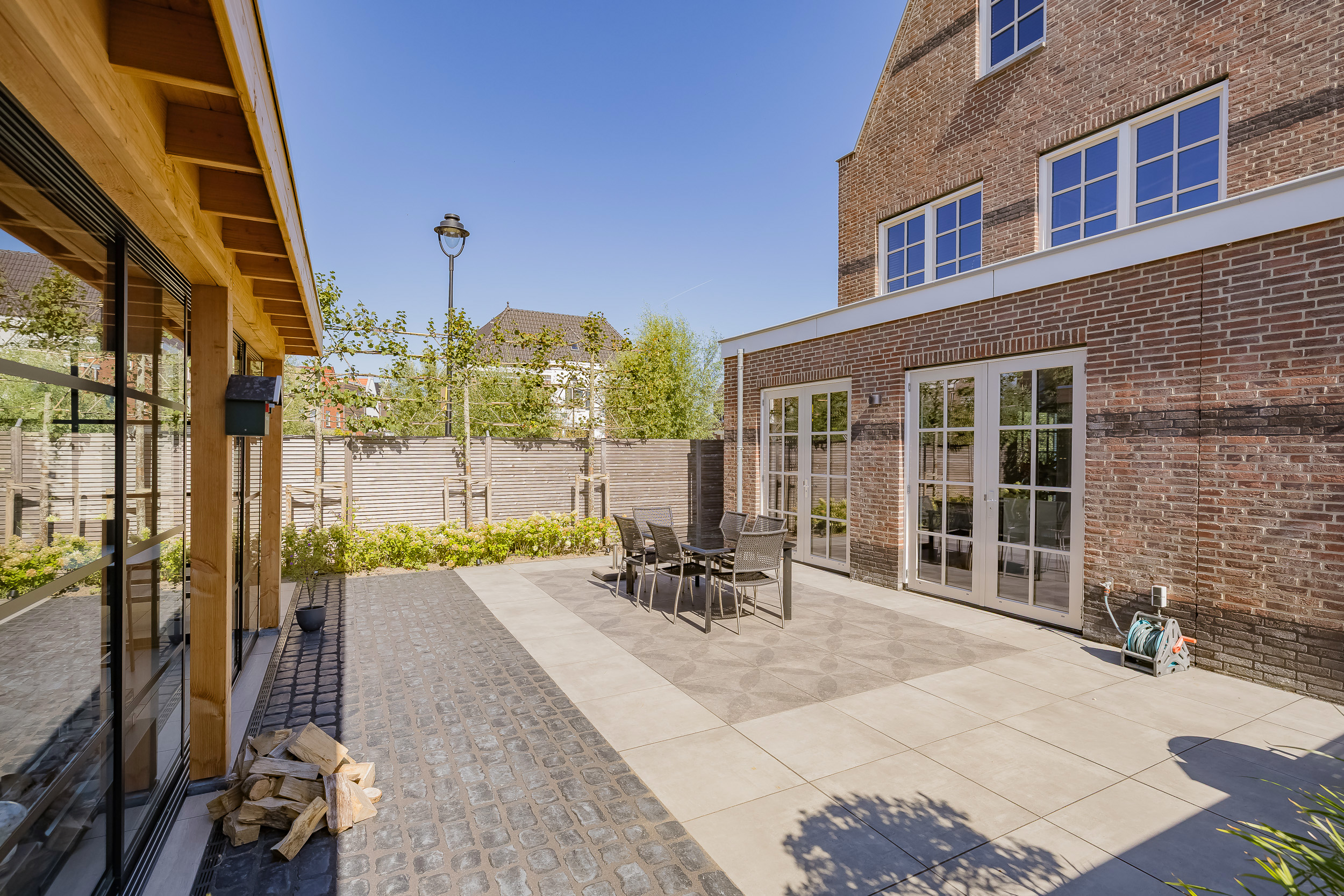 The sunny garden (SW) with veranda completes the living experience. Here you can enjoy the outdoors in all seasons. The back entrance provides convenient additional access to the backyard.
