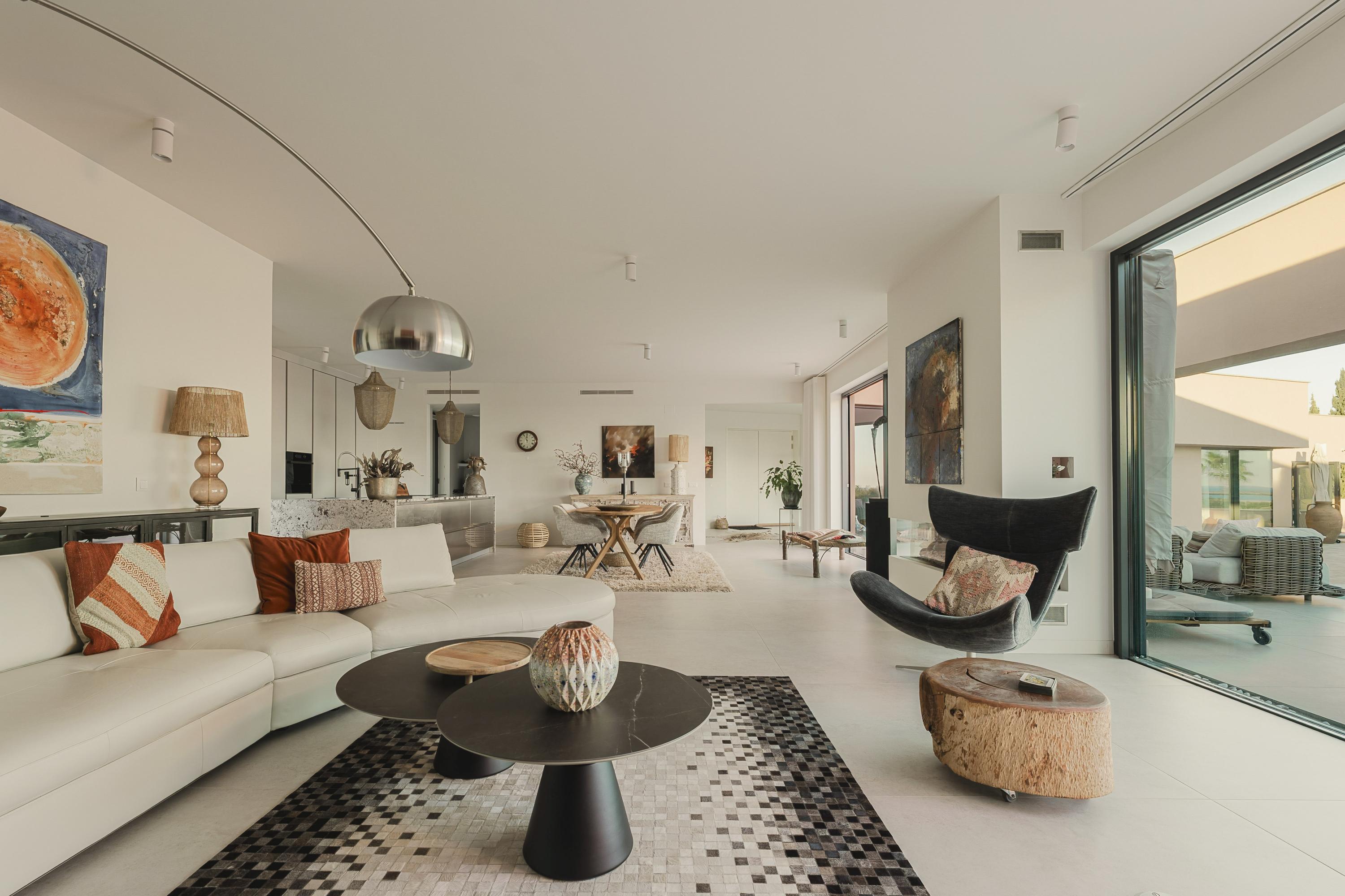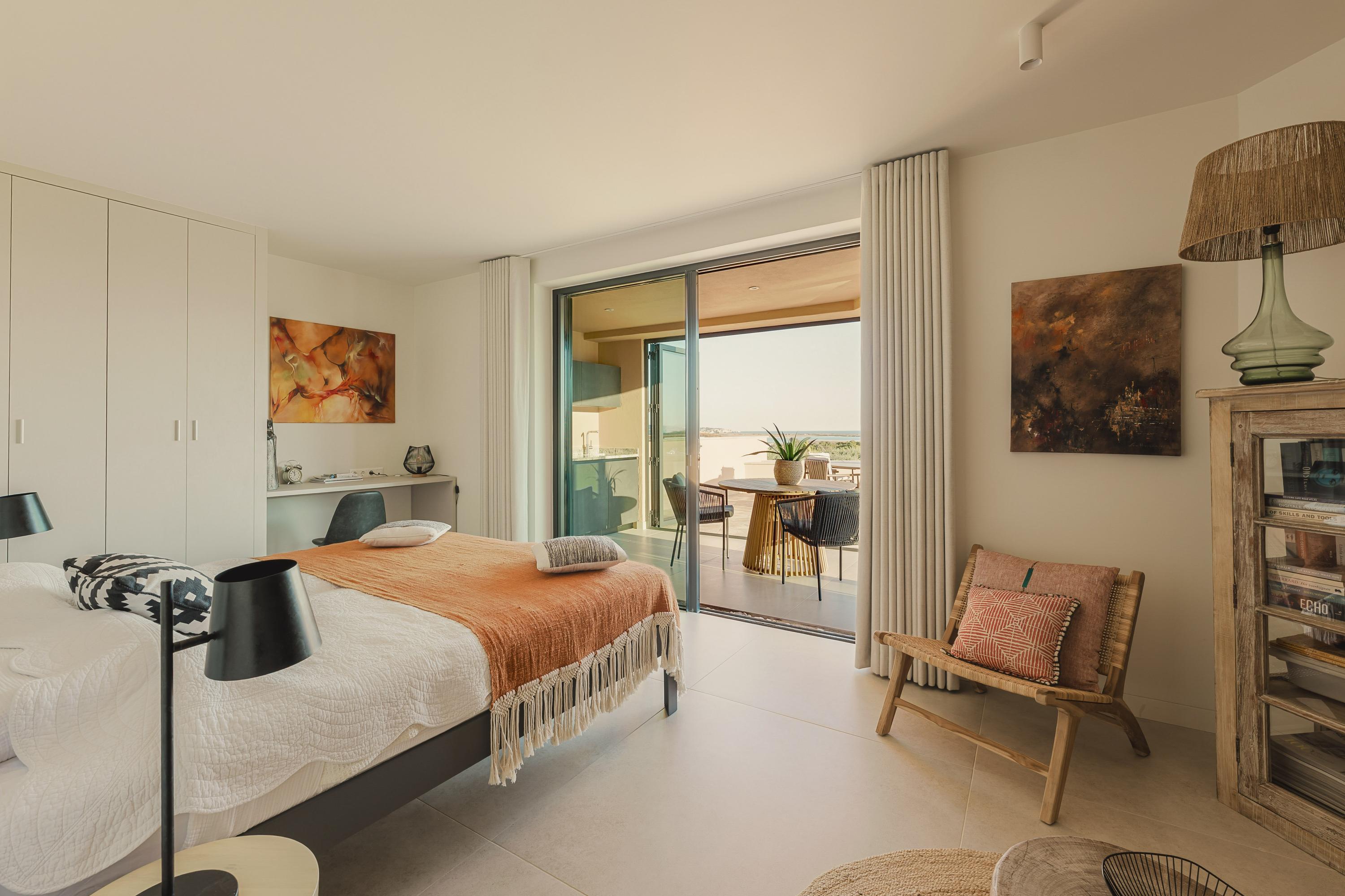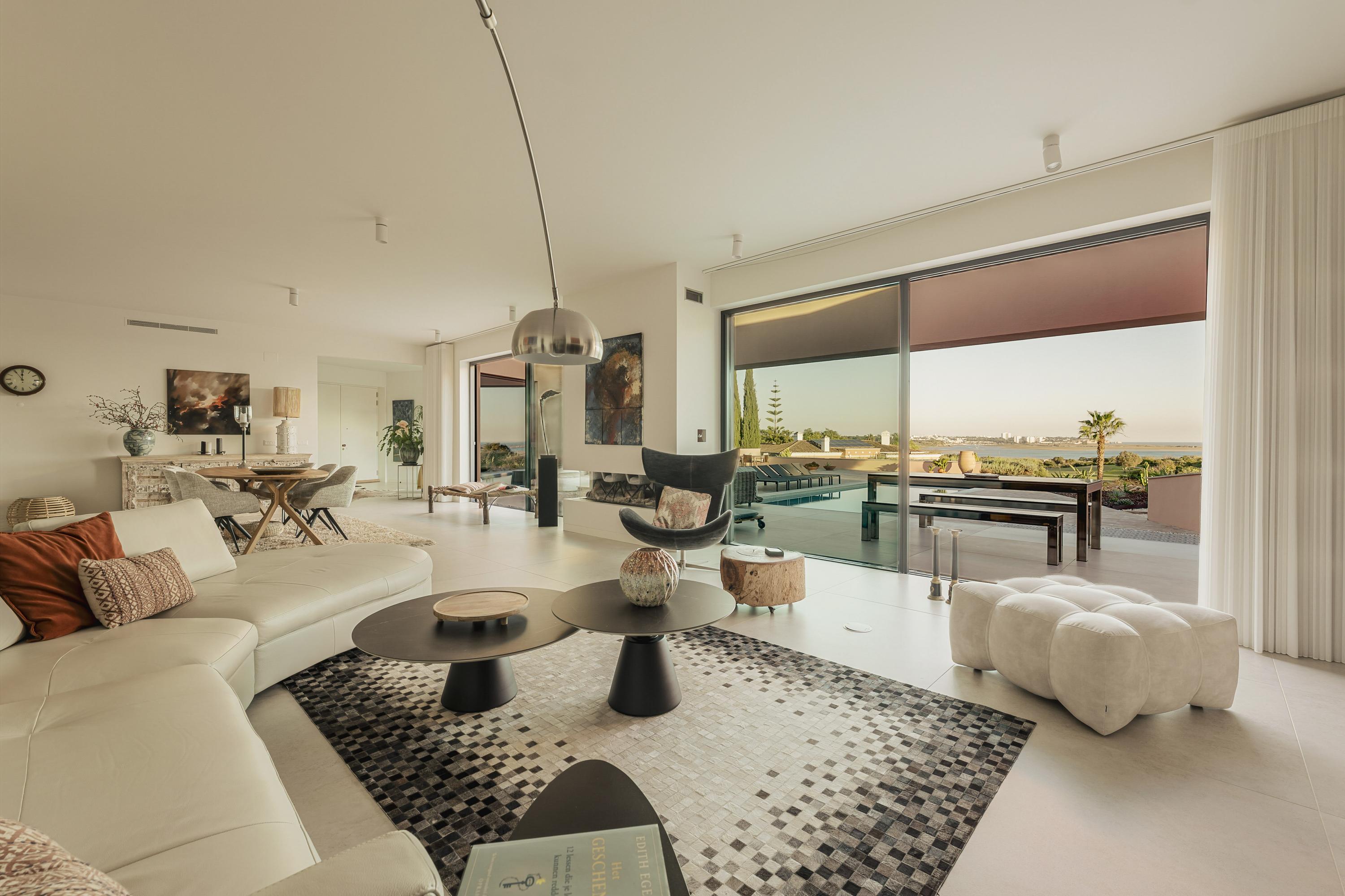 The main living room is luminous and inviting, with sweeping views of the Atlantic and the softly rolling landscape of Palmares Golf. Its seamless flow to the terrace and pool area creates an effortless indoor–outdoor atmosphere for both everyday living and refined hosting. The front terrace can optionally be enclosed in glass, forming an elegant all-season lounge or dining area without compromising the views.