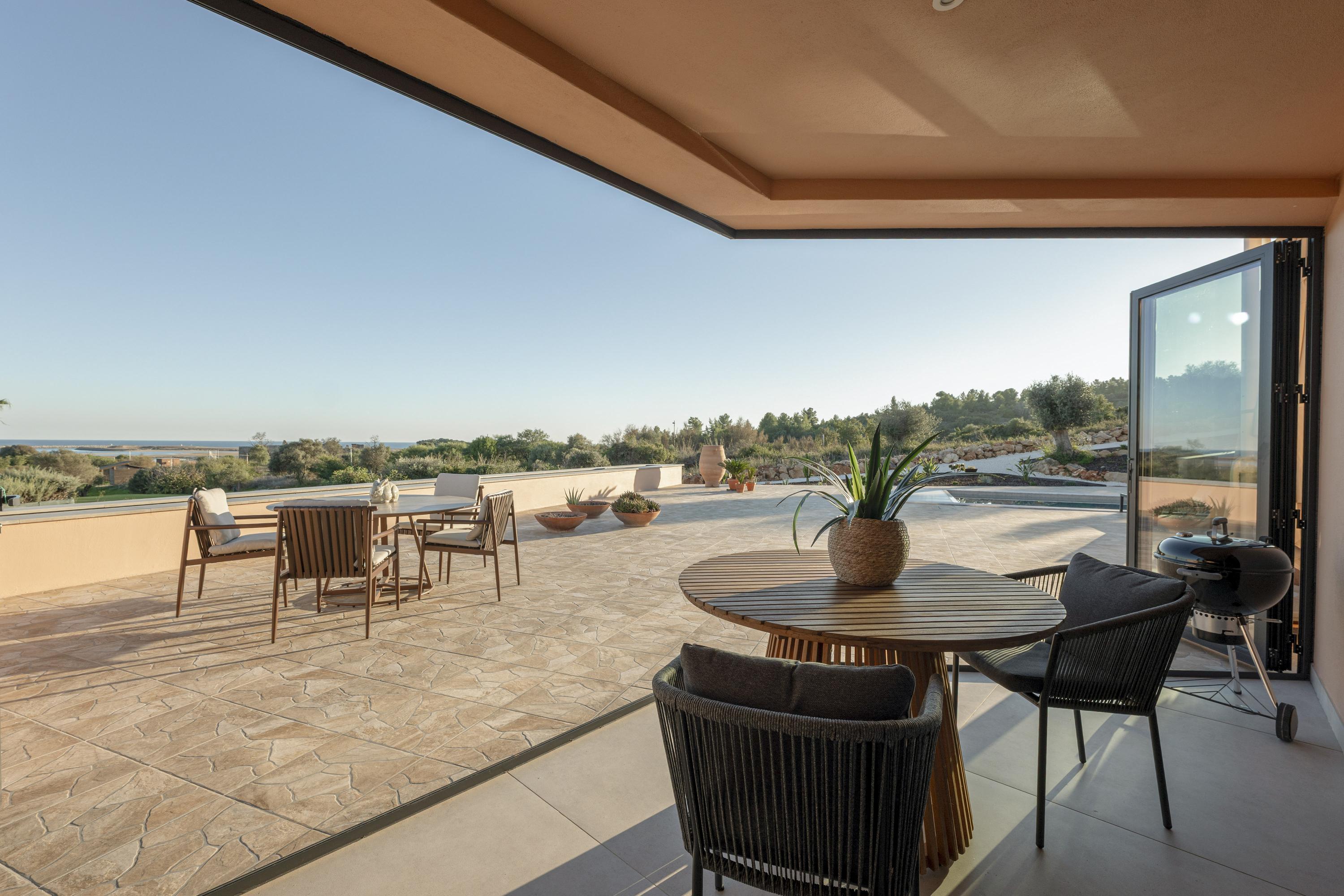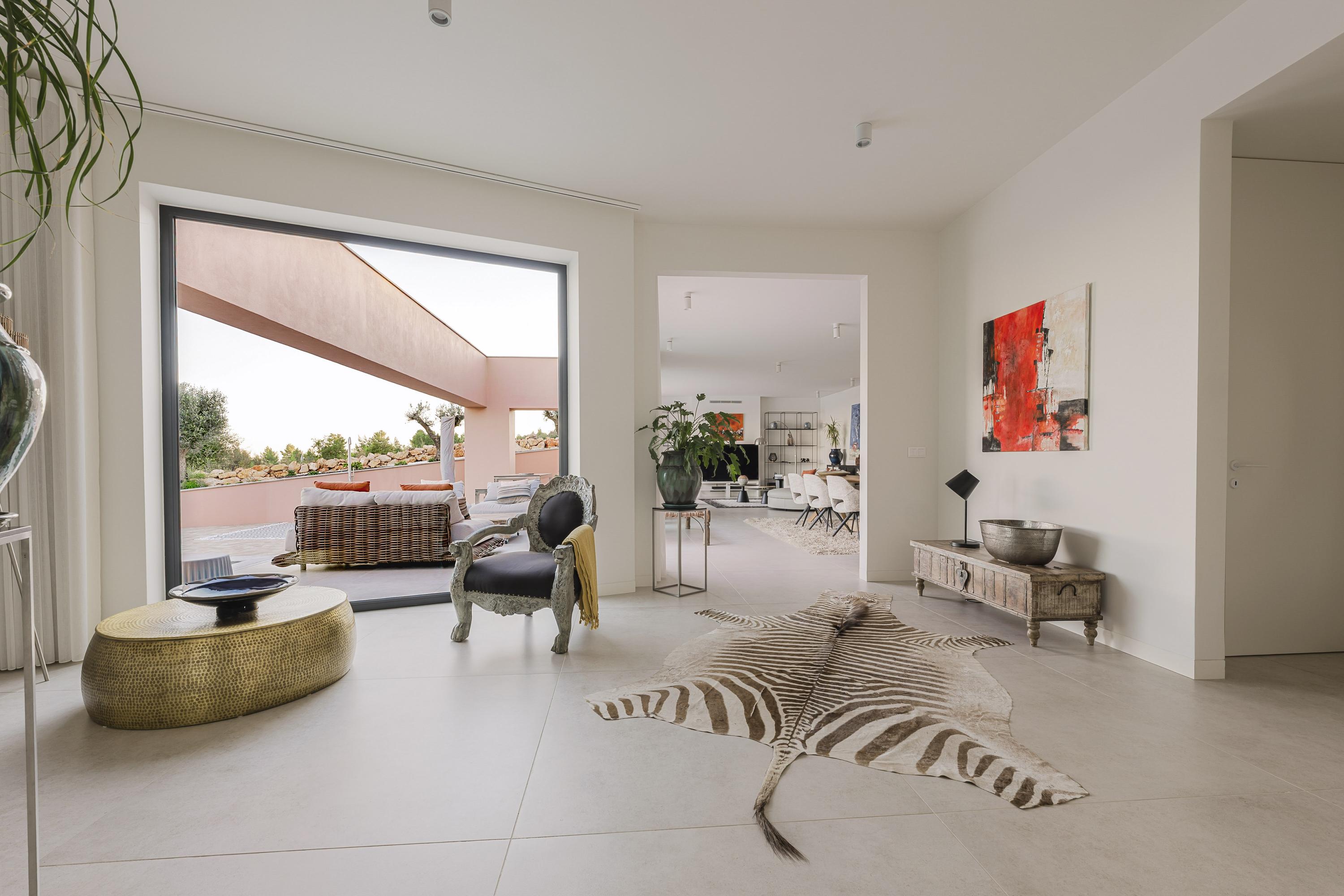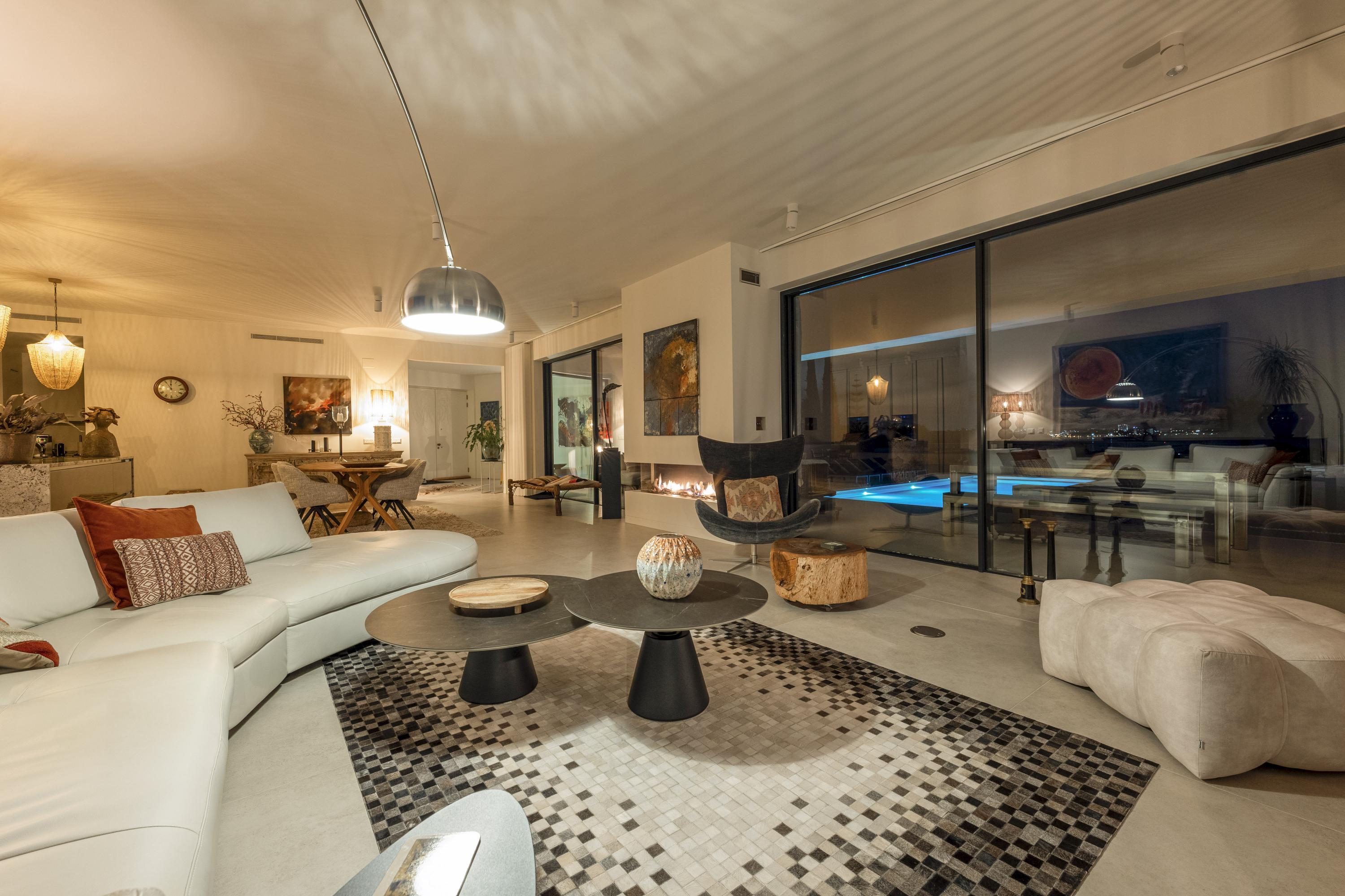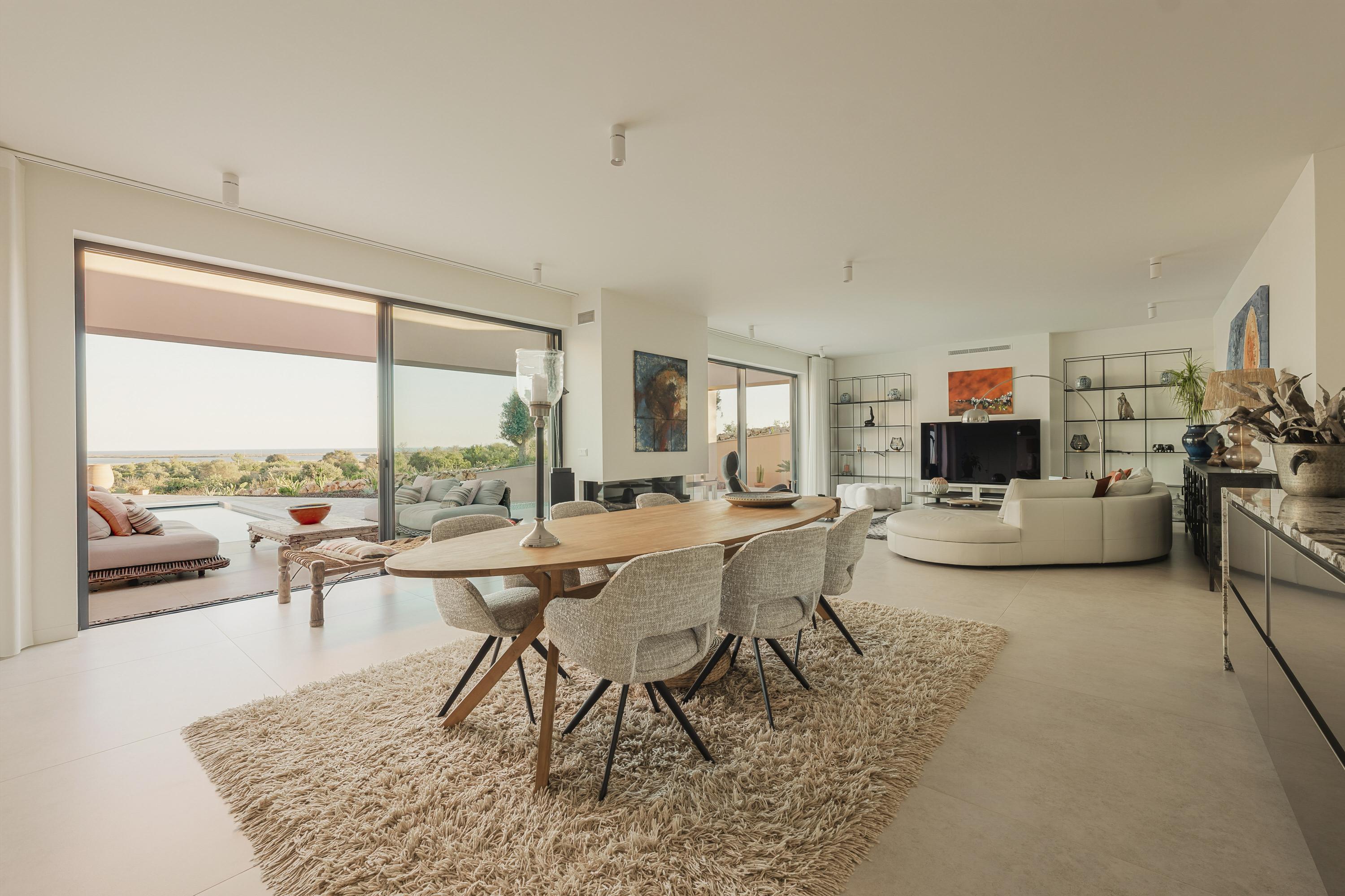 The main living room is luminous and inviting, with sweeping views of the Atlantic and the softly rolling landscape of Palmares Golf. Its seamless flow to the terrace and pool area creates an effortless indoor–outdoor atmosphere for both everyday living and refined hosting. The front terrace can optionally be enclosed in glass, forming an elegant all-season lounge or dining area without compromising the views.