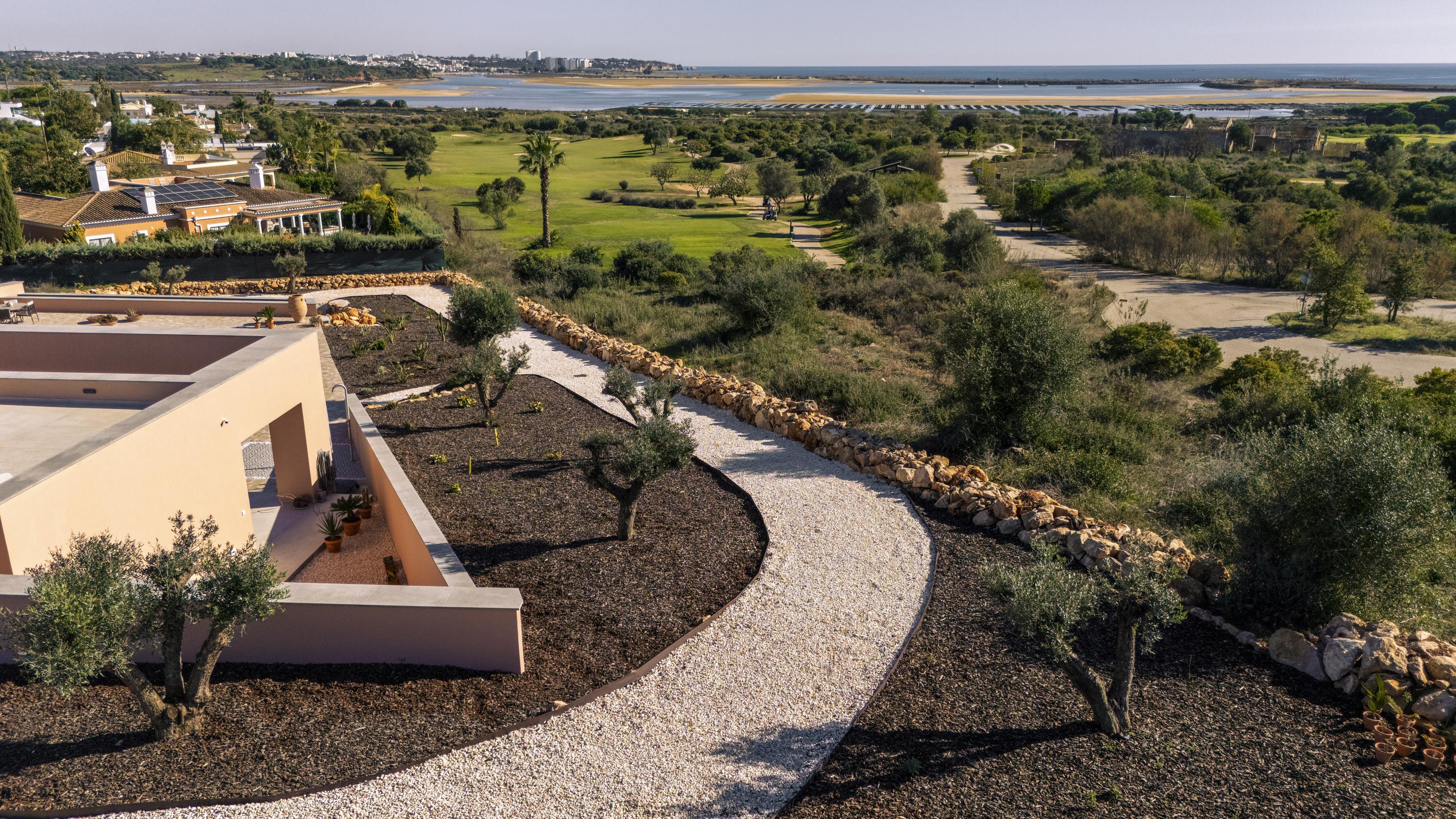 Set directly beside Palmares Golf Course (27 holes), Lagos Portugal, this newly finished contemporary villa pairs architectural purity with natural textures and cinematic views of the Atlantic Ocean and the softly rolling landscape of Palmares Golf. Light, openness and tranquility shape the interior atmosphere, creating a home for those who value elegance, comfort and timeless design.Positioned on a generous ±3,000 m² landscaped plot, the villa embraces its surroundings through expansive terraces, Mediterranean gardens and 170 m2 elevated rooftop areas that capture the shifting light throughout the day. A bright 384 m2 ground floor and a versatile 120 m2 lower level ensure effortless flow for both refined hosting and everyday living. With four refined suites, each with its own ensuite bathroom of which two independent guest residences, four Italian-designed kitchens, a heated saltwater pool, an outdoor shower, newly landscaped Mediterranean gardens and two rooftop terraces, this property stands as one of the Algarve’s most compelling contemporary homes — a rare blend of design, setting and lifestyle.