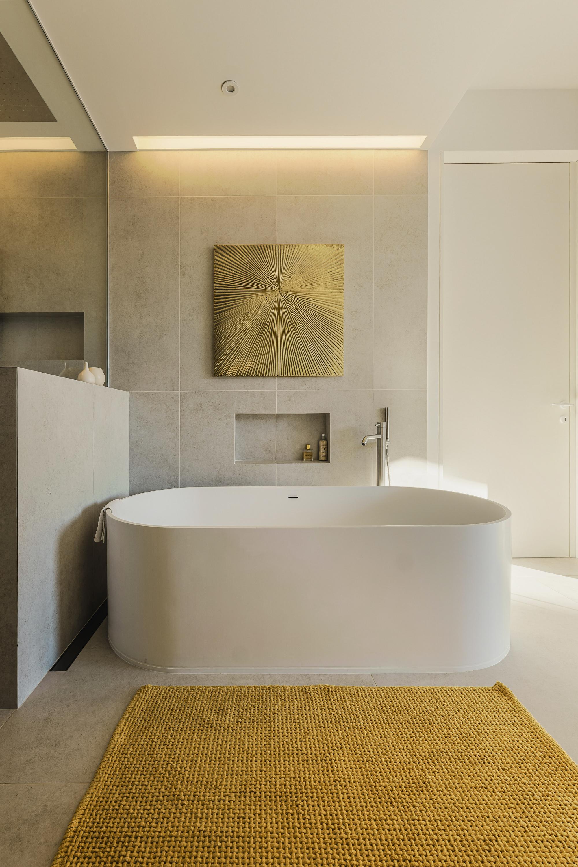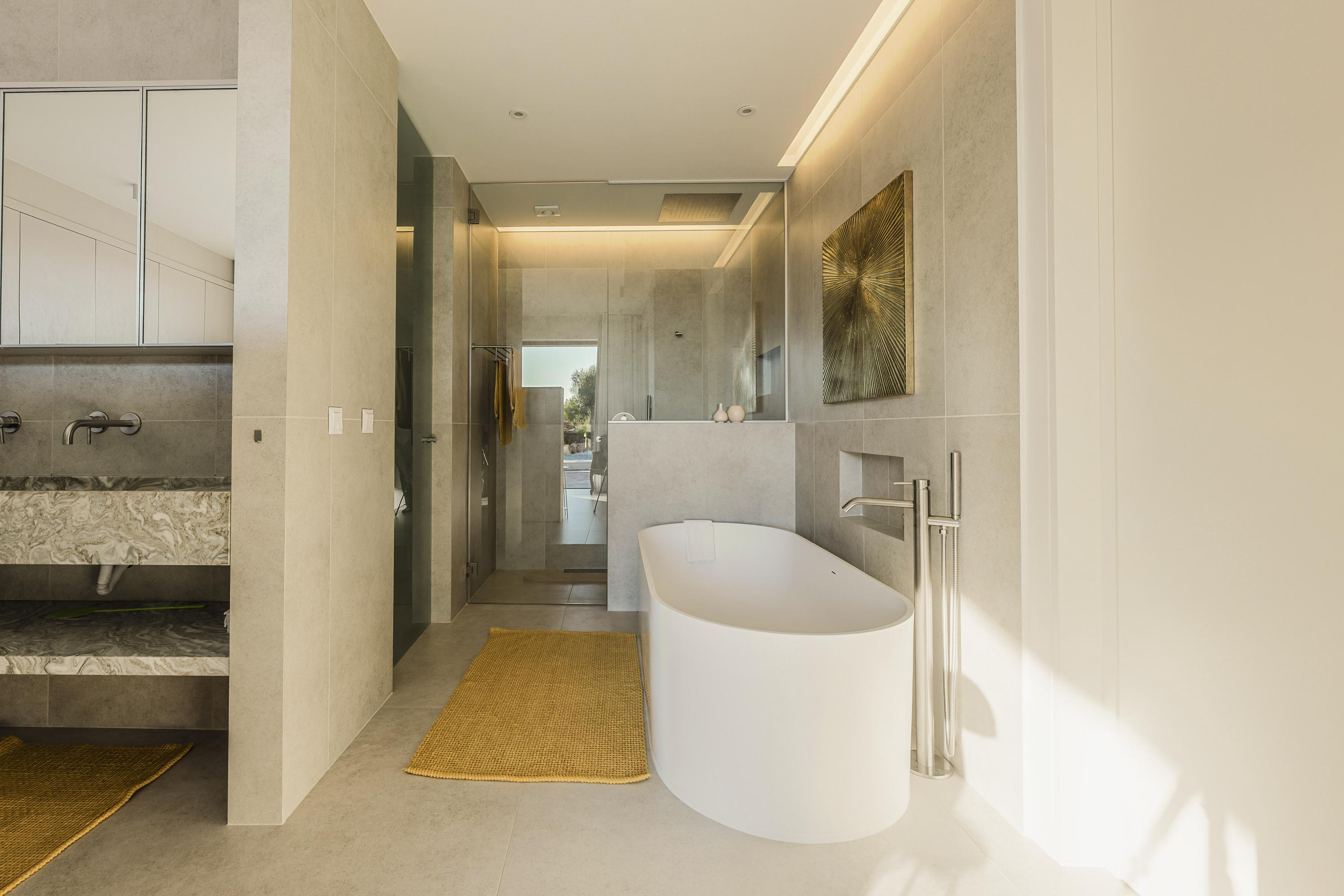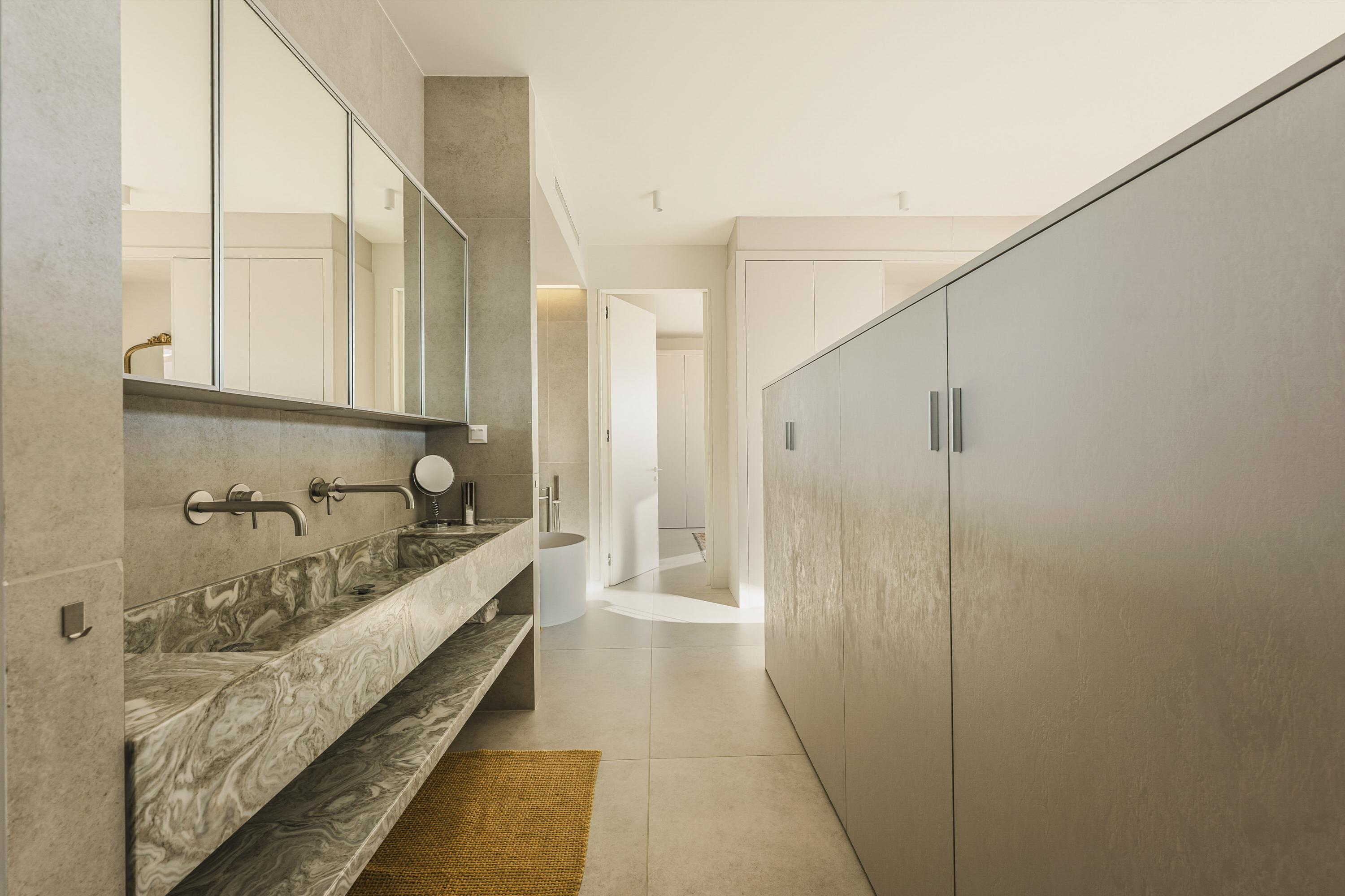 The ensuite bathroom features: an elegant marble double sink, freestanding bath, stone-clad walk-in rain shower, bidet and toilet. The walk-in wardrobe and dedicated shoe closet complete the suite.