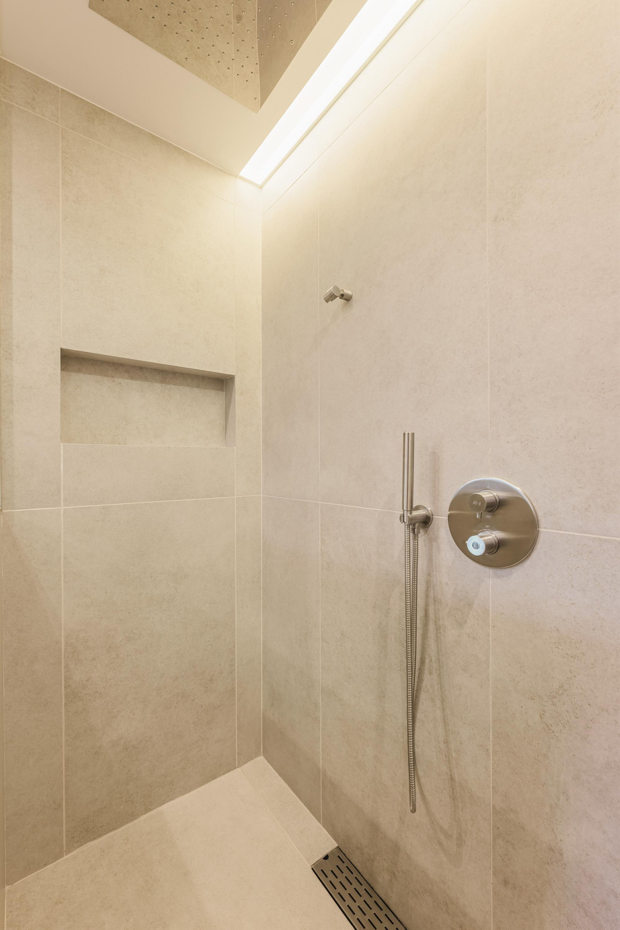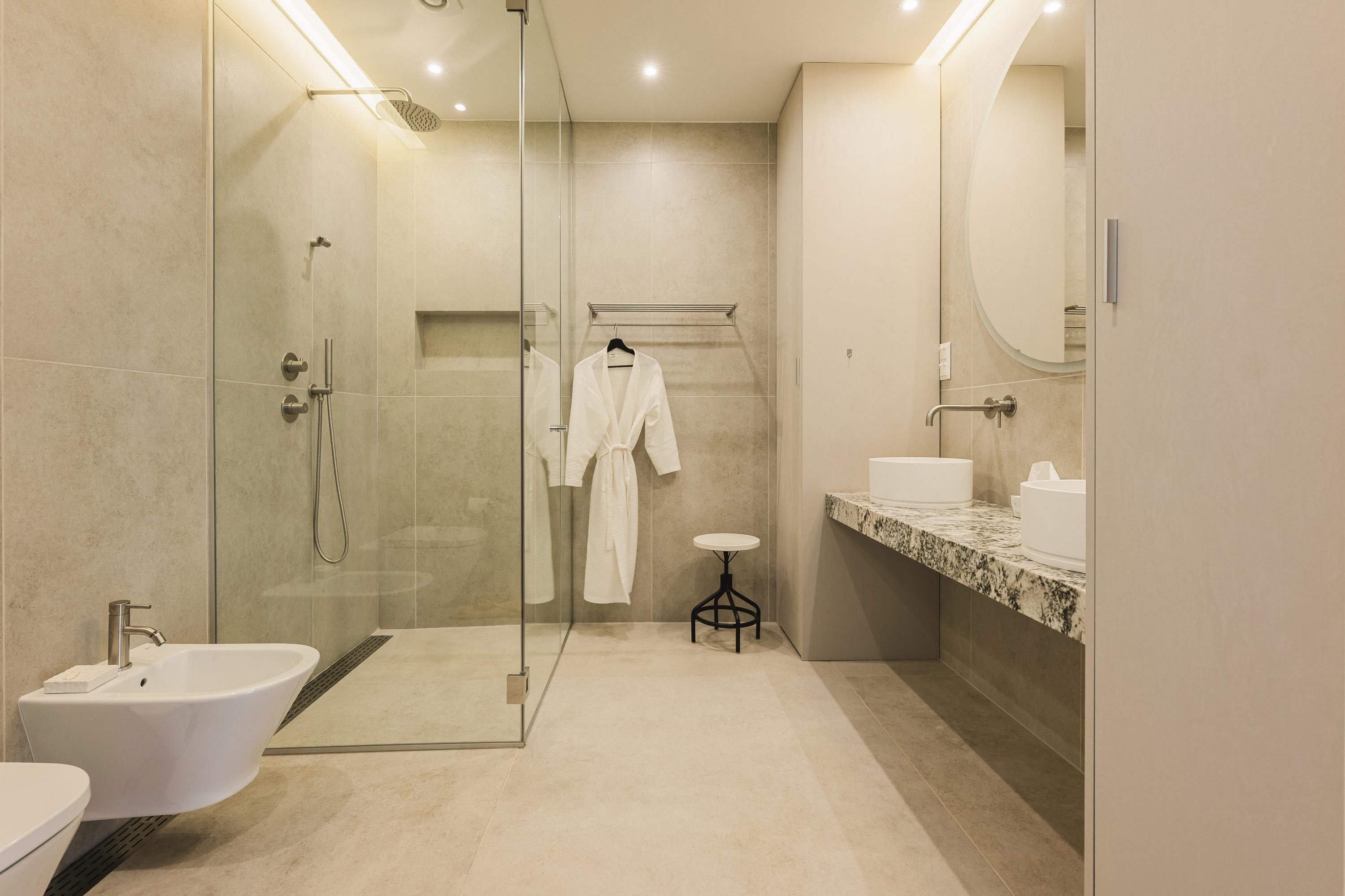 The ensuite bathroom includes: double vanity, walk-in rain shower, bidet, toilet and natural stone finishes.
