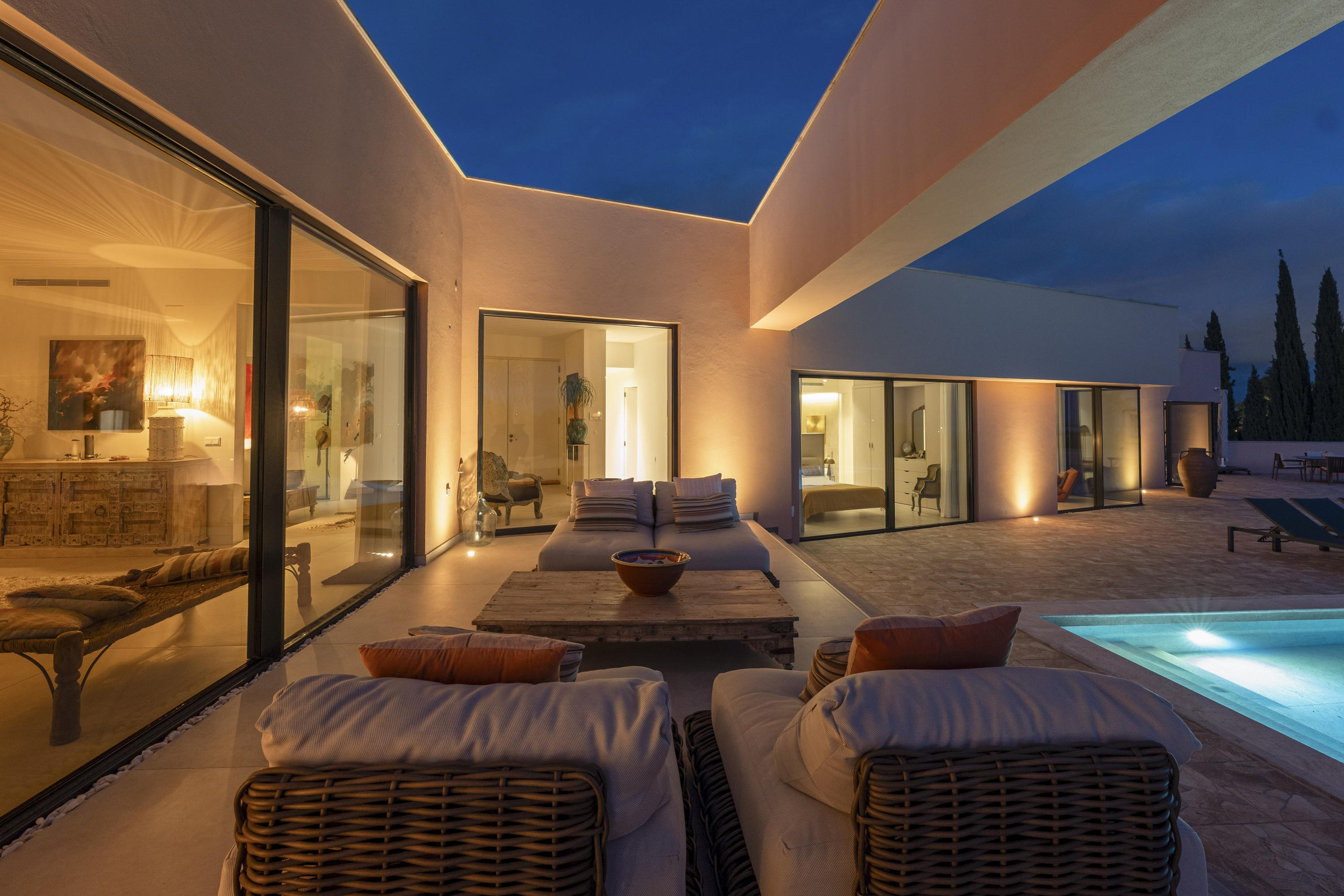 The newly landscaped garden has been thoughtfully designed to complement the villa’s architecture and natural surroundings. Mediterranean planting, mature olive trees and sculptural rock formations are paired with soft architectural lighting to create atmosphere and depth. A heated 14-meter saltwater pool with automatic AbriBleu solarpanel roll deck and outdoor JeeO shower form the centerpiece of this serene environment. Multiple terraces offer places for sun, shade and privacy throughout the day. As evening falls, the garden transforms into a warmly illuminated retreat — refined, intimate and deeply peaceful.