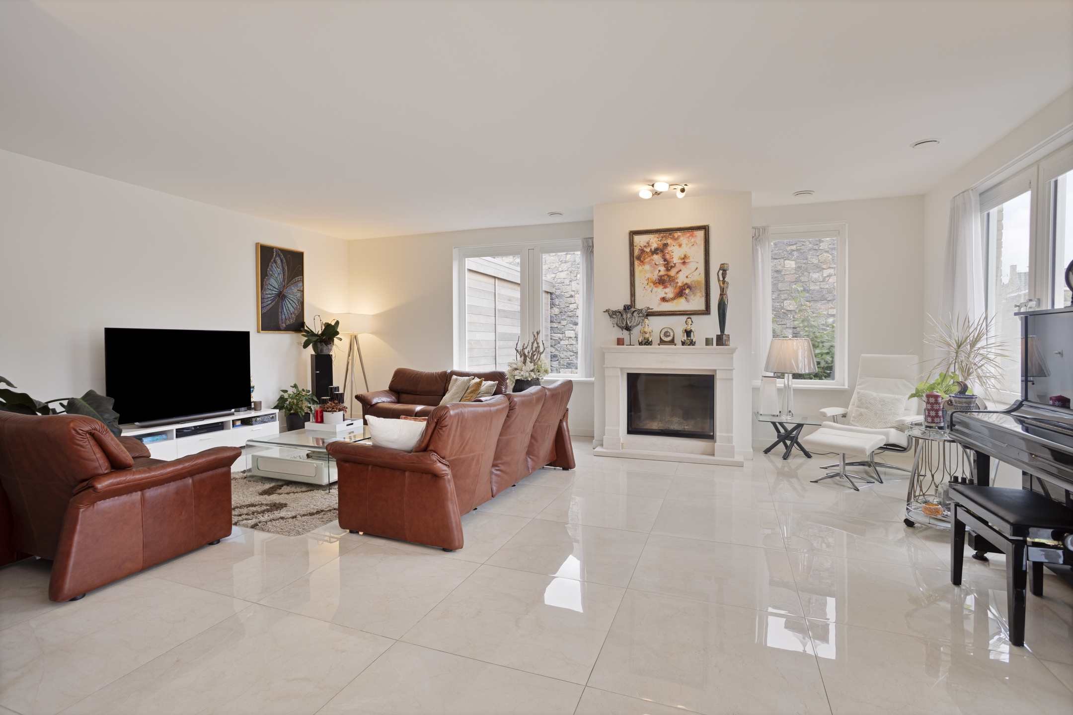 Upon arrival, a broad driveway with an electric gate ushers in a sense of privacy, leading to a double indoor garage. The landscaped rear garden unfolds towards the water, with a terrace and generous deck, framing daily life with reflection and light. The living spaces span over 65 m², embracing an open, luminous living room with fireplace, a dining area seamlessly connecting to the outdoors, and a modern kitchen anchored by a central island.