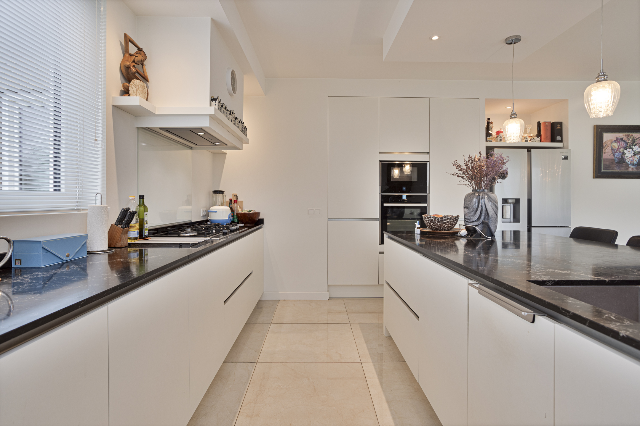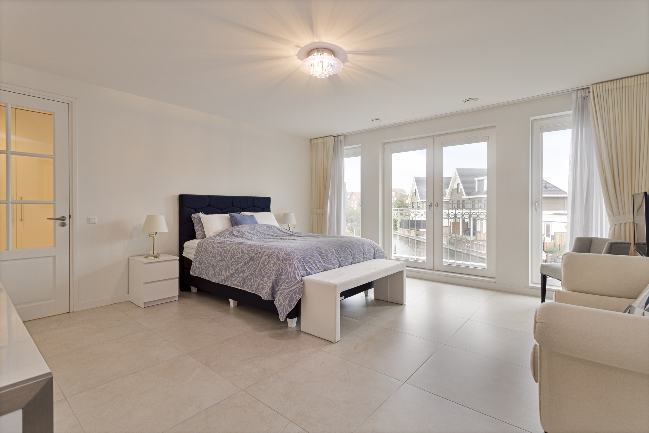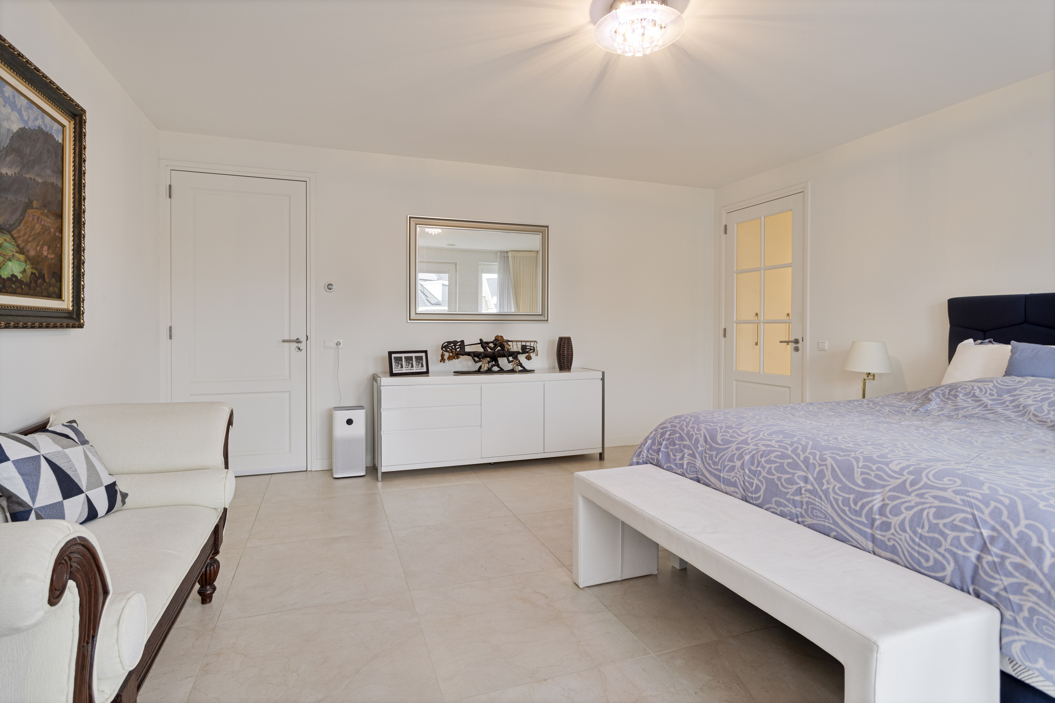 Upstairs, four large bedrooms accompany three elegant bathrooms. The principal suite features an extensive dressing room with crafted storage and a full ensuite. Additional features include a separate laundry, technical room, and a spacious attic. Located near Landskroonpark, with schools, shops, and key amenities easily reached, this luxury villa for sale in Oegstgeest merges a rare waterside setting with true contemporary ease.