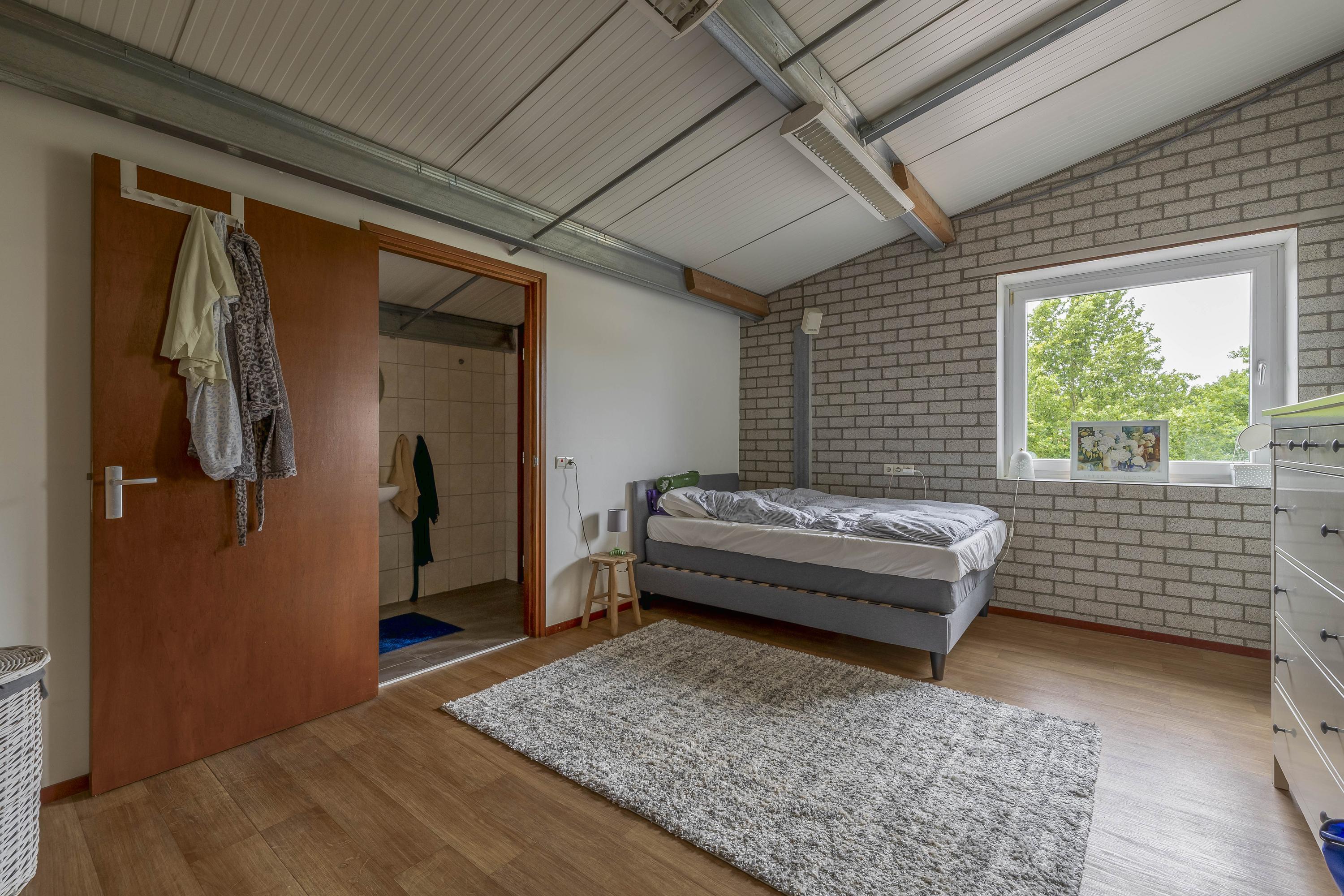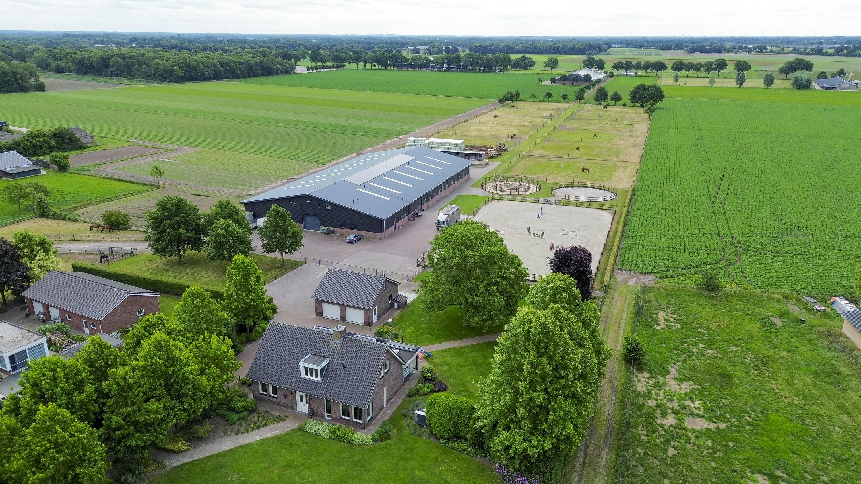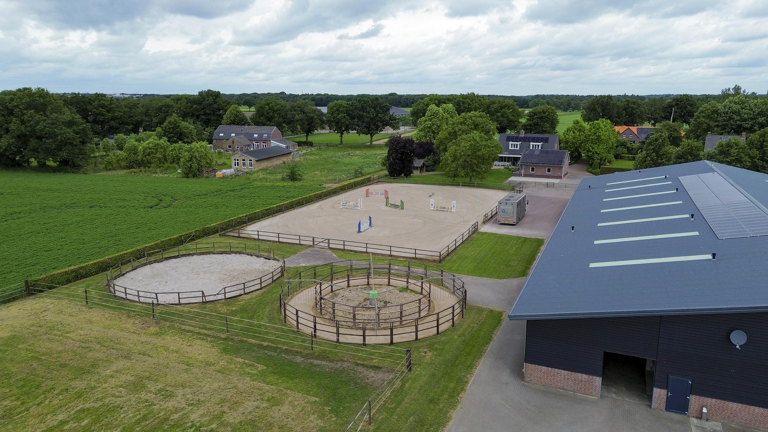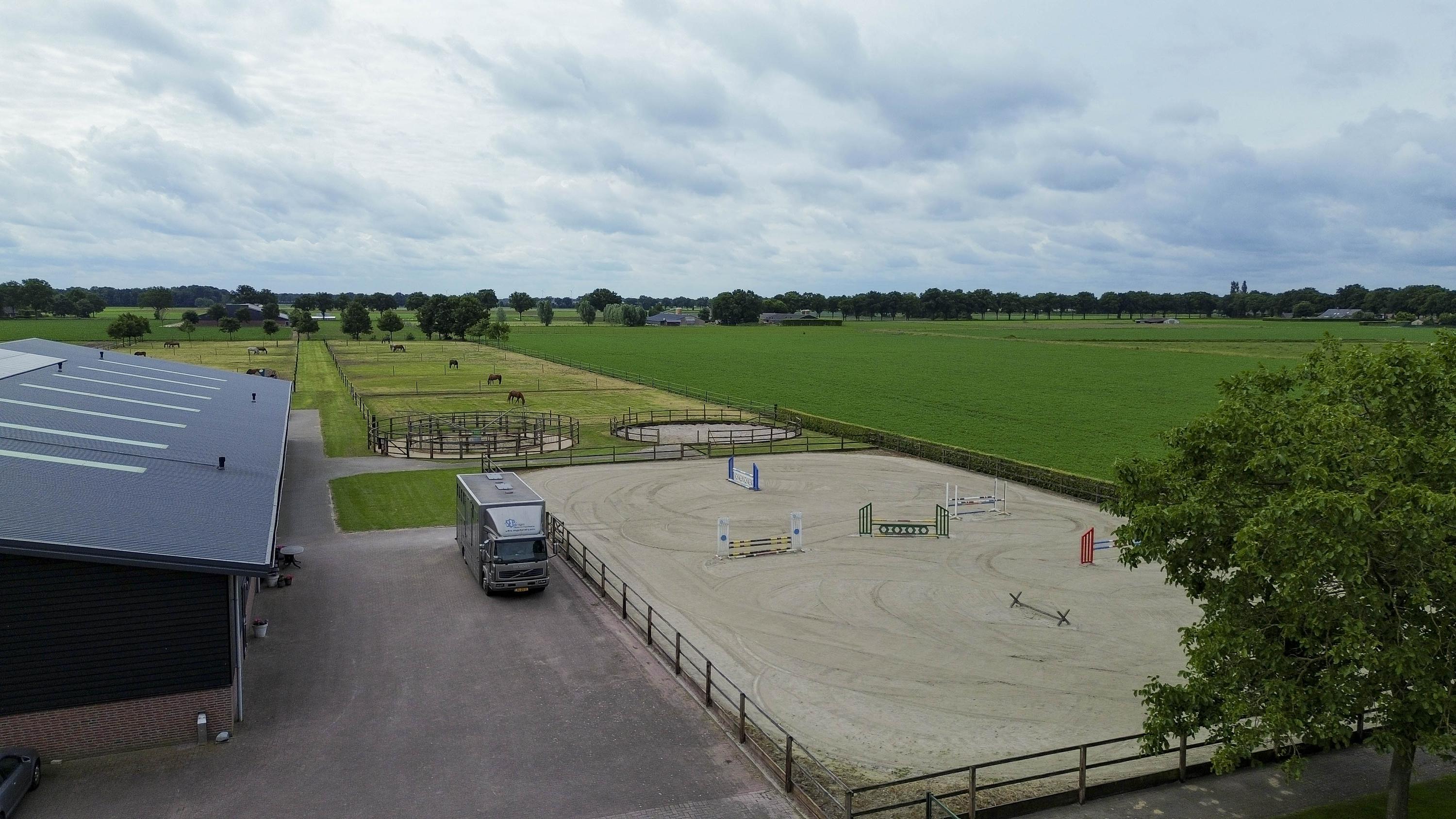 A wicket door provides access to the stable. A roller door provides access to the indoor arena. Practical storage facilities are provided. Three-phase power is available and there is a high-pressure pipe for cleaning the stables. An electric roller door and a wicket door provide access to the yard. French doors provide access to the riding hall. In addition, 10 stalls are equipped with practical outside hatches. A big plus is the hayloft with handy hay hatches, strategically placed above the stables, so hay and straw can be easily thrown directly into the stalls. Furthermore, the manure drag chain contributes to extra convenience and efficiency in the maintenance of the stables. Next to the stables is a shower and toilet room for men and women. There are also 3 washrooms, which are equipped with hot and cold water. The apartment is accessible via a separate entrance located next to the tack room. The apartment has vinyl flooring, partly brickwork/partly stucco walls and a suspended ceiling. Storage space has been created under the sloping roof. The living room of the apartment is equipped with a kitchen unit. From this room, there is a view of the indoor riding arena. The bedroom has a practical built-in wardrobe. The bathroom is equipped with a shower, washbasin and toilet and is fully tiled.