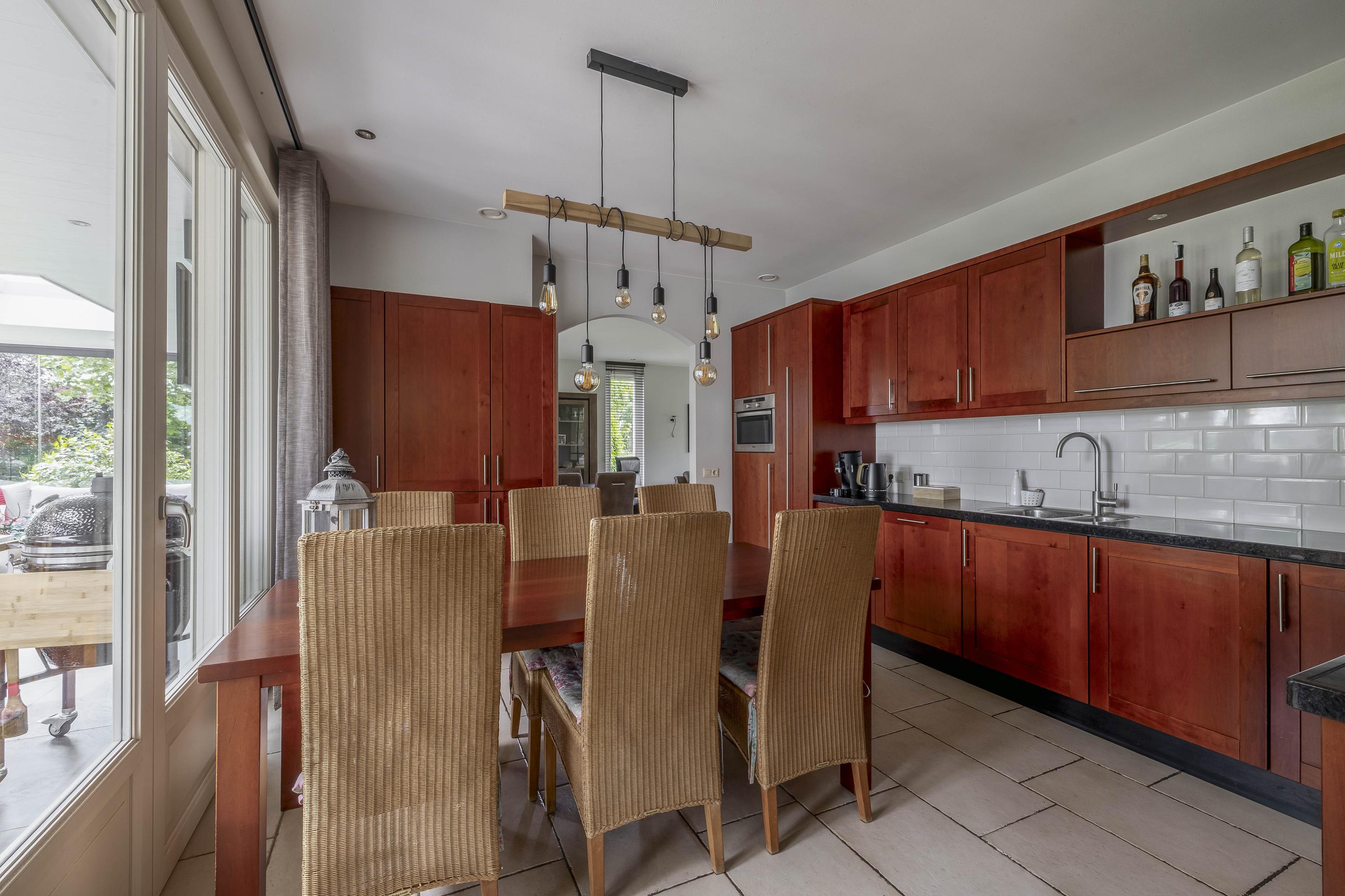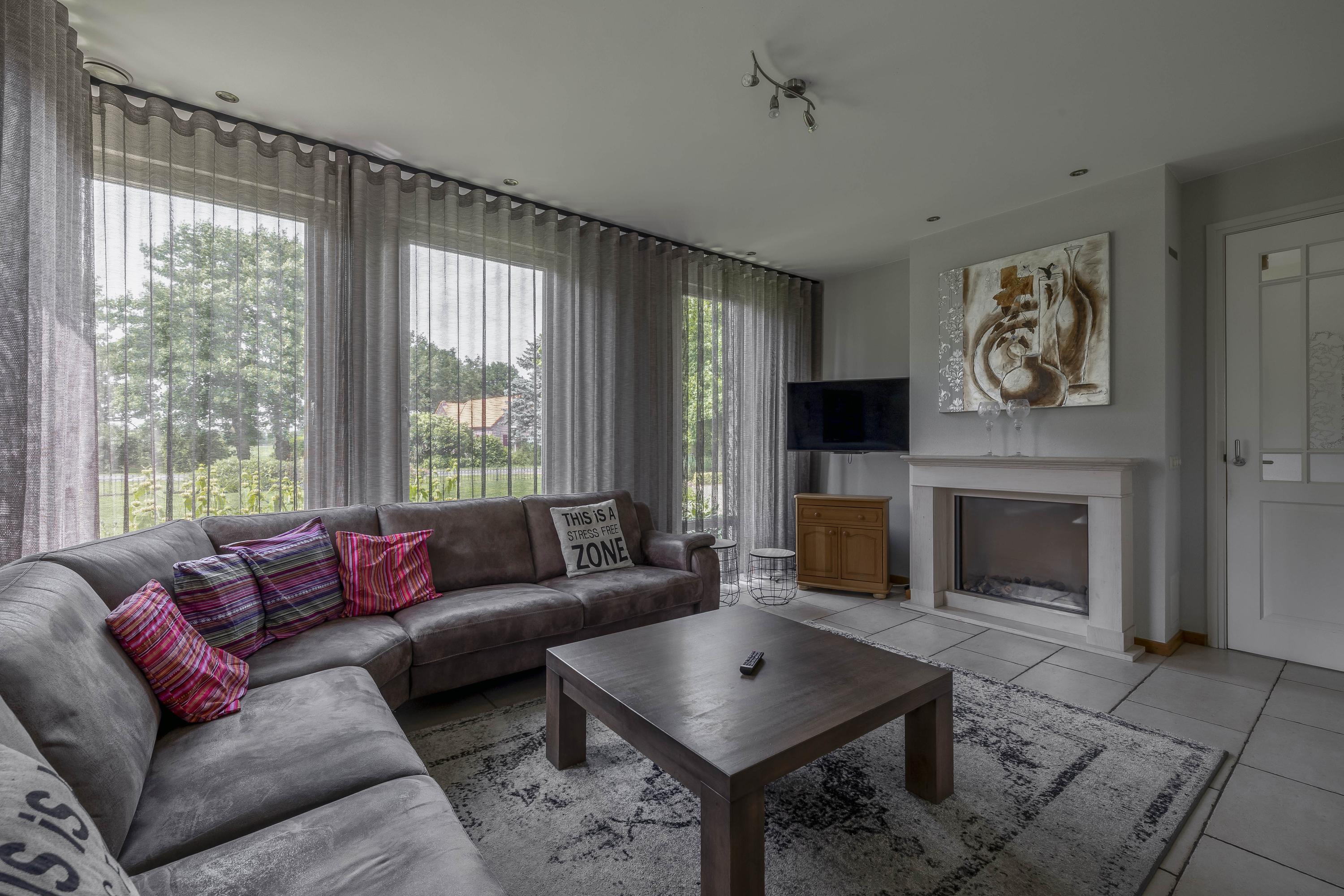 The living room has a tiled floor, sleek stucco walls and a stucco ceiling with recessed lighting. Large windows extending to the floor provide plenty of light and a spacious feeling. The gas fireplace adds extra warmth and atmosphere to the room. In addition, French doors provide direct access to the covered terrace, allowing the indoors and outdoors to flow into each other. The living room provides access to the kitchen. The kitchen also has a tiled floor, stucco walls and a stucco ceiling. The kitchen is corner-shaped and equipped with various built-in appliances, such as a combination microwave, dishwasher, sink, induction hob and refrigerator. Various cupboards provide ample storage space. There is a laundry chute in the cupboard. Here too, French doors provide access to the covered terrace. The practical utility room has a tiled floor and a stucco ceiling. The room is fully tiled. The utility room is equipped with a kitchen unit with cupboards and a sink. The connections for the washing machine are located here. The toilet is also fully tiled and equipped with a floating toilet and a washbasin. The house has a bedroom with en-suite bathroom on the ground floor, making the house suitable for lifetime living. The bedroom has laminate flooring, spachtelputz walls and a stucco ceiling. Two practical built-in cupboards provide storage space. Windows provide natural light and ventilation. The spacious en-suite bathroom is fully tiled and equipped with a bath, shower, washbasin with vanity unit and a floating toilet.
