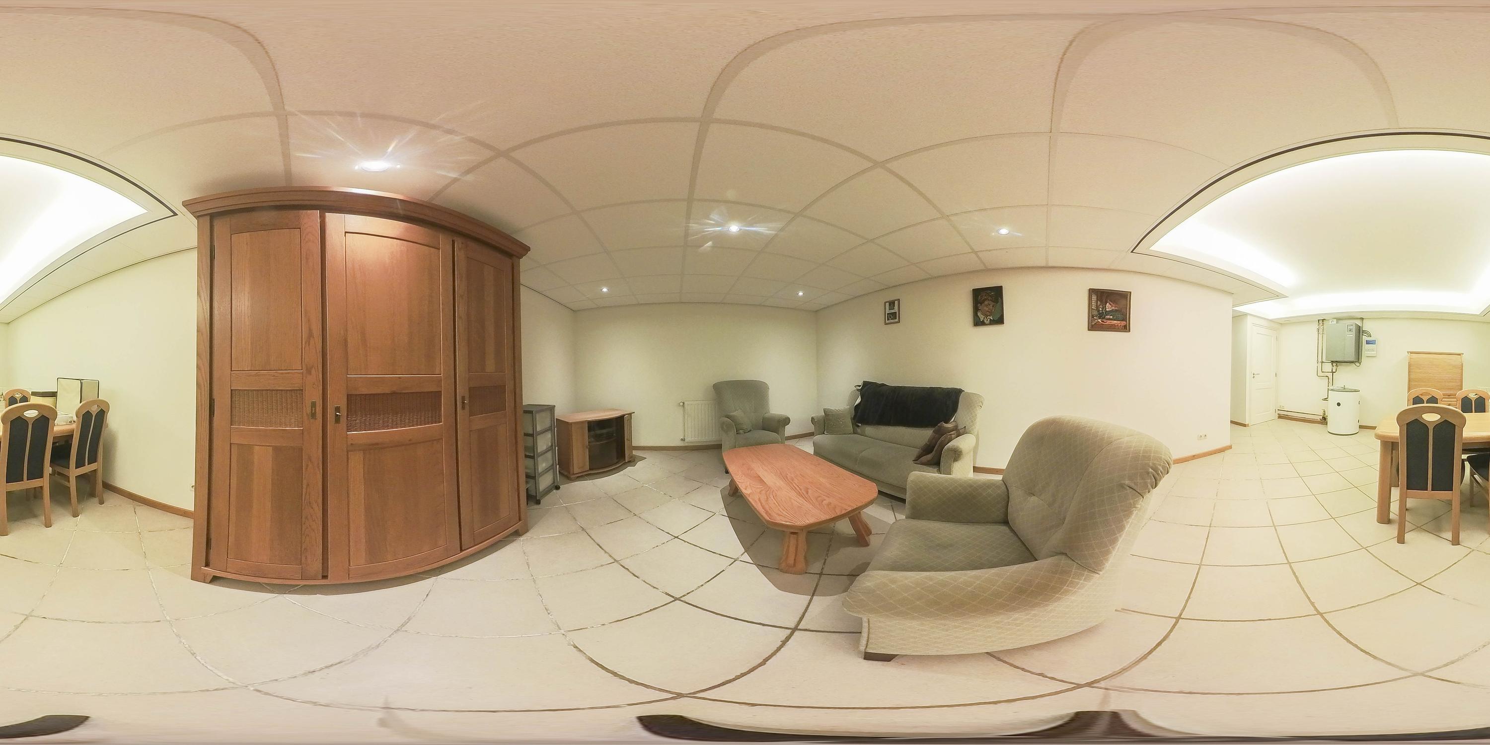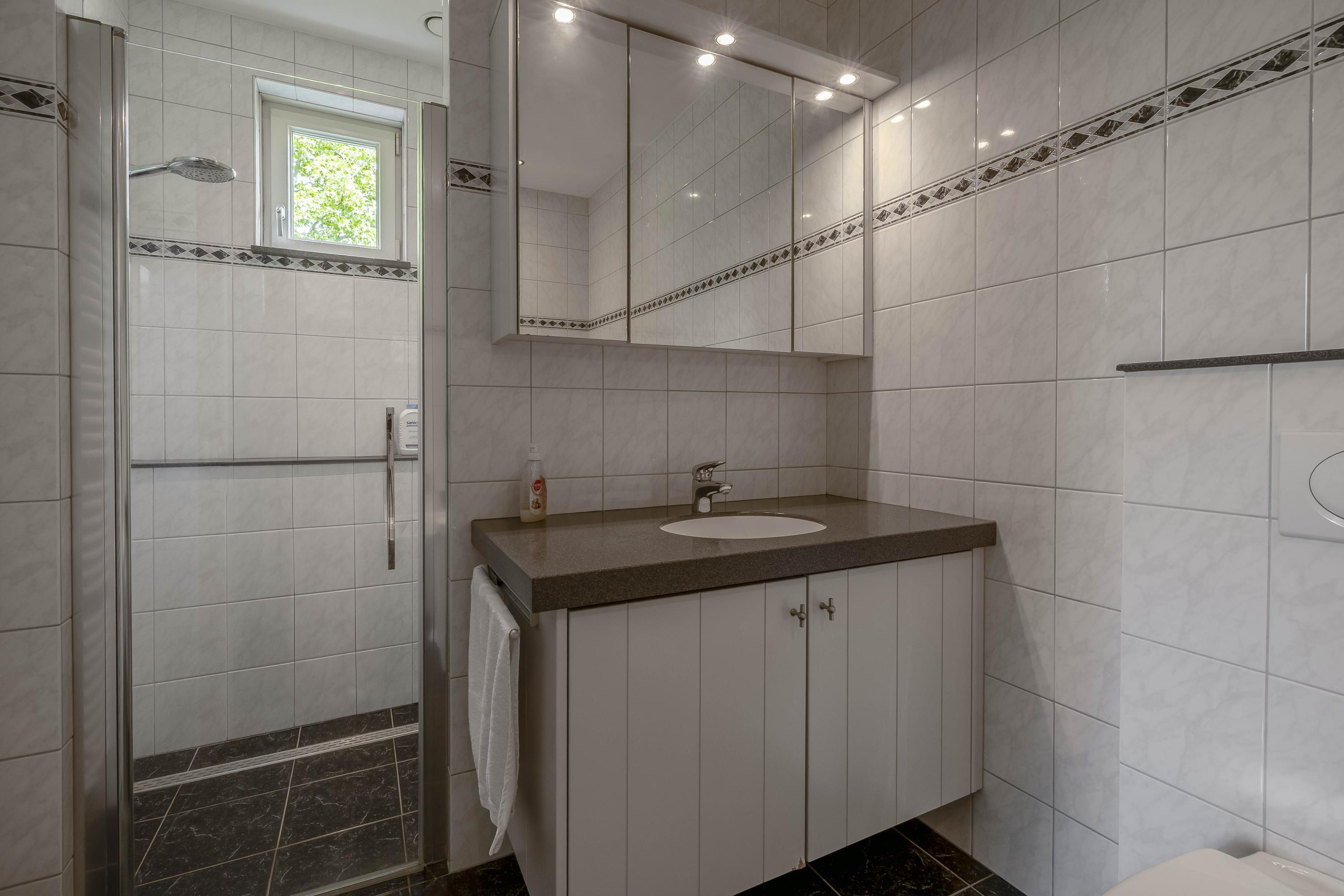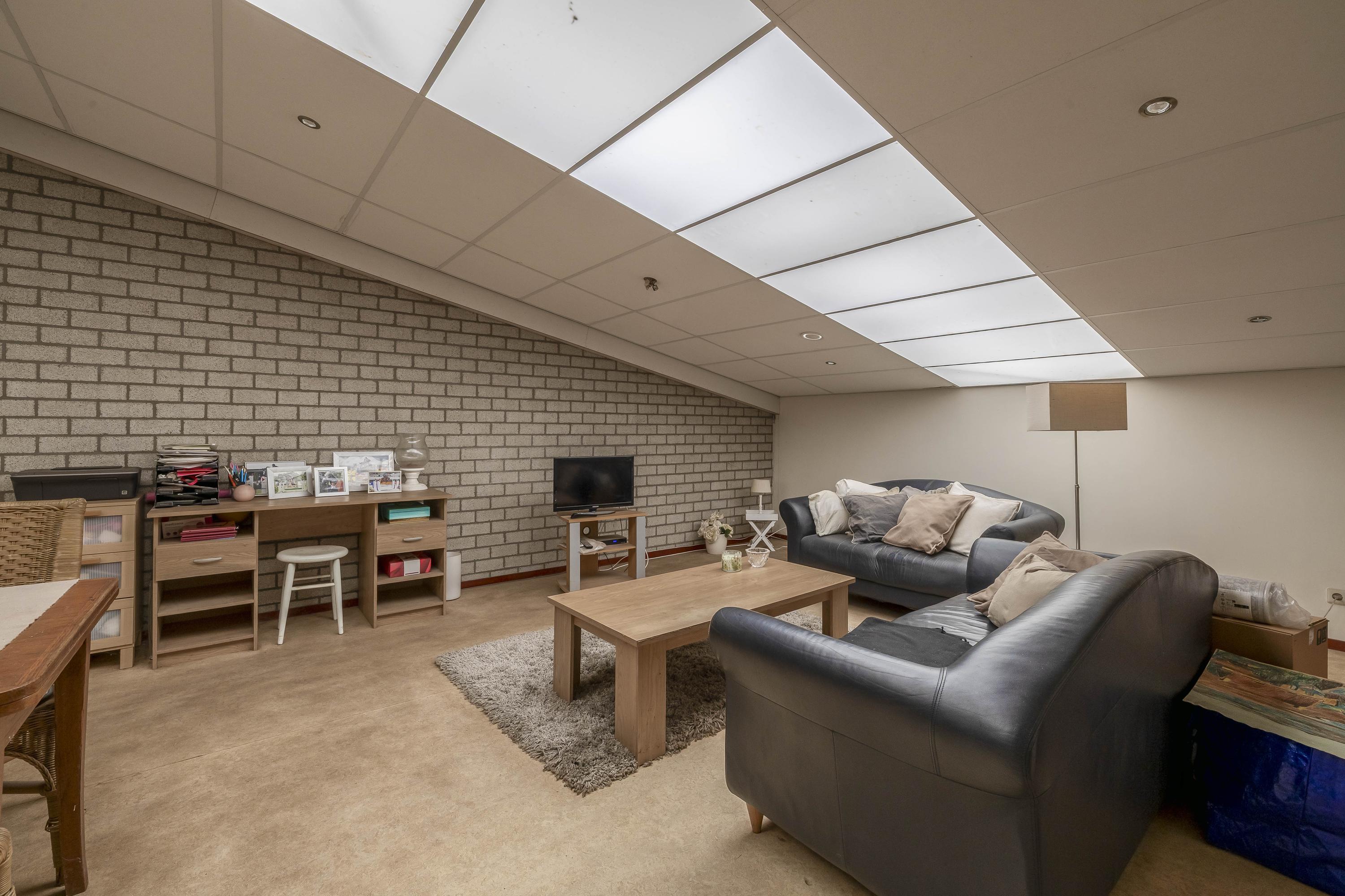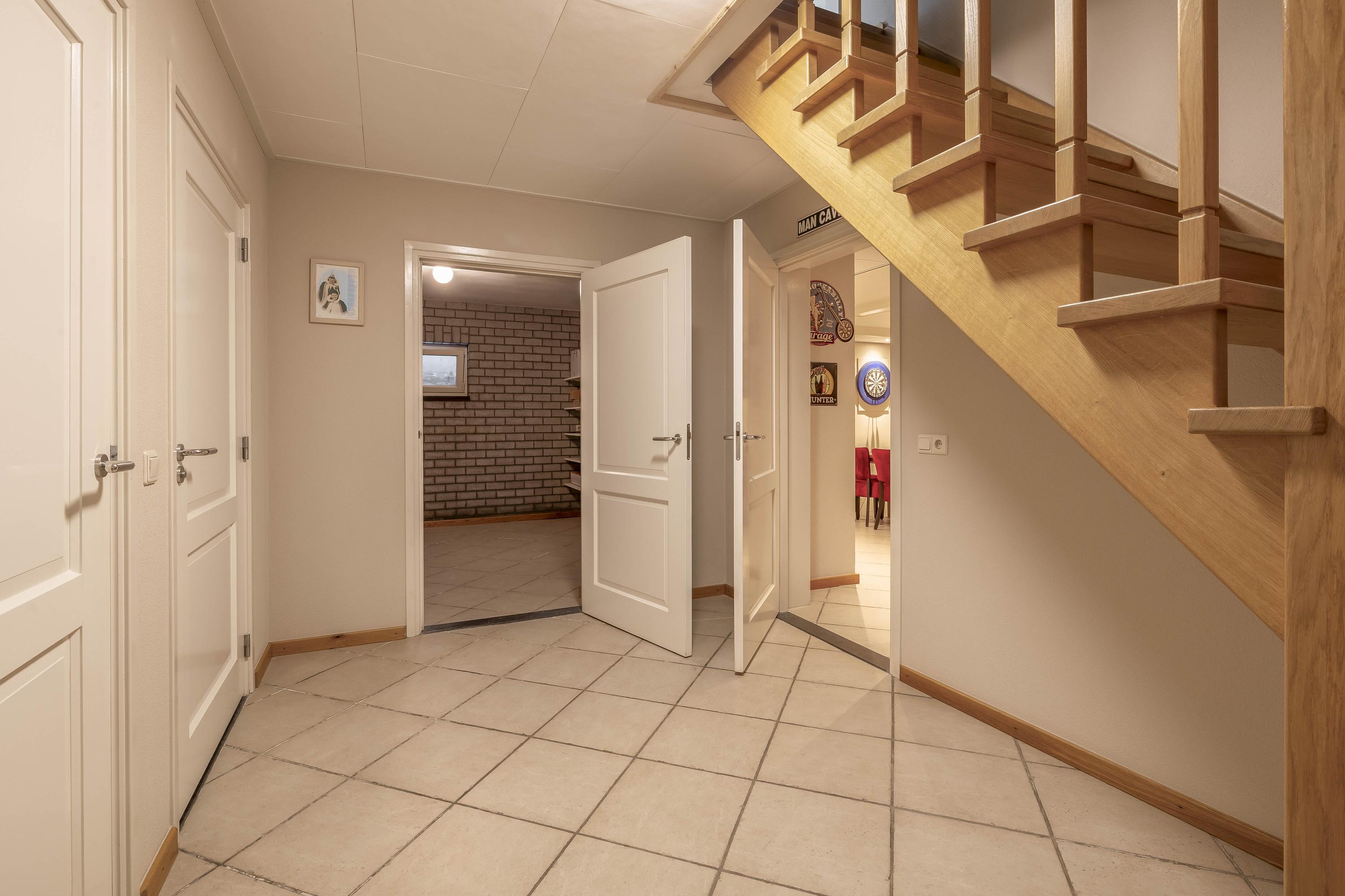 A fixed staircase provides access to the basement under the house. This basement consists of several rooms, including a “man cave/café”, a playroom/chill-out room and a practical storage room. The versatility of these rooms offers countless possibilities and also provides a lot of extra living and storage space in the house. The man cave/café is finished with a tiled floor with underfloor heating, stucco walls and a ceiling that is partly fitted with a suspended ceiling and partly with stucco. The room is equipped with air conditioning, which adds to the comfort. This space is perfect for organising parties or cosy get-togethers. The playroom/chill-out room has a tiled floor with underfloor heating, spachtelputz walls and a stucco ceiling. This versatile space offers plenty of possibilities and can easily be converted for various other purposes, such as a hobby room, home office or gym. This room also houses the heat pump, fibre optic connection, meter cupboard with water softener and the unit for the underfloor heating. The spacious storage cellar has a tiled floor, brick walls and a stucco ceiling. Practical shelves provide storage space. The toilet is fully tiled and equipped with a toilet (Sanibroyeur) and a washbasin.