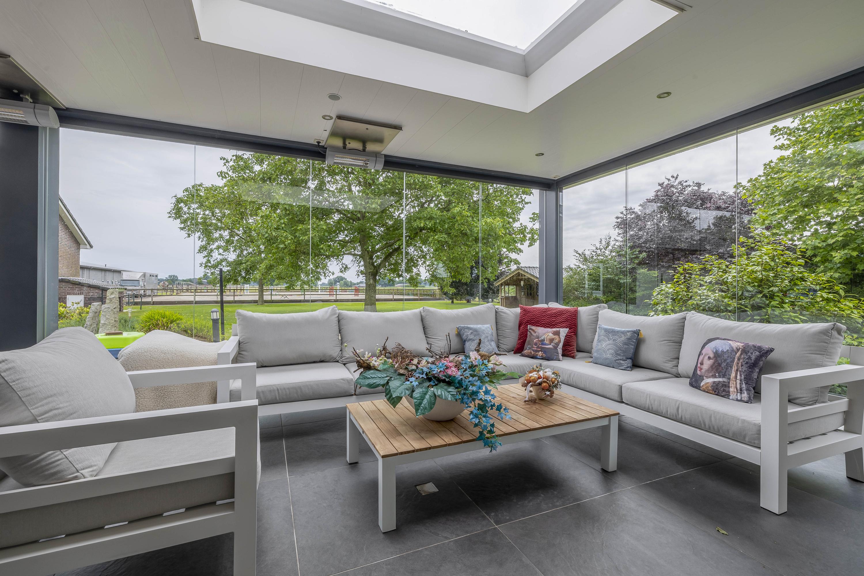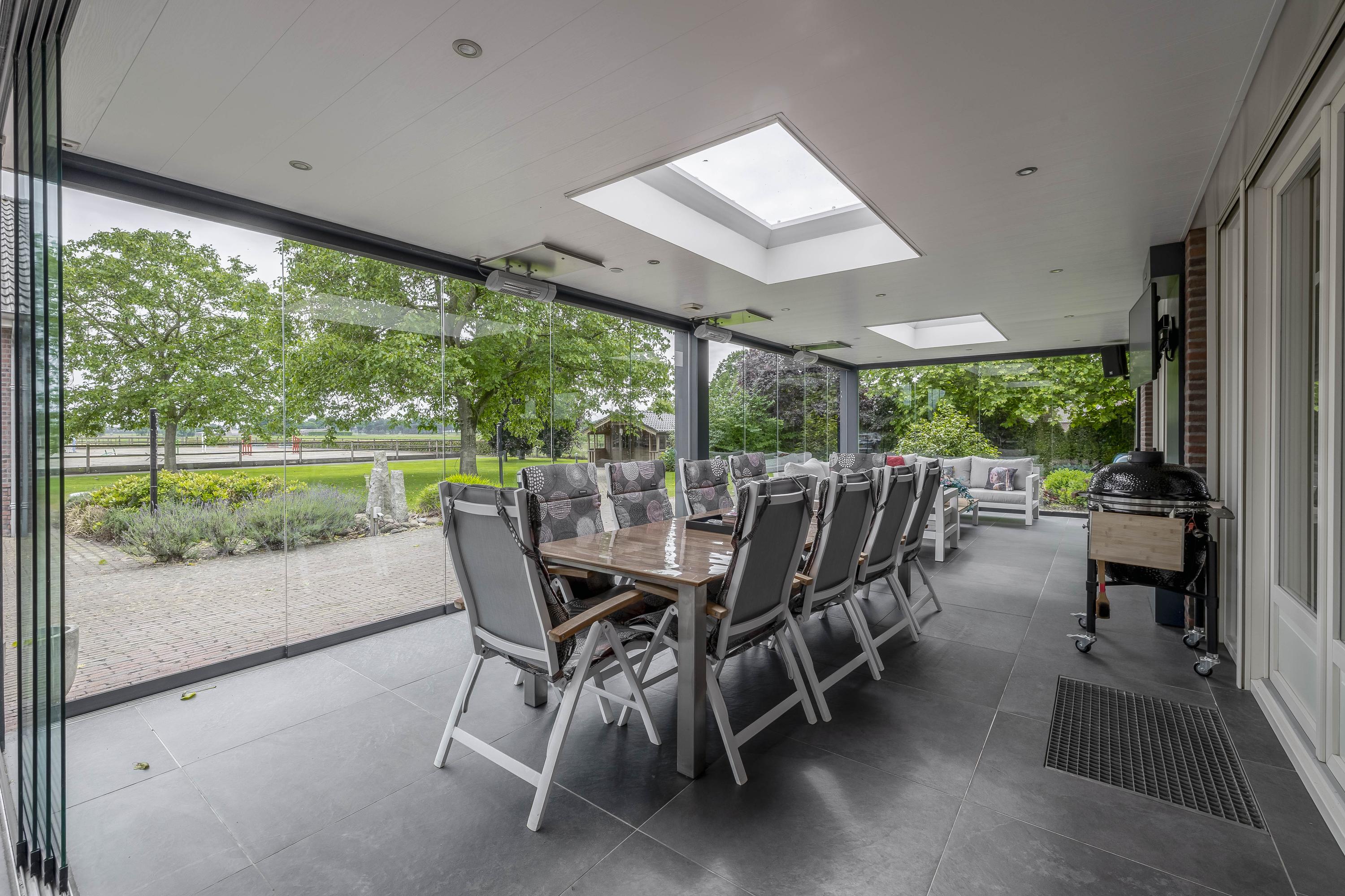 The garden has a spacious covered terrace with sliding glass walls, so you can enjoy the outdoors all year round. From the terrace, you have a beautiful view of the garden and even the outdoor track. There is also a garden shed, a large lawn and various mature trees and shrubs. For extra convenience, the garden has a sprinkler system.