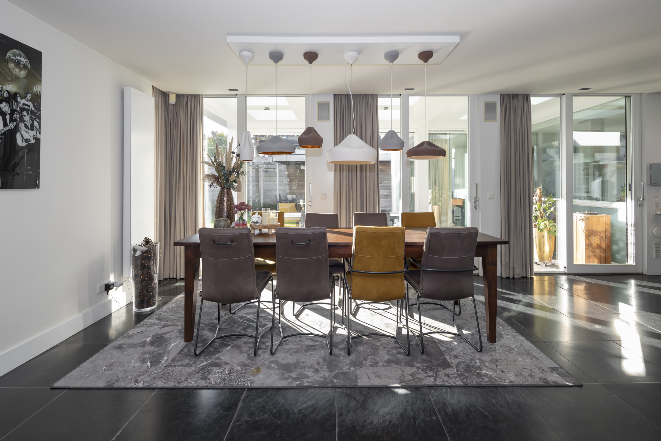 The front door is located on the side of the house, from which you enter the hallway. In this beautiful hall, where the meter cupboard, the toilet room, and the stairs to the first floor are located, you enter the living room through a beautiful glass pivot door.
