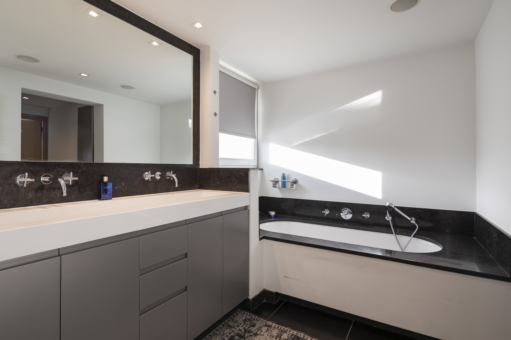 The modern bathroom is fully equipped, neatly tiled, has natural daylight, and underfloor heating. It features a double sink, a comfortable bathtub, and a spacious walk-in shower. The separate toilet is accessible from the landing.