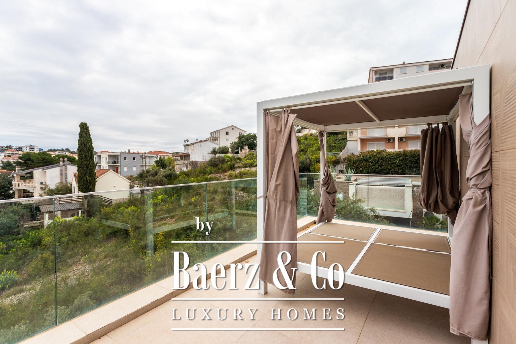 Three dedicated outdoor parking spaces and an environment enriched with Mediterranean plants underscore the villa’s effortless elegance. Air conditioning and underfloor heating throughout further elevate comfort. Proximity to Okrug’s center and the beach ensures easy access while preserving privacy. Villa Okrug with panoramic view invites refined living, just moments from the Adriatic shore.